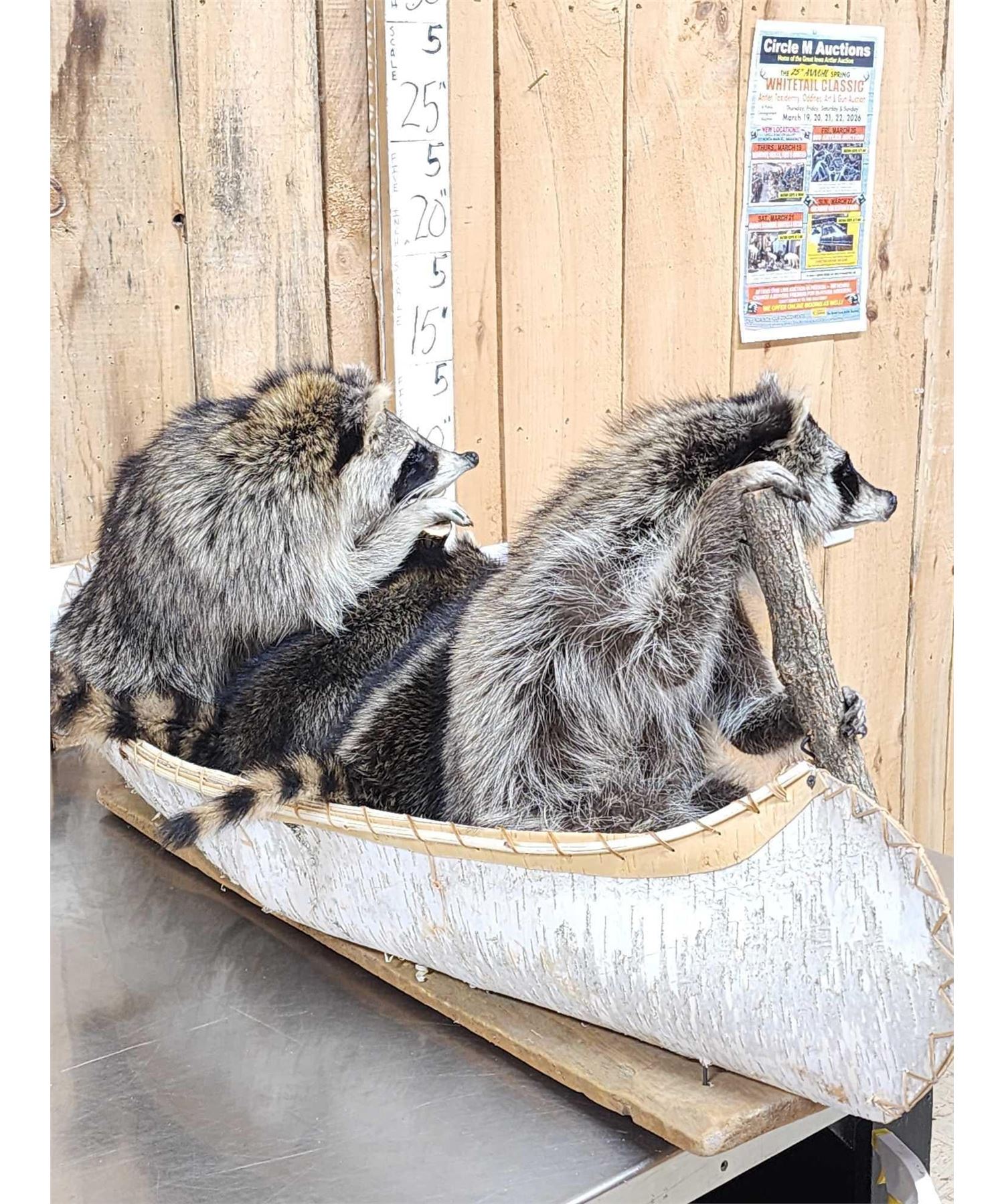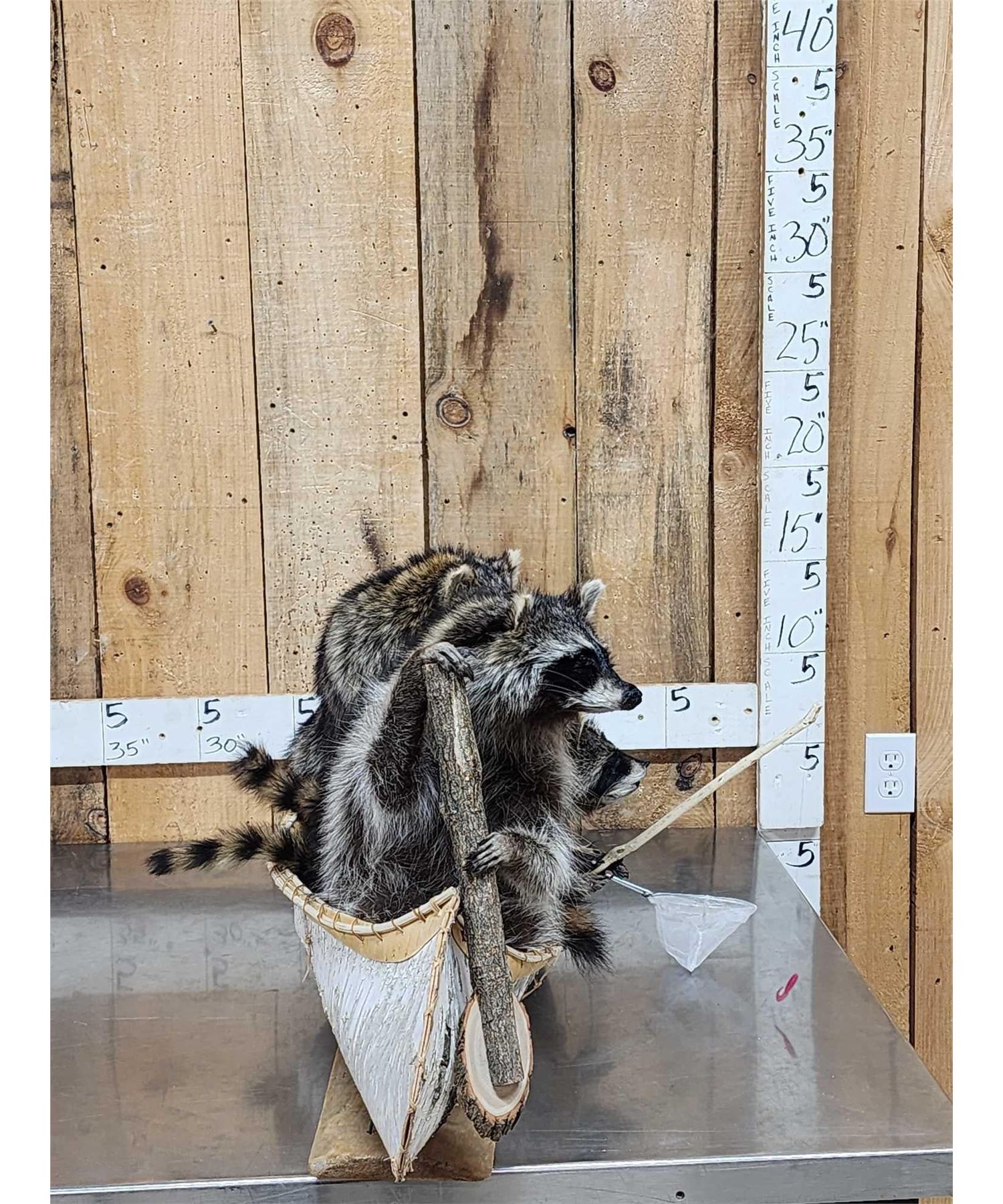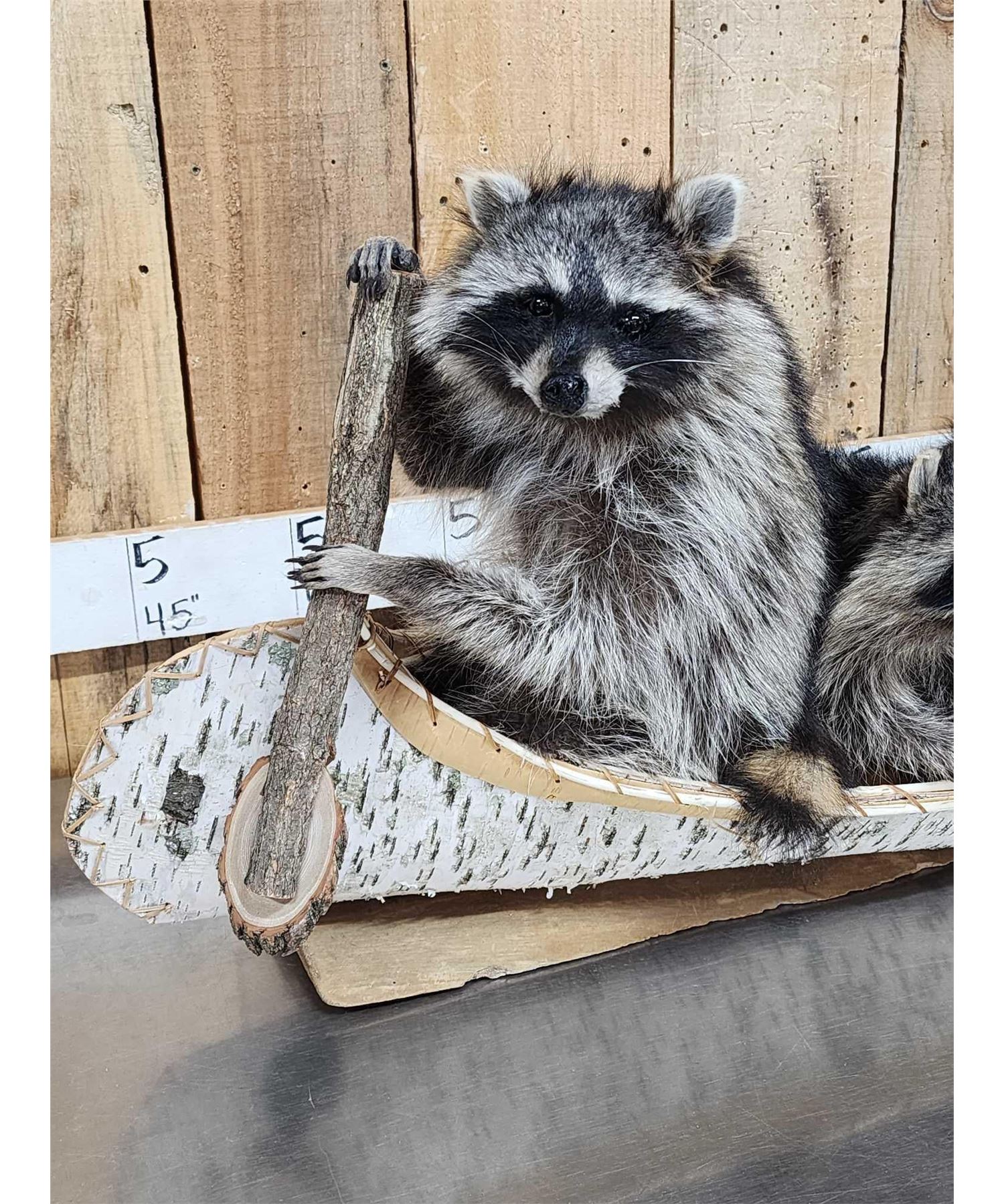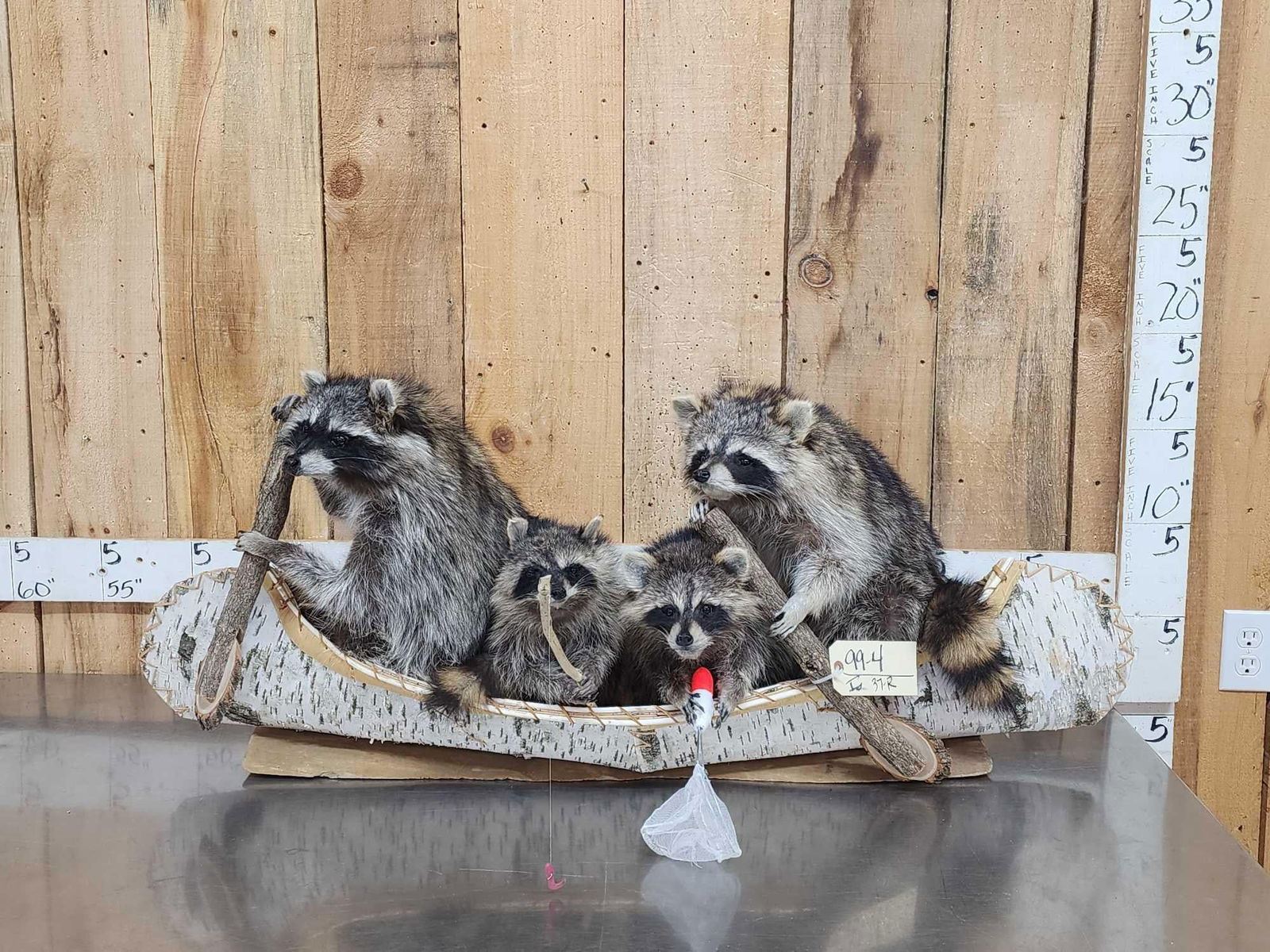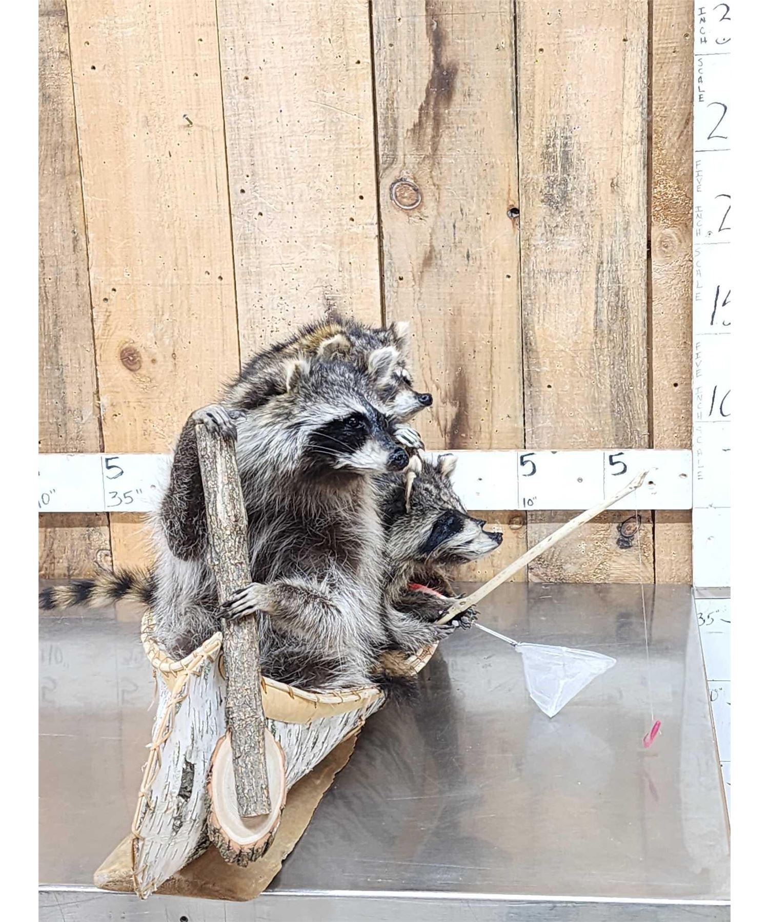 Lot 37R Family Of Raccoons Fishing In A Birch Bark Canoe Taxidermy
