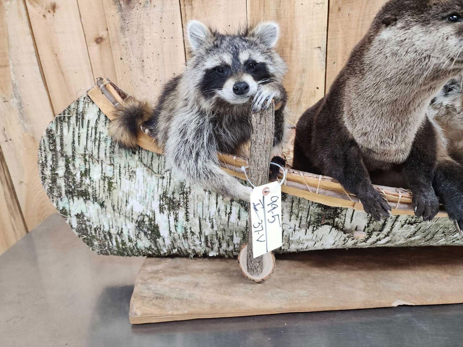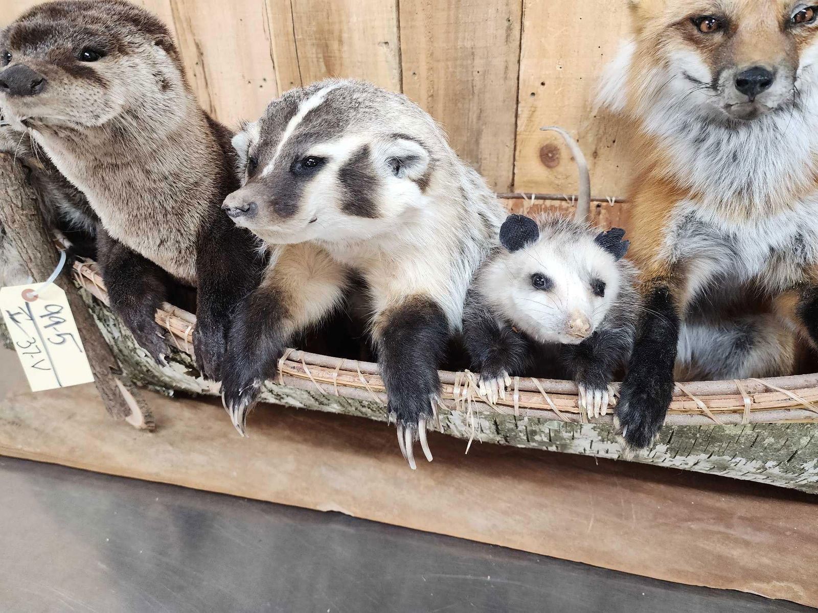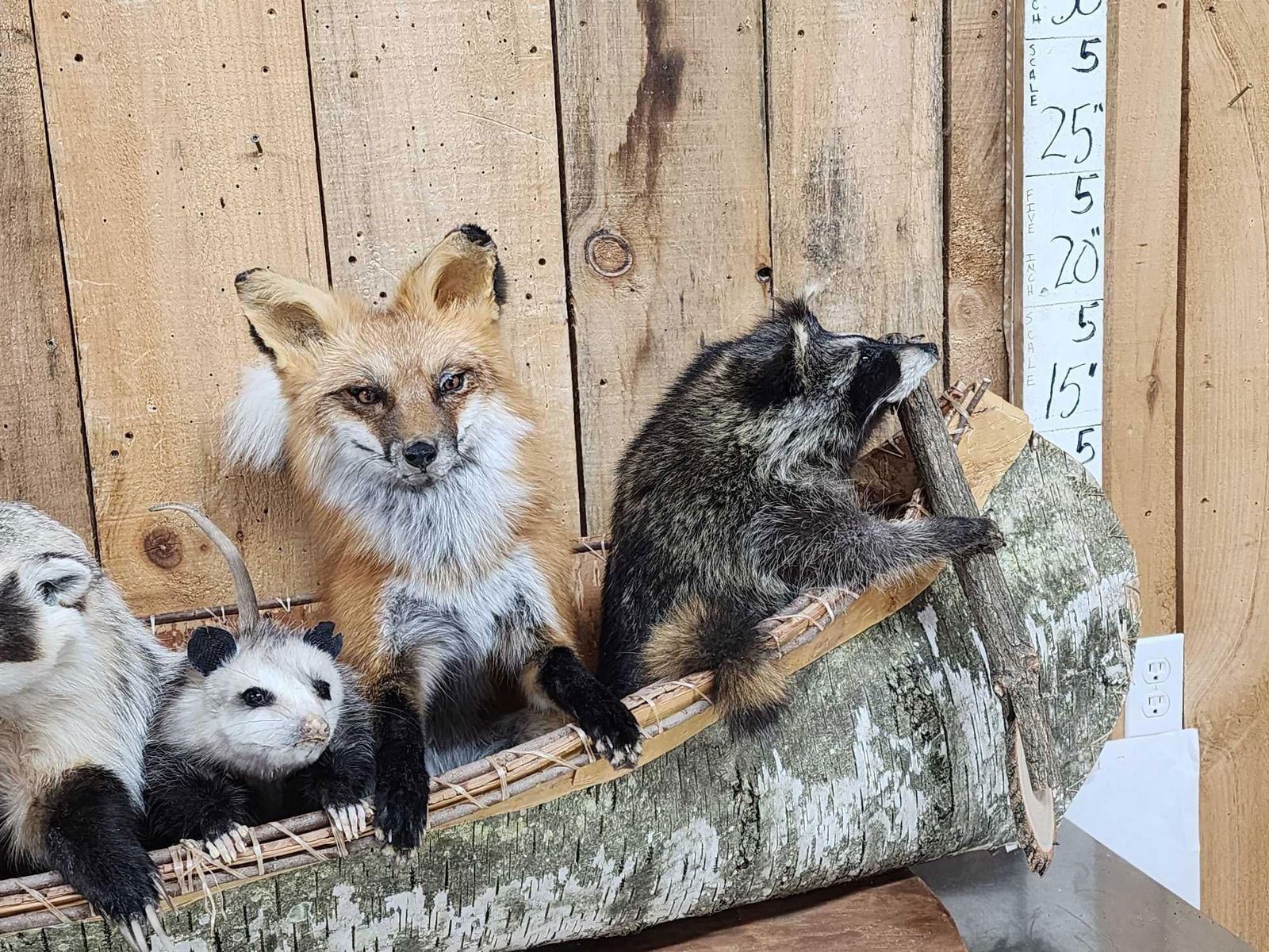 99.5 Brand new mount featuring 2 Raccoons Otter Badger Opossum Red Fox floating down the river in a 70" long Canoe cute factor is HIGH!