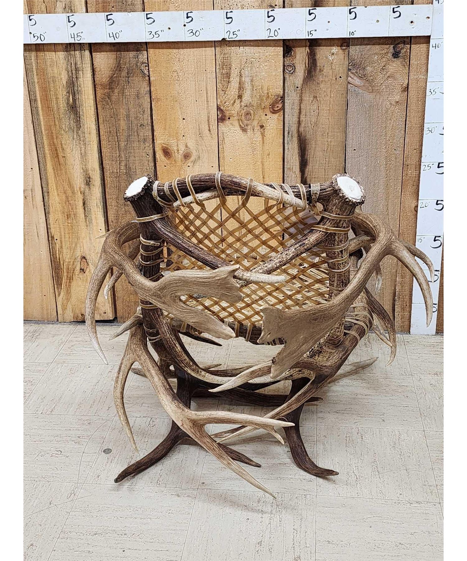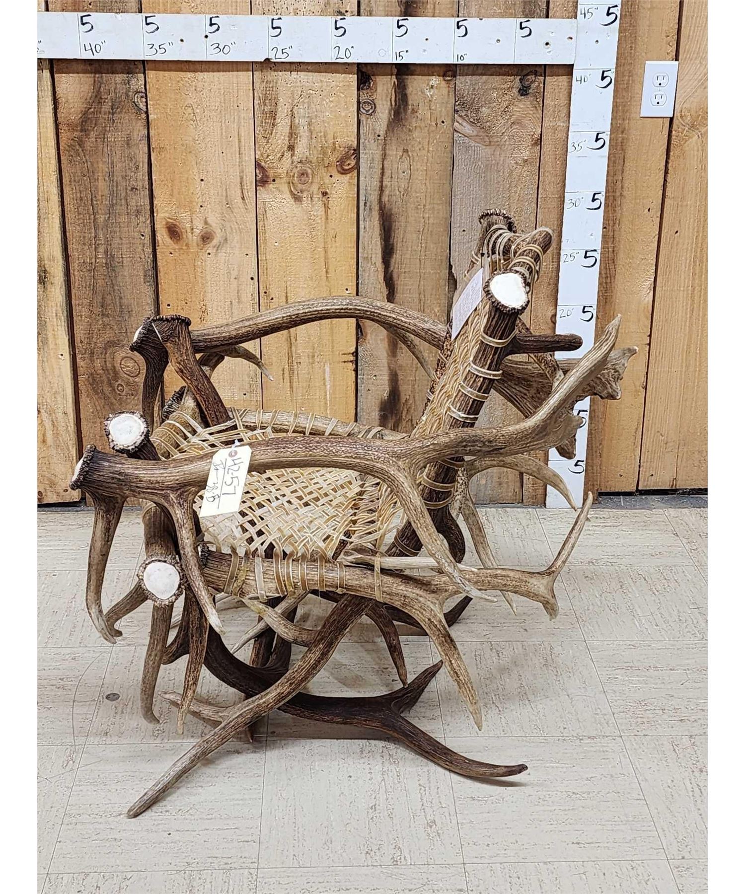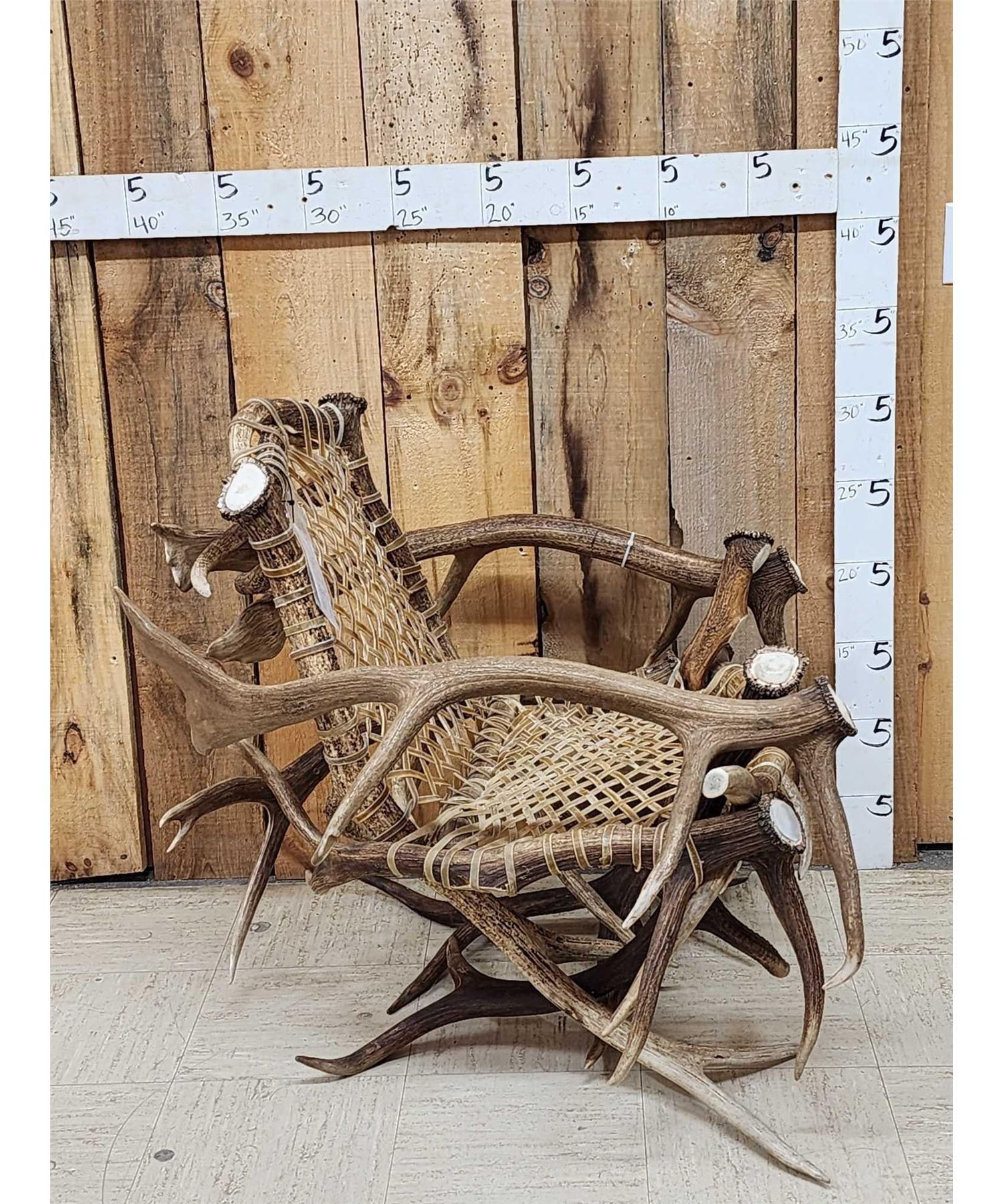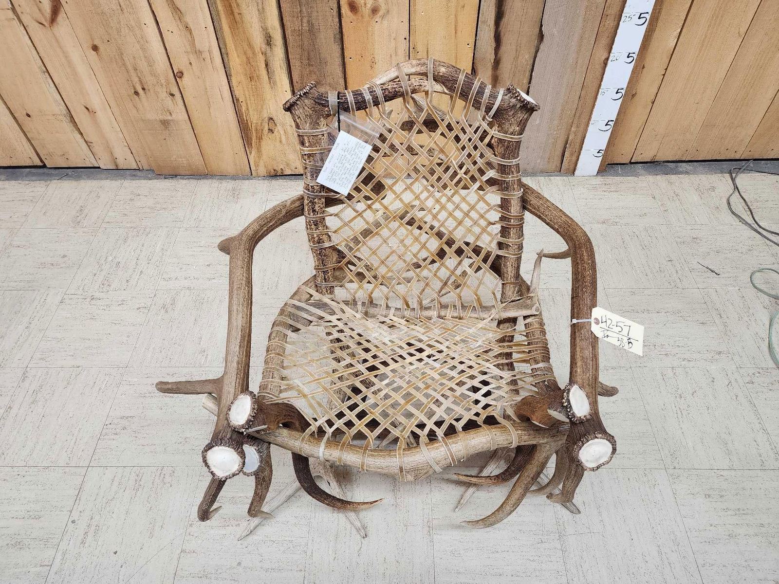 42.57 Hand crafted in Jackson Hole Wyoming from all natural Elk Shed Antlers picked up by the Boy Scouts for the yearly Elk Fest . The chair sits quite comfortably with natural Rawhide caning .A very attractive functional piece !