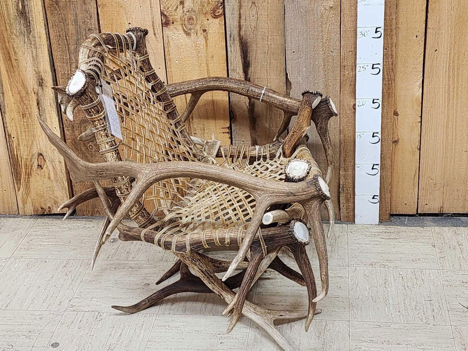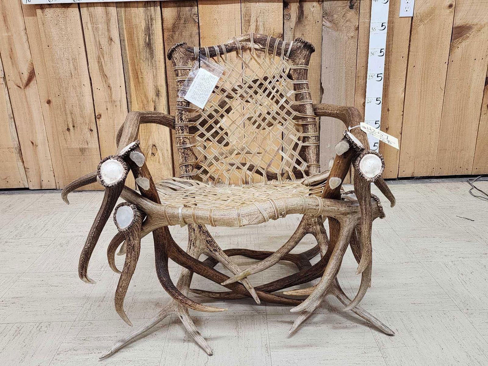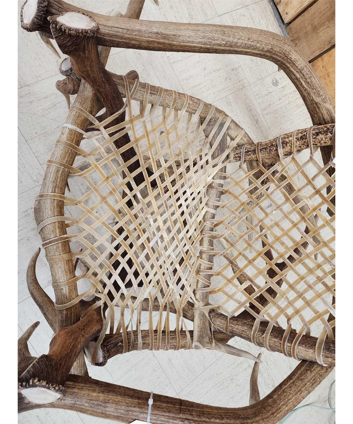 42.57 Hand crafted in Jackson Hole Wyoming from all natural Elk Shed Antlers picked up by the Boy Scouts for the yearly Elk Fest . The chair sits quite comfortably with natural Rawhide caning .A very attractive functional piece !