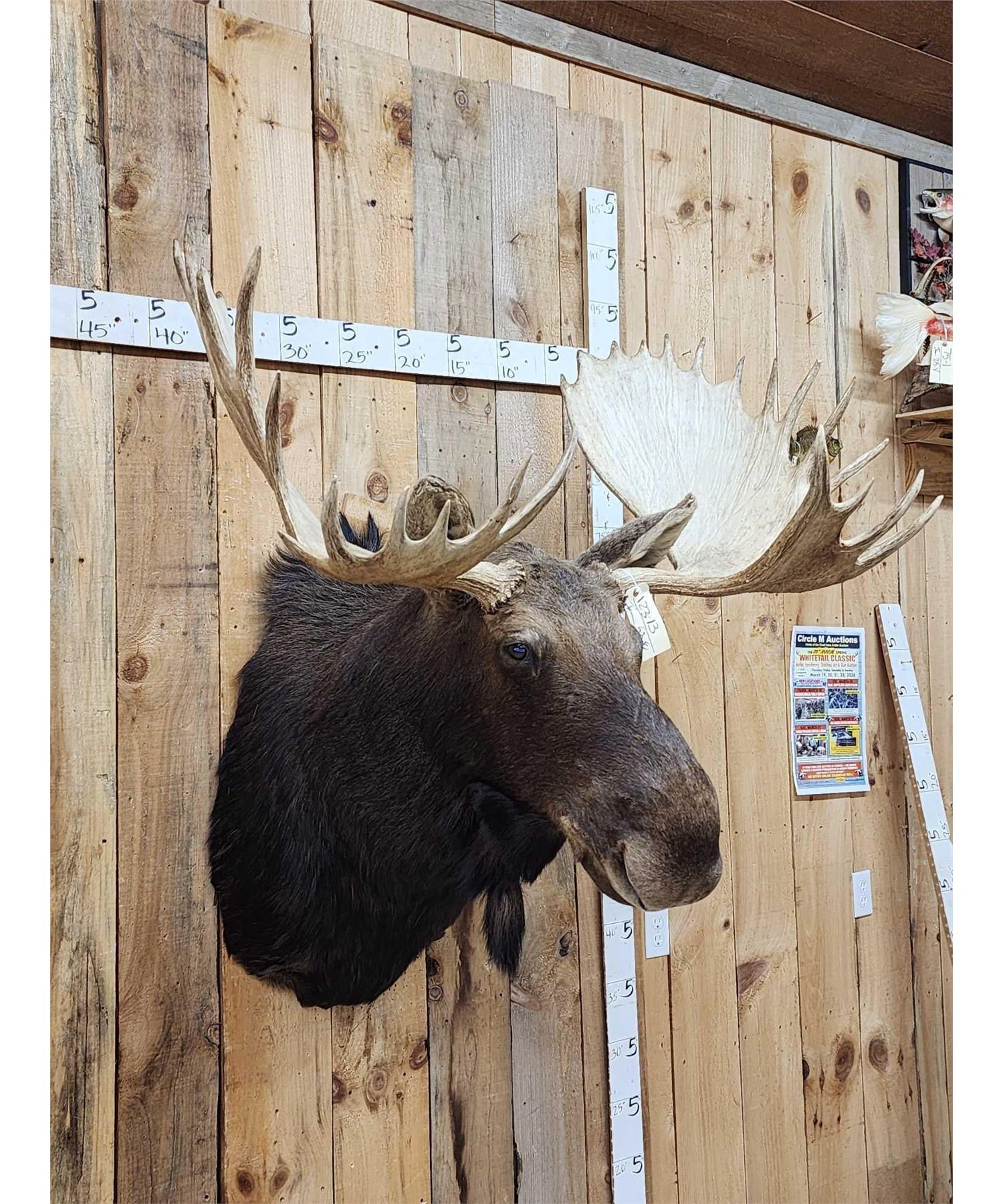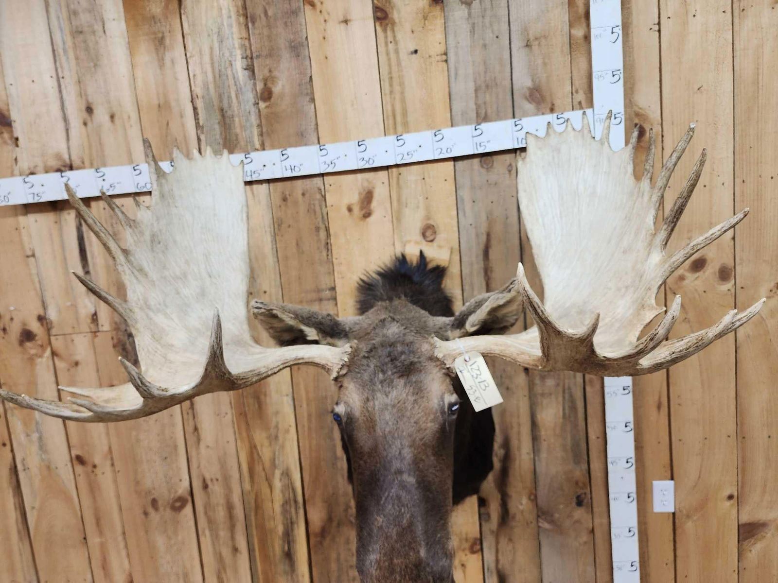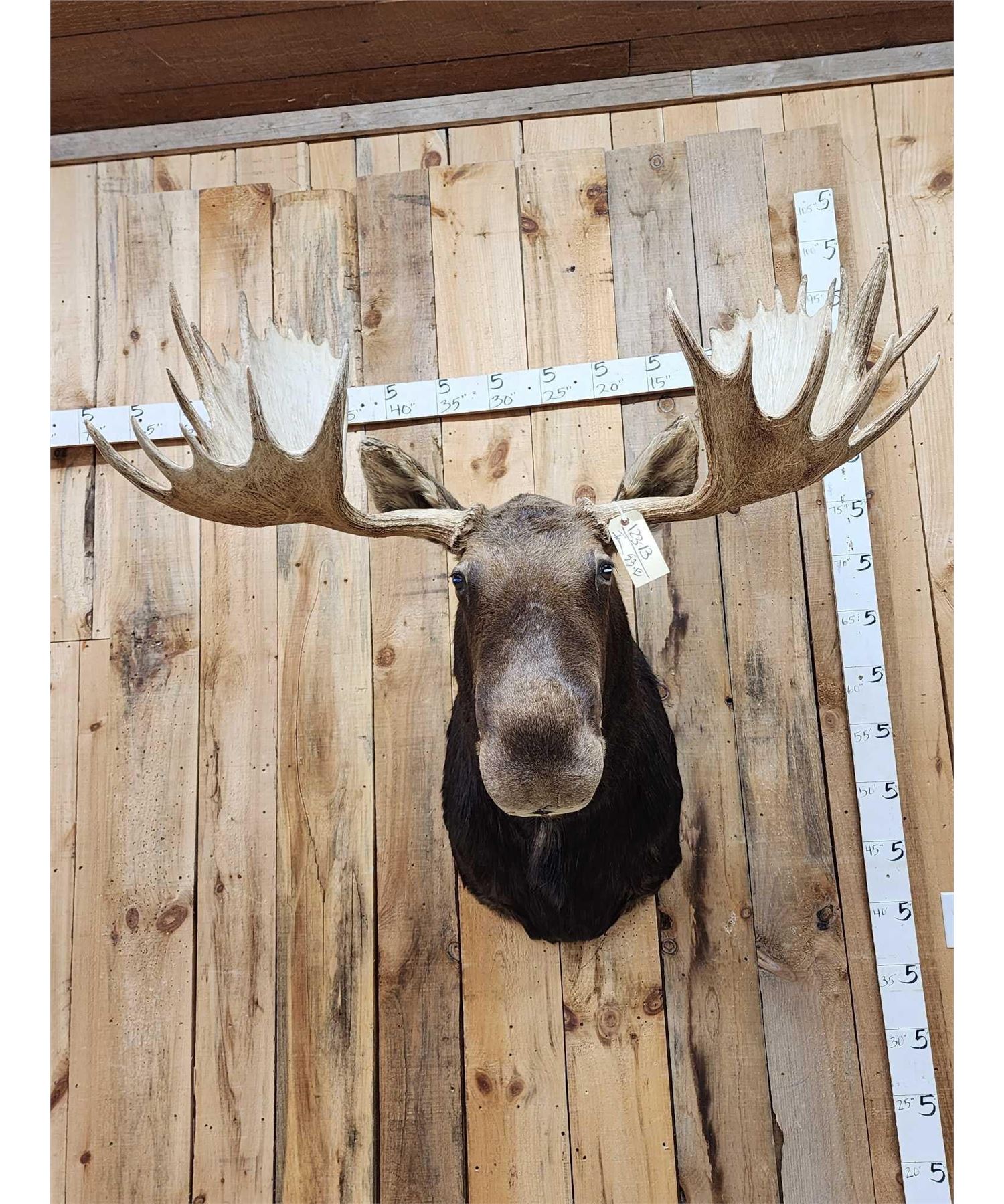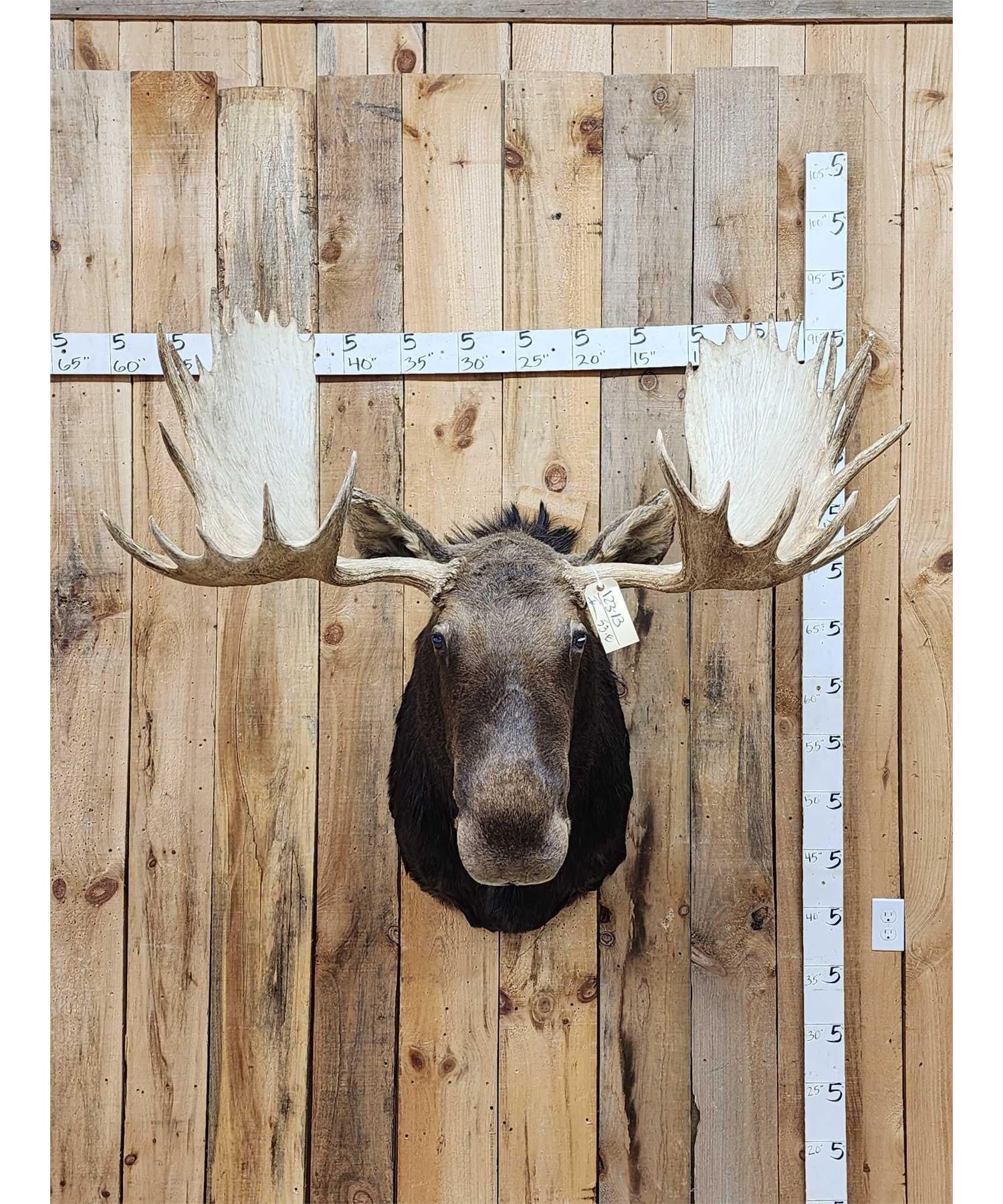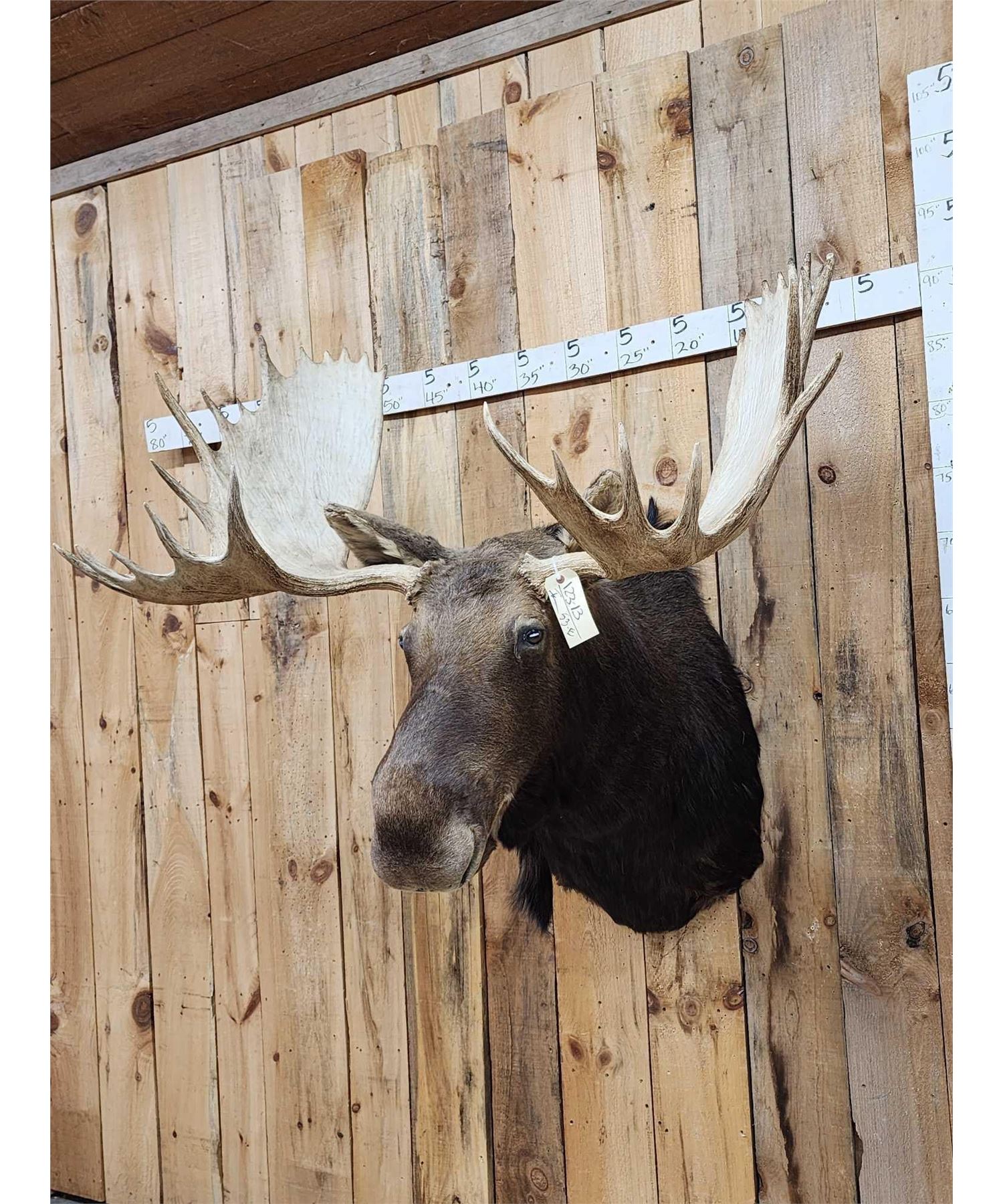 123.13 This MONSTER is officially Scored in the all time book ! When it was harvested it was #1 in the all time book for a Shiras Moose that was harvested by a woman hunter nice clean mount with a 48 2/8" wide antler spread comes with TONS of provenance