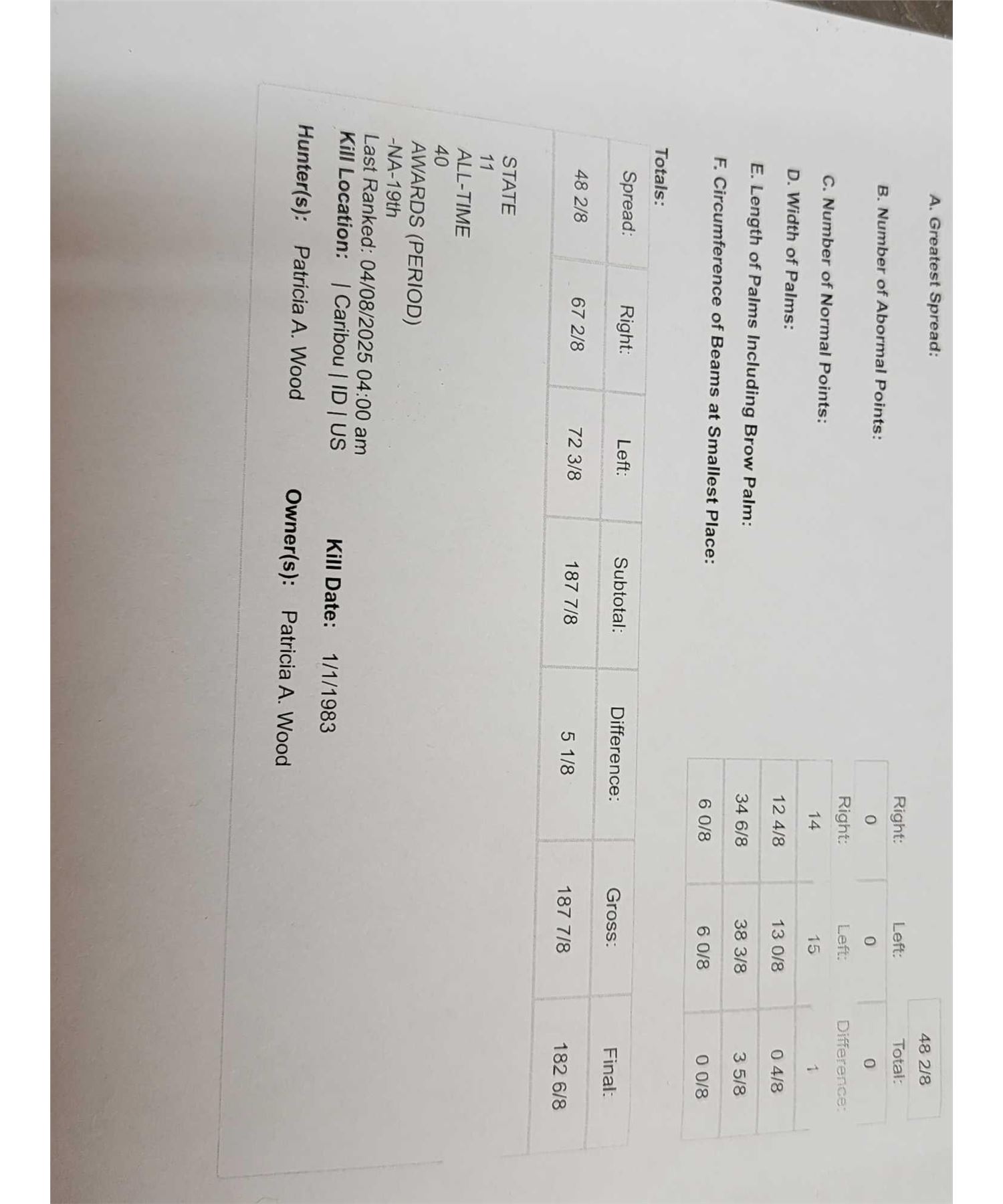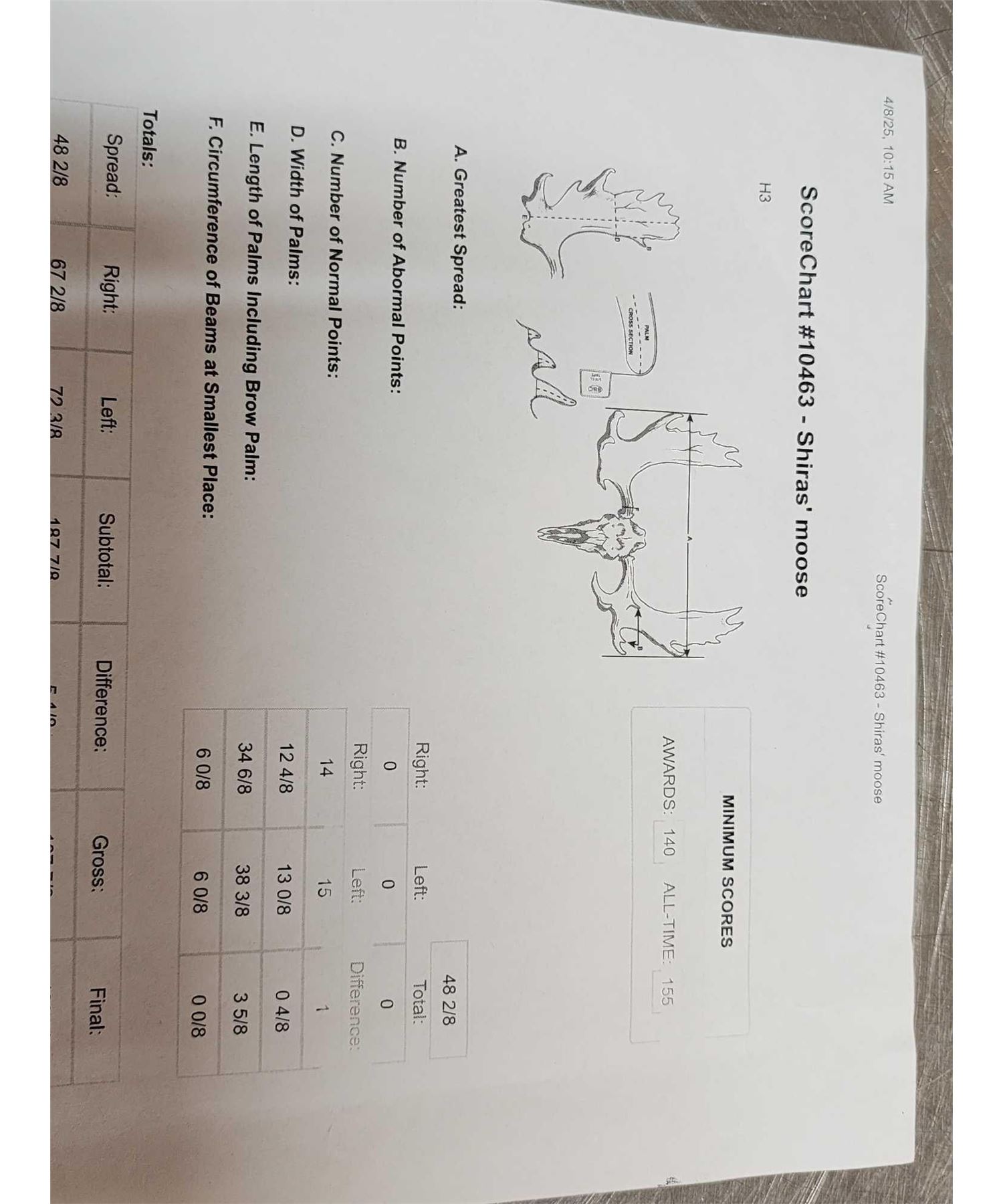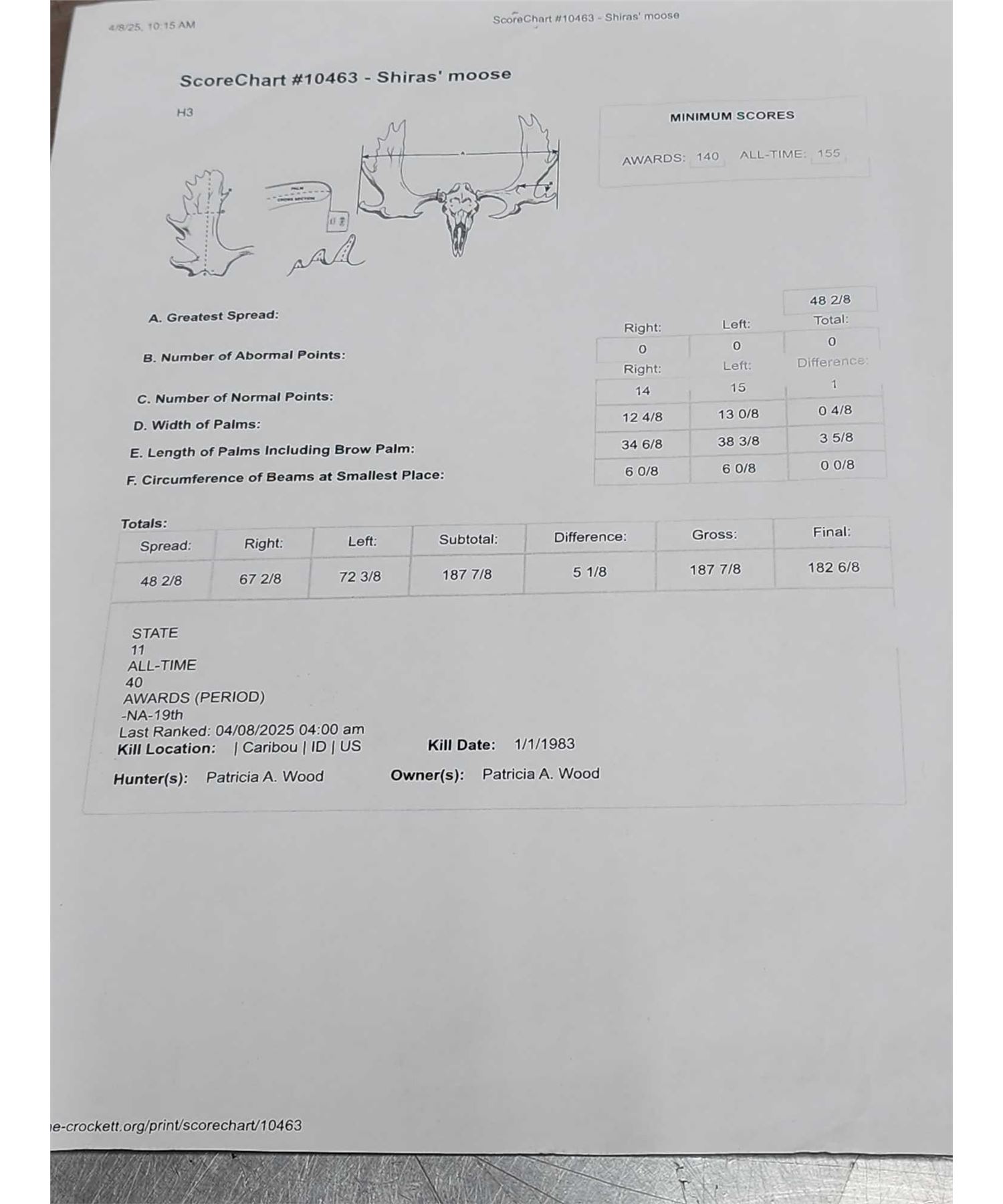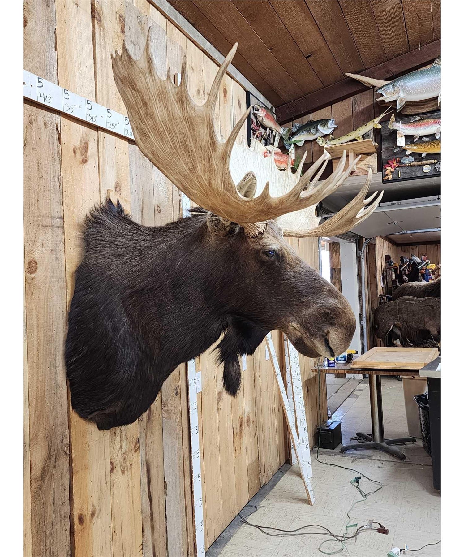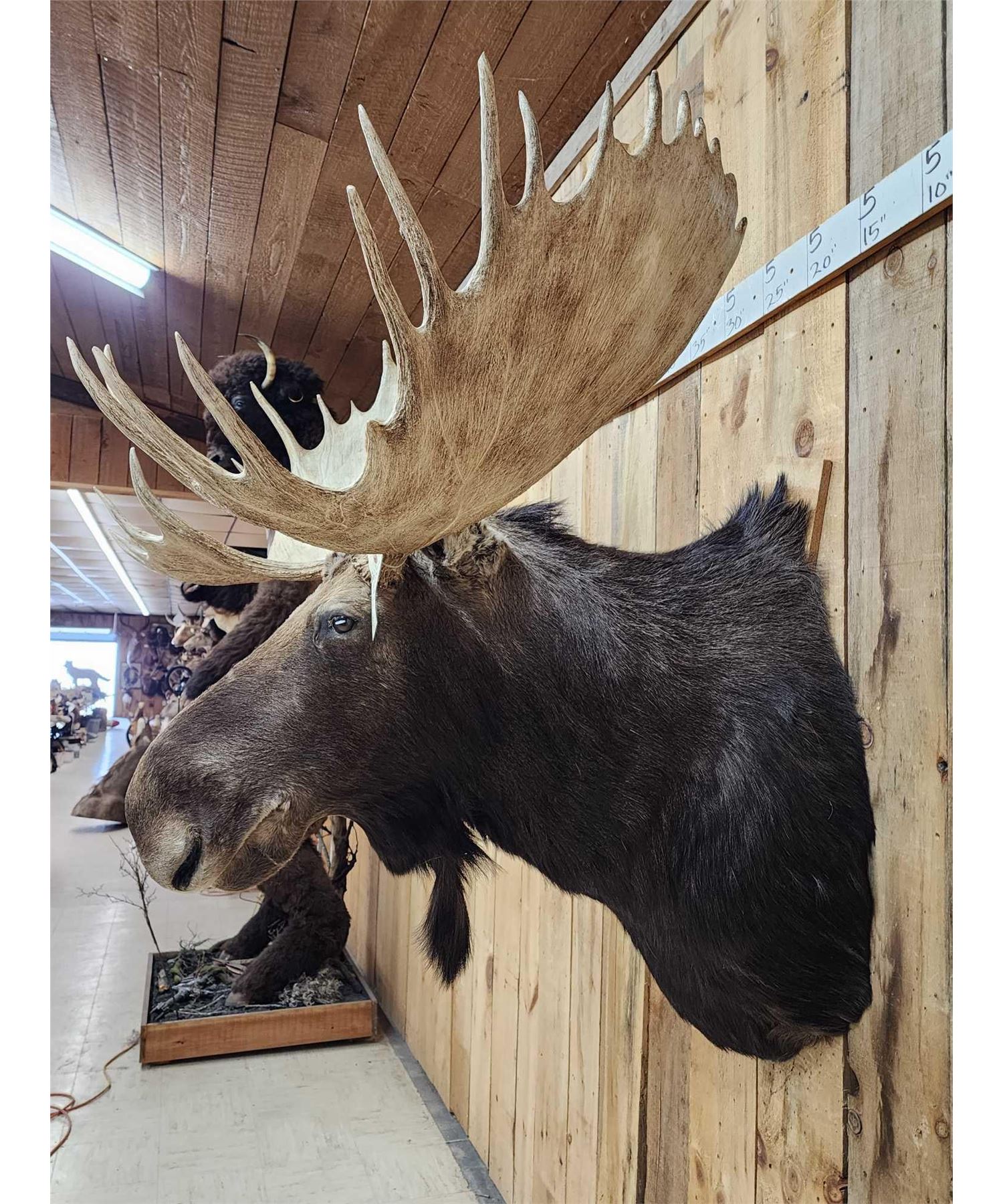 123.13 This MONSTER is officially Scored in the all time book ! When it was harvested it was #1 in the all time book for a Shiras Moose that was harvested by a woman hunter nice clean mount with a 48 2/8" wide antler spread comes with TONS of provenance