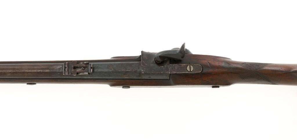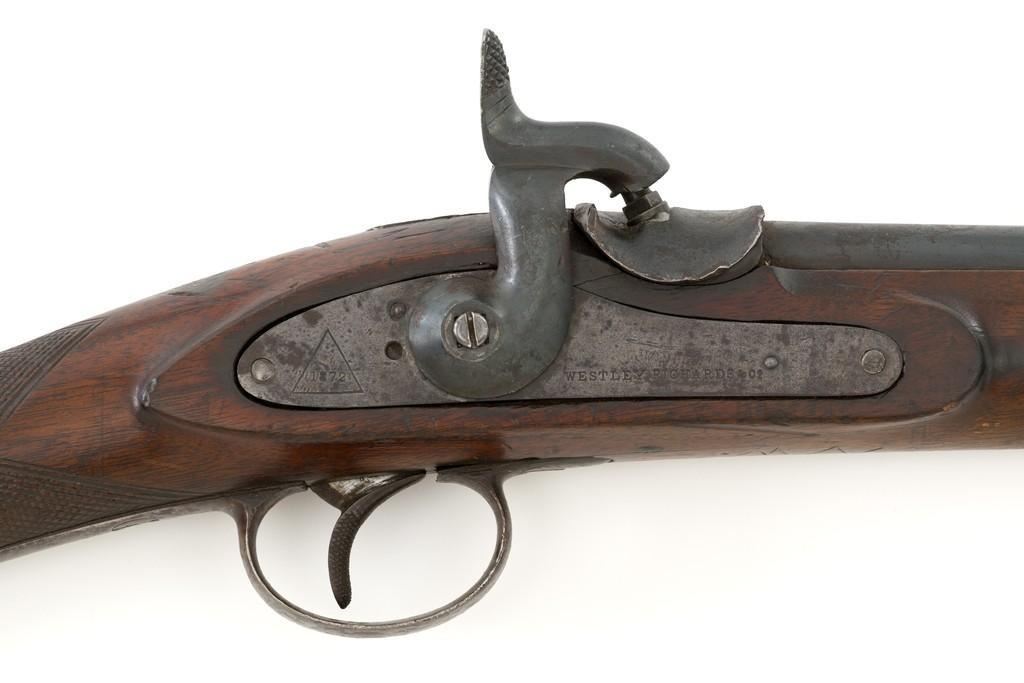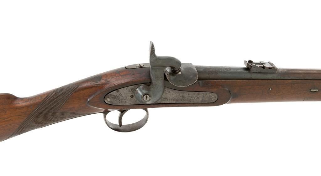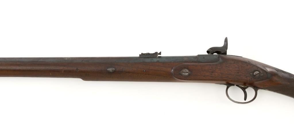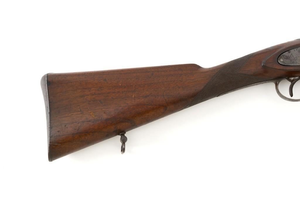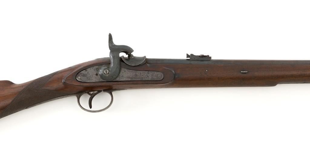 Westley Richards & Co. Percussion Rifled Carbine, .50 cal., 26.4" round barrel; walnut stock with single barrel key, raised apron on left side, with flat nails, line, and diamond engraved checkering on wrist. Low-profile blade front sight and adjustable folding leaf rear sight with wide "V"-notch, graduated to 400 yards. Trigger also has diamond engraving. The rammer is missing from under the barrel. Lockplate marked "WESTLEY RICHARDS & Co" and "1872" inside a triangle. Left side barrel is stamped with proof and inspection marks. Condition overall is good, metal toned to a dark brown color; spots of patina to the lockplate, barrel, and barrel band. The nipple and hammer are very good. Barrel tang screw appears to be a modern replacement. Wood is very good, showing expected handling marks and impressions to the dark finish. There are a few newer handling marks to the buttstock. Hammer operates smoothly; lock holds in the half and full cock position. Bore rates as fair with surface rust and visible rifling. Est.: $700-$1,000. (Antique)