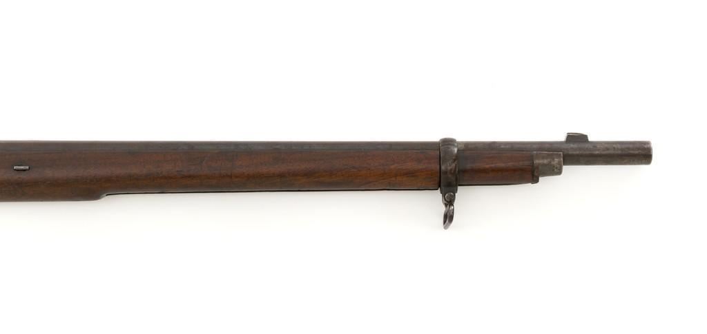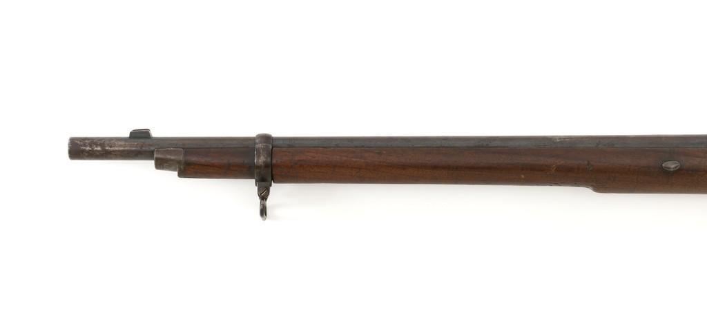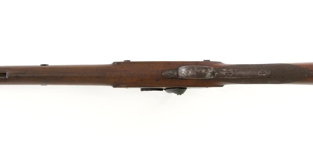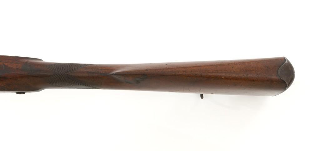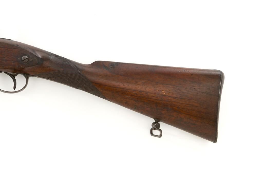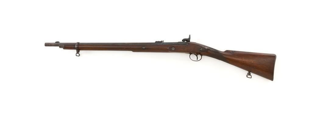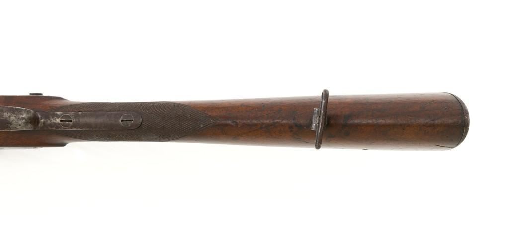 Westley Richards & Co. Percussion Rifled Carbine, .50 cal., 26.4" round barrel; walnut stock with single barrel key, raised apron on left side, with flat nails, line, and diamond engraved checkering on wrist. Low-profile blade front sight and adjustable folding leaf rear sight with wide "V"-notch, graduated to 400 yards. Trigger also has diamond engraving. The rammer is missing from under the barrel. Lockplate marked "WESTLEY RICHARDS & Co" and "1872" inside a triangle. Left side barrel is stamped with proof and inspection marks. Condition overall is good, metal toned to a dark brown color; spots of patina to the lockplate, barrel, and barrel band. The nipple and hammer are very good. Barrel tang screw appears to be a modern replacement. Wood is very good, showing expected handling marks and impressions to the dark finish. There are a few newer handling marks to the buttstock. Hammer operates smoothly; lock holds in the half and full cock position. Bore rates as fair with surface rust and visible rifling. Est.: $700-$1,000. (Antique)