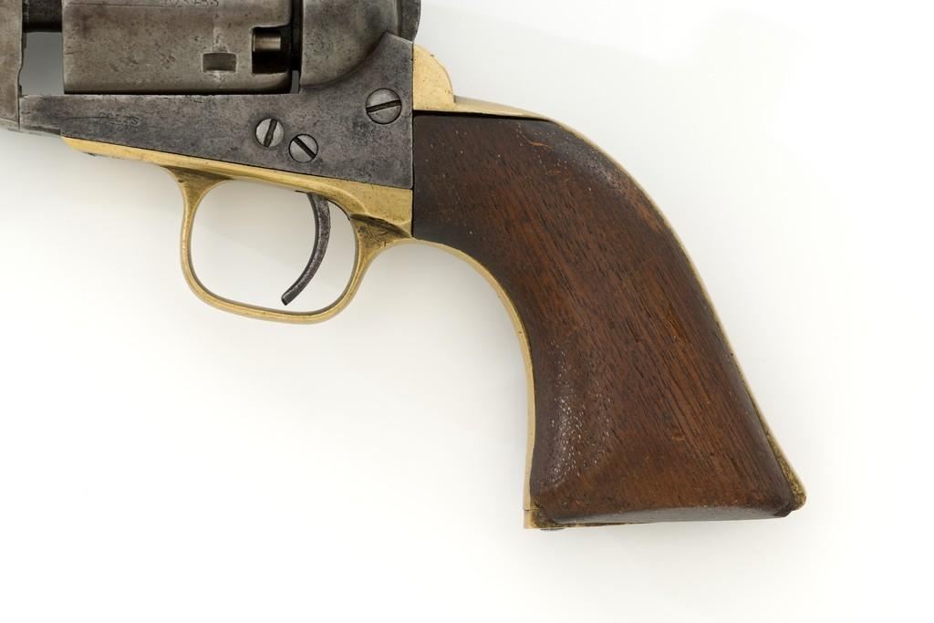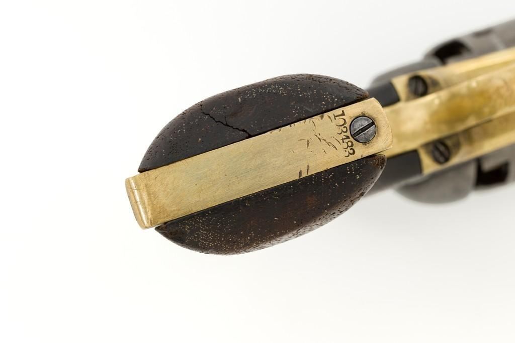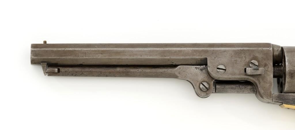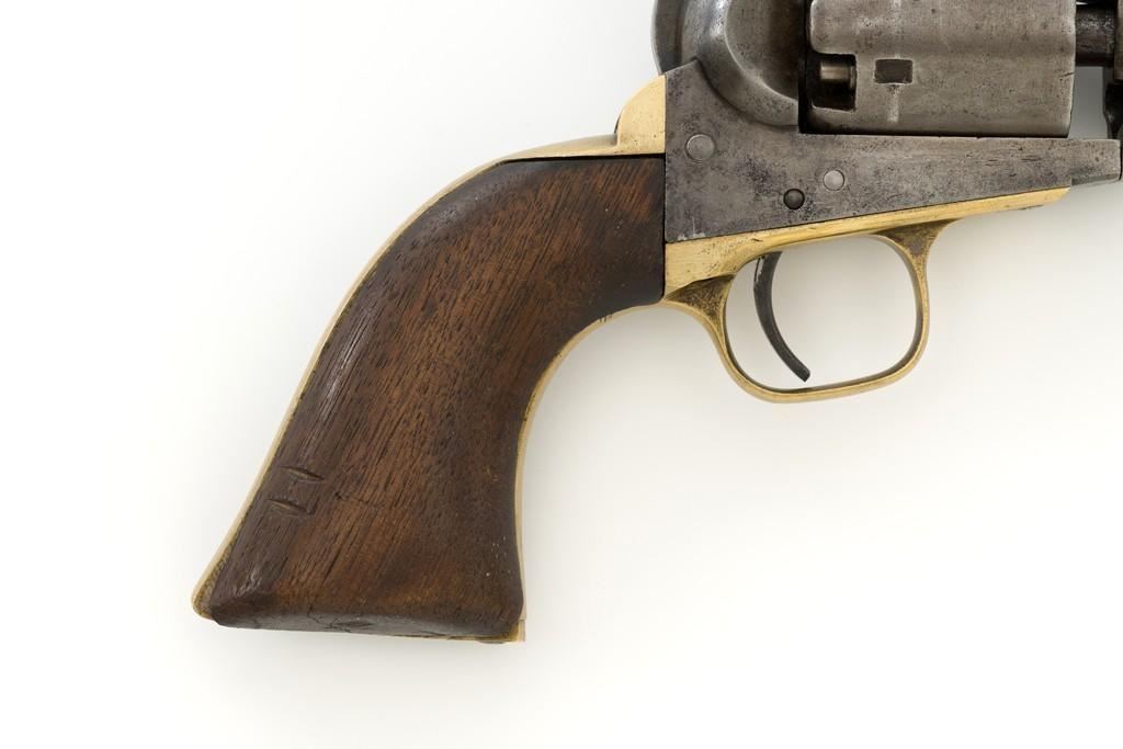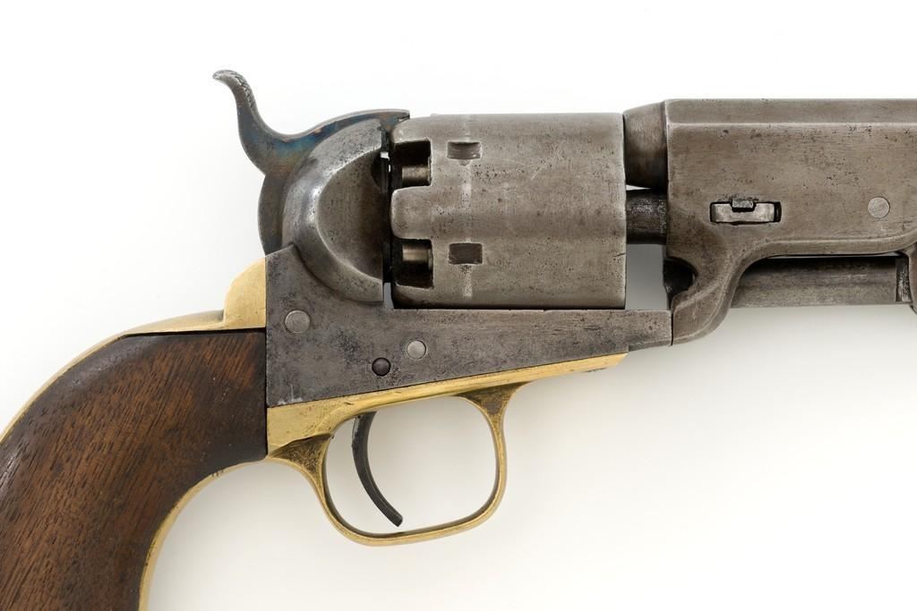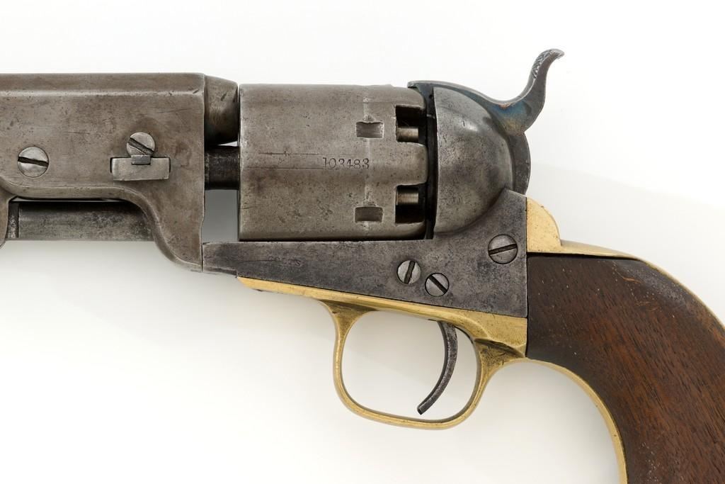 Colt Model 1851 Navy Percussion Revolver, #103483, .36 cal., 7.5'' octagon barrel, blue and case hardened finish, one-piece varnished walnut grips, brass front and fixed ''V''-notch rear sight. Serial numbers are matching, including the barrel wedge. Mfg'd 1861. Revolver is in overall good condition, displaying an even gray patina to the metal, with spots of moderate darkening and mild pitting to sides of the frame. Grips are very good, showing moderate handling wear, especially to the bottom left grip panel; both sides show shrinkage from age. Right side with two ''kill'' notches along the back edge. Factory markings are clear, except for the cylinder scene which has mostly worn away. Action is crisp but a little weak. Bore rates fair+ with visible rifling and scattered moderate erosion. Est.: $1,000-$1,500. (Antique)