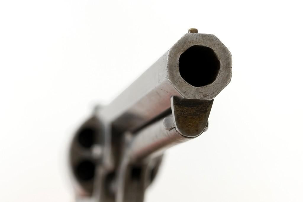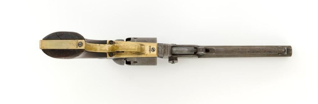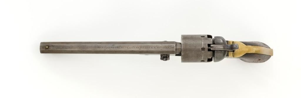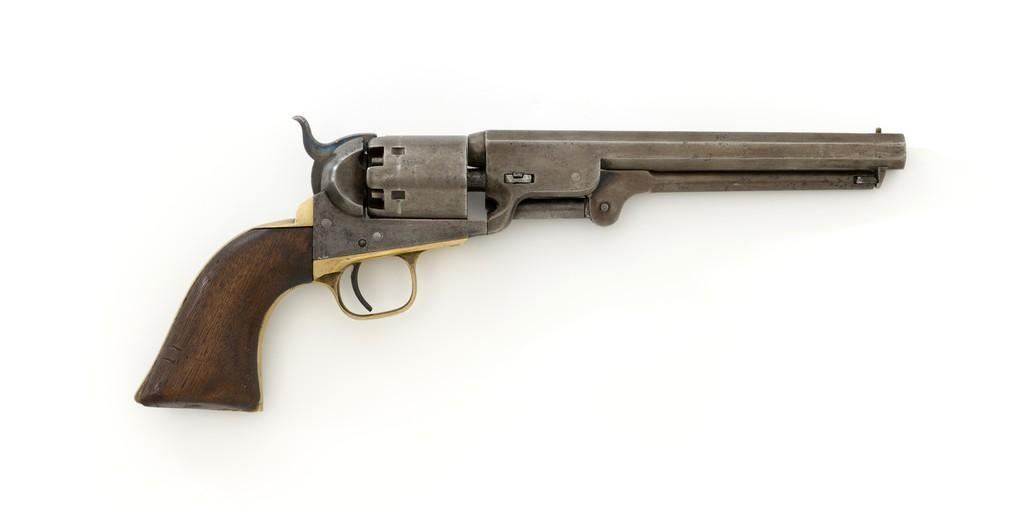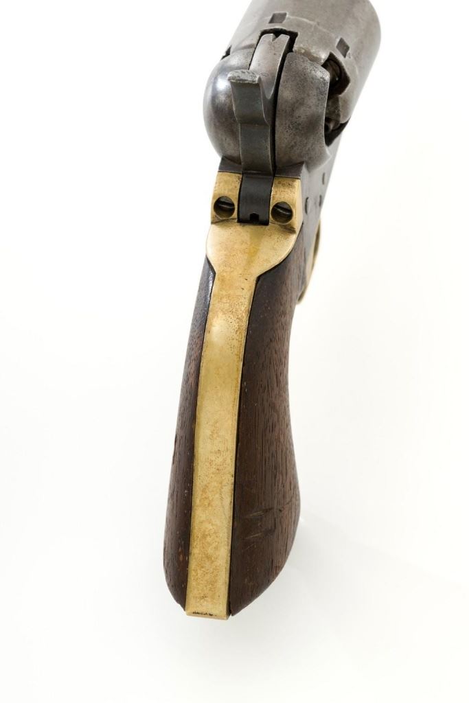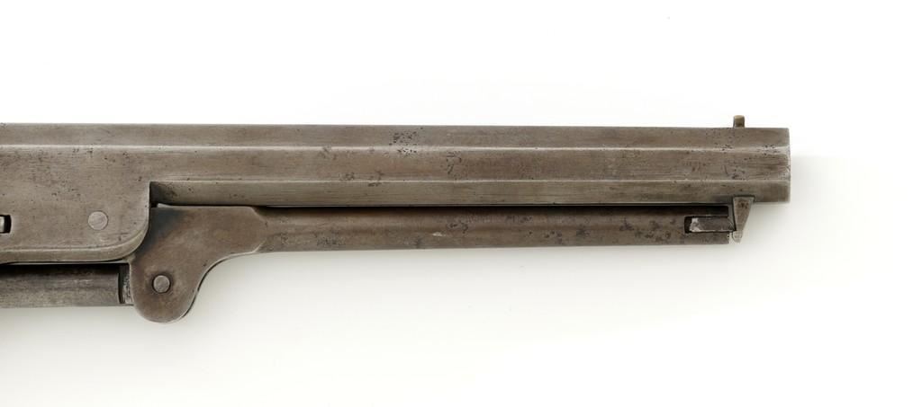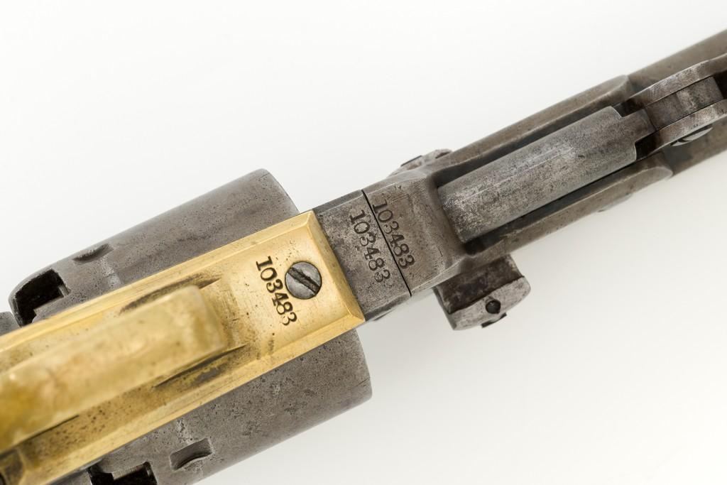 Colt Model 1851 Navy Percussion Revolver, #103483, .36 cal., 7.5'' octagon barrel, blue and case hardened finish, one-piece varnished walnut grips, brass front and fixed ''V''-notch rear sight. Serial numbers are matching, including the barrel wedge. Mfg'd 1861. Revolver is in overall good condition, displaying an even gray patina to the metal, with spots of moderate darkening and mild pitting to sides of the frame. Grips are very good, showing moderate handling wear, especially to the bottom left grip panel; both sides show shrinkage from age. Right side with two ''kill'' notches along the back edge. Factory markings are clear, except for the cylinder scene which has mostly worn away. Action is crisp but a little weak. Bore rates fair+ with visible rifling and scattered moderate erosion. Est.: $1,000-$1,500. (Antique)