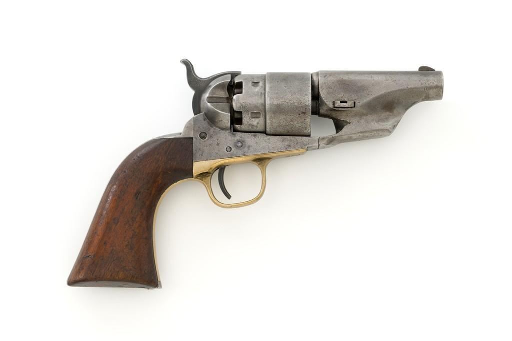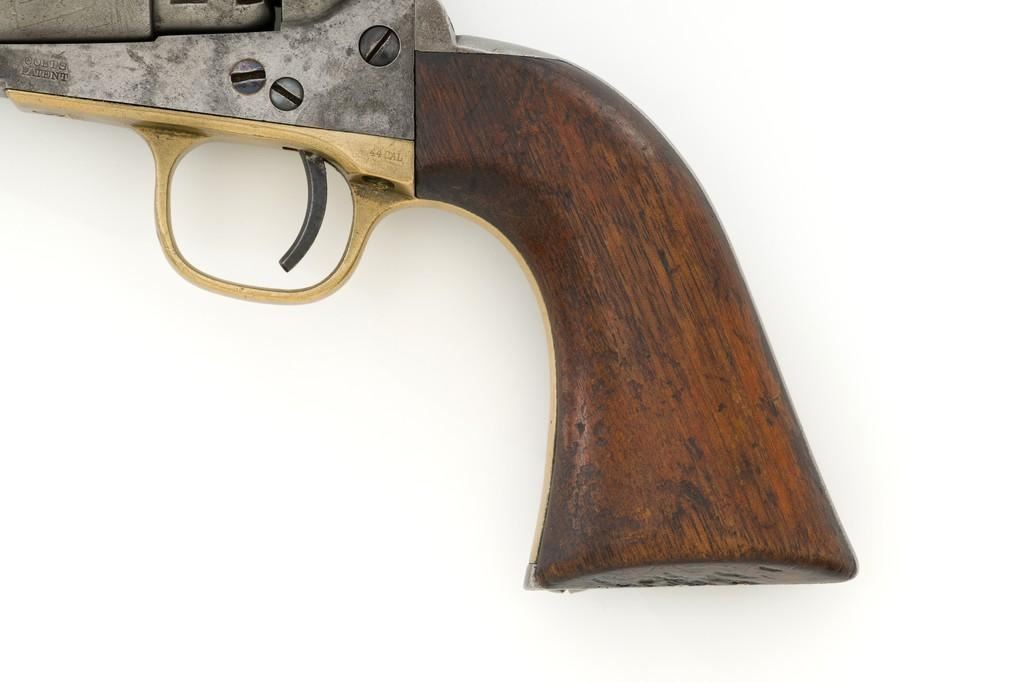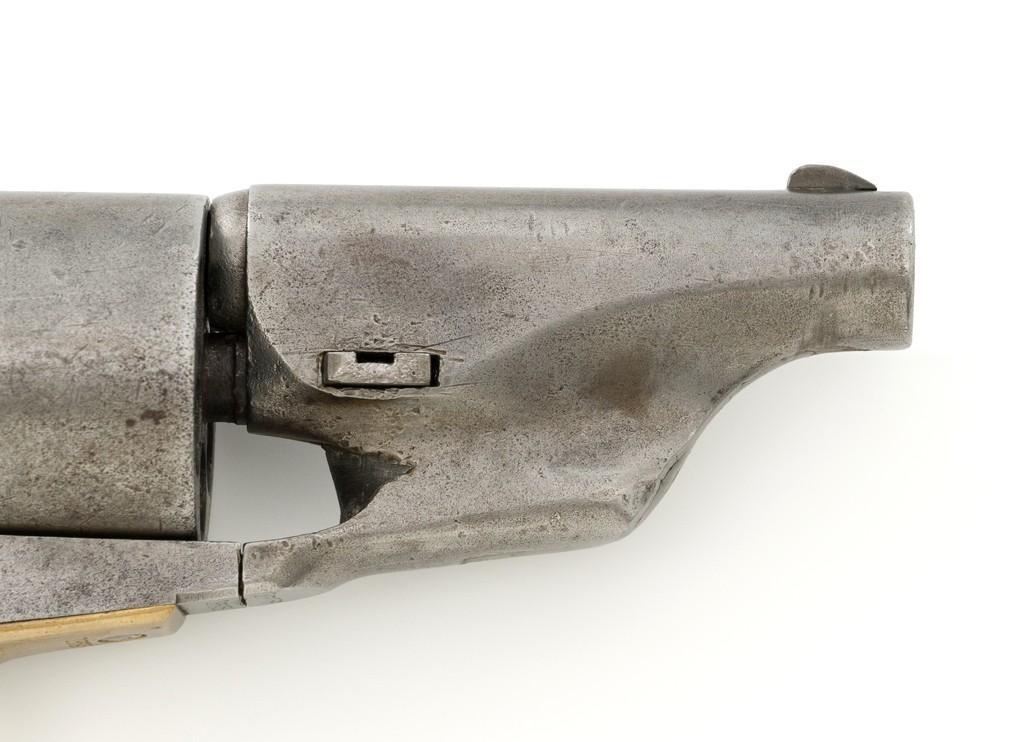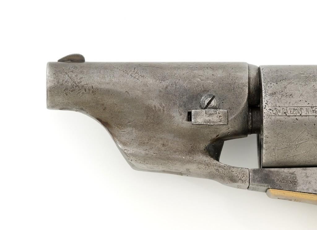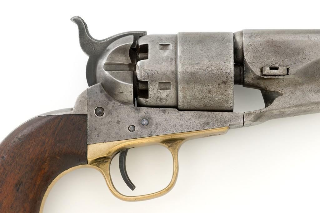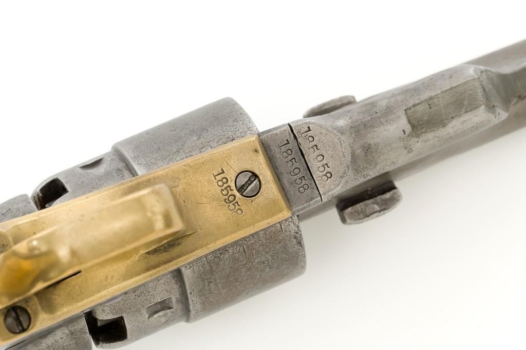 Period Modified Colt Model 1860 Army ''Mormon Avenger'' Percussion Revolver, #185958, .44 cal., barrel cut down to 3'', blue and case hardened finish, brass trigger guard, smooth walnut grips, brass blade front and fixed ''V''-notch rear sight. Visible numbers are matching. Wedge is not numbered. Mfg'd 1870. Revolver is in overall good condition as modified, displaying an even gray patina to the metal surfaces, with scattered mild pitting, old marks from age and use; expected moderate patina to the brass trigger guard. Hardwood grips fit nicely and are overall very good, with some old mars and wear to the bottom of both grip panels. Wood graining is pleasing; considerable rich oil finish remains. Factory markings are clear (portion of the barrel address was lost when the barrel was cut). Approx. 40% cylinder scene remains visible. One nipple is a replacement. Action is strong. Bore rates fair with visible rifling and light to moderate scattered erosion. Est.: $800-$1,200. (Antique)