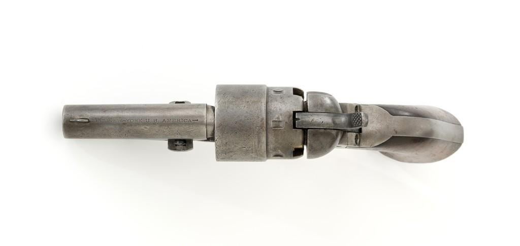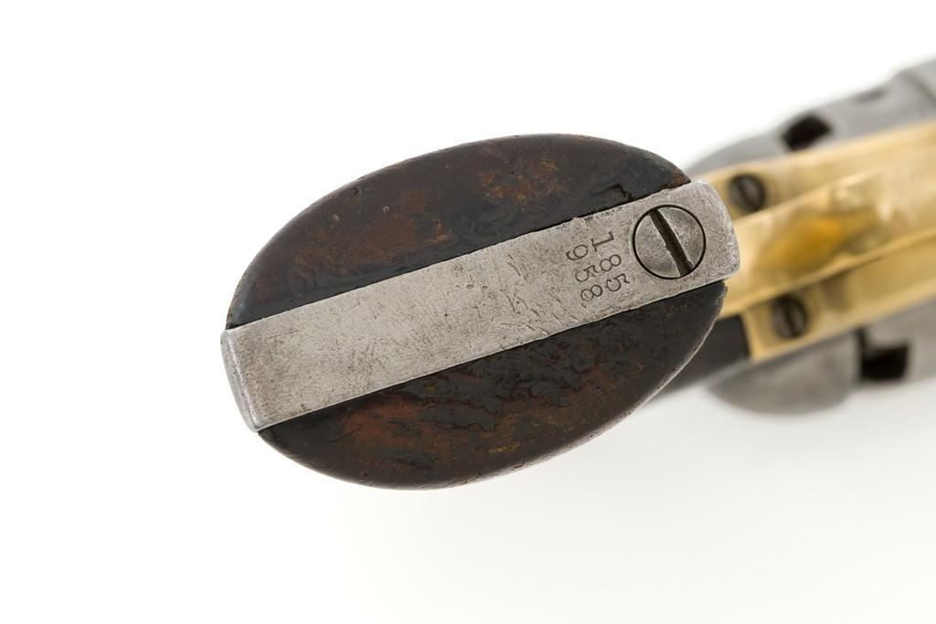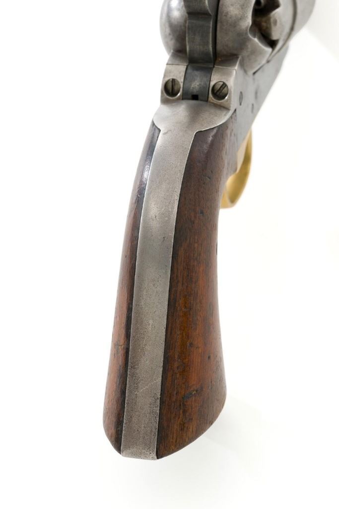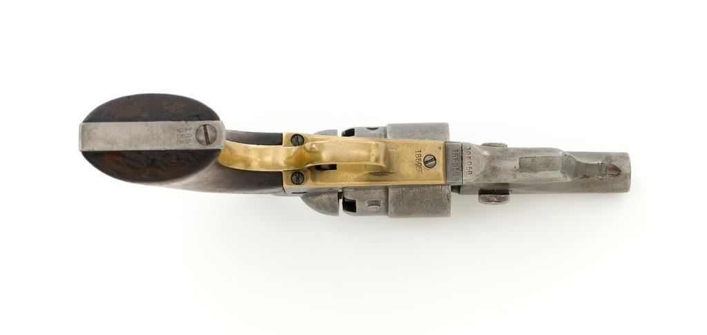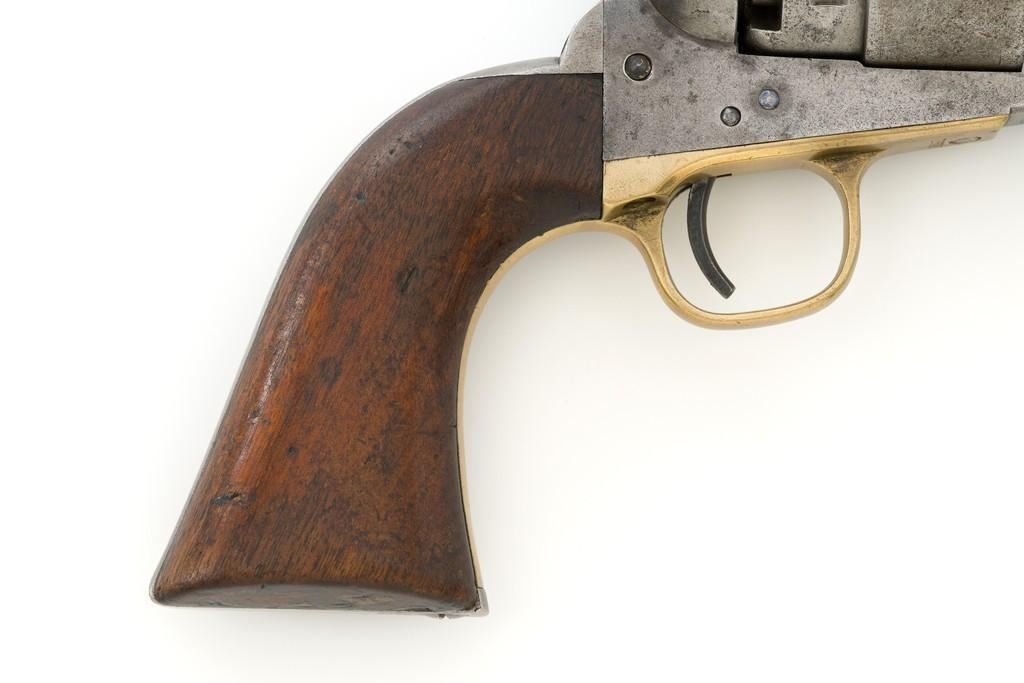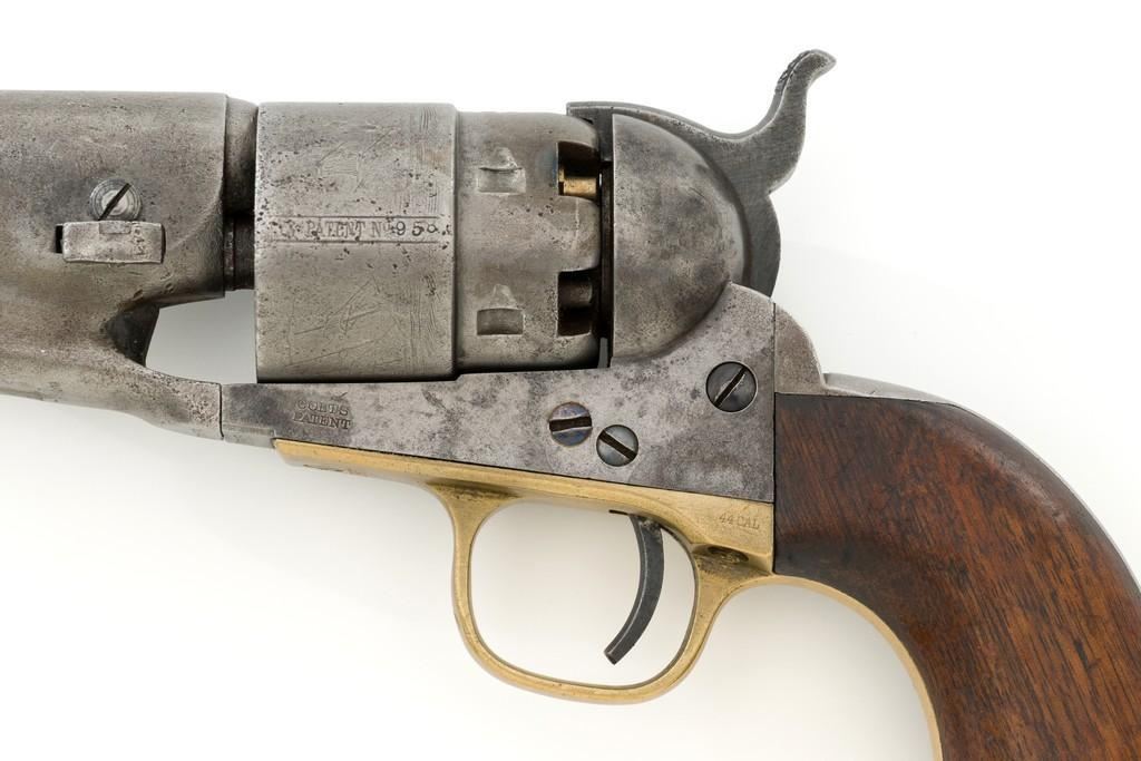 Period Modified Colt Model 1860 Army ''Mormon Avenger'' Percussion Revolver, #185958, .44 cal., barrel cut down to 3'', blue and case hardened finish, brass trigger guard, smooth walnut grips, brass blade front and fixed ''V''-notch rear sight. Visible numbers are matching. Wedge is not numbered. Mfg'd 1870. Revolver is in overall good condition as modified, displaying an even gray patina to the metal surfaces, with scattered mild pitting, old marks from age and use; expected moderate patina to the brass trigger guard. Hardwood grips fit nicely and are overall very good, with some old mars and wear to the bottom of both grip panels. Wood graining is pleasing; considerable rich oil finish remains. Factory markings are clear (portion of the barrel address was lost when the barrel was cut). Approx. 40% cylinder scene remains visible. One nipple is a replacement. Action is strong. Bore rates fair with visible rifling and light to moderate scattered erosion. Est.: $800-$1,200. (Antique)