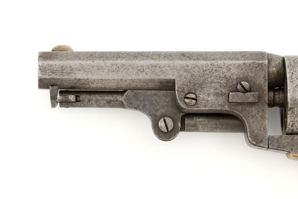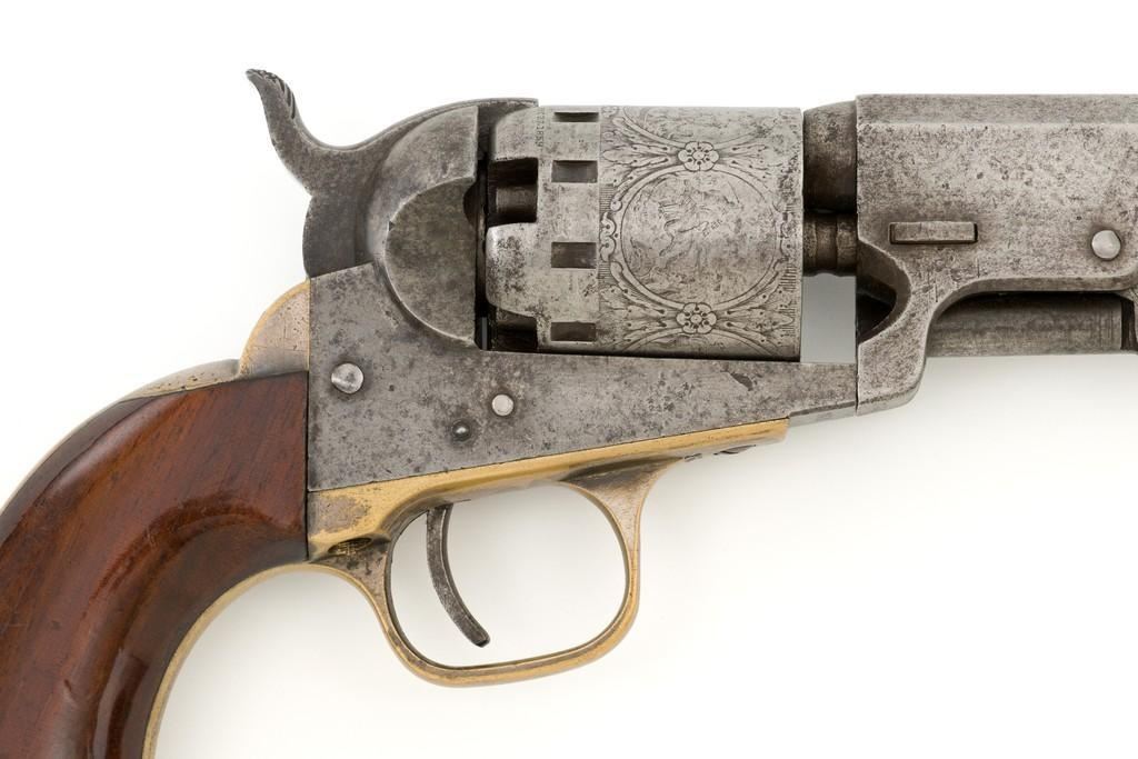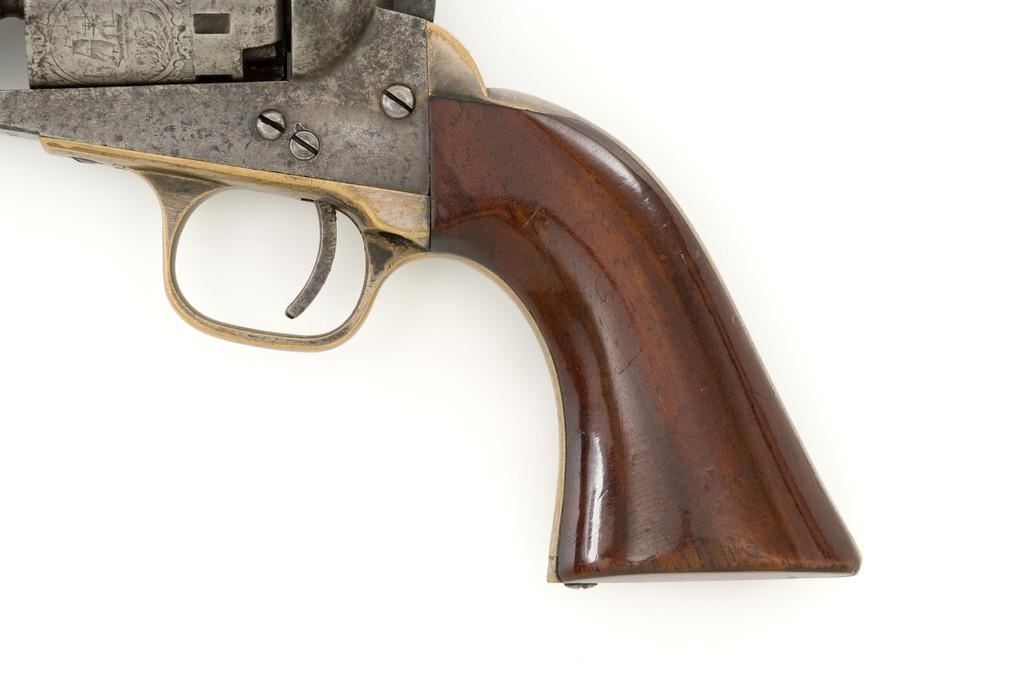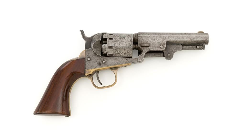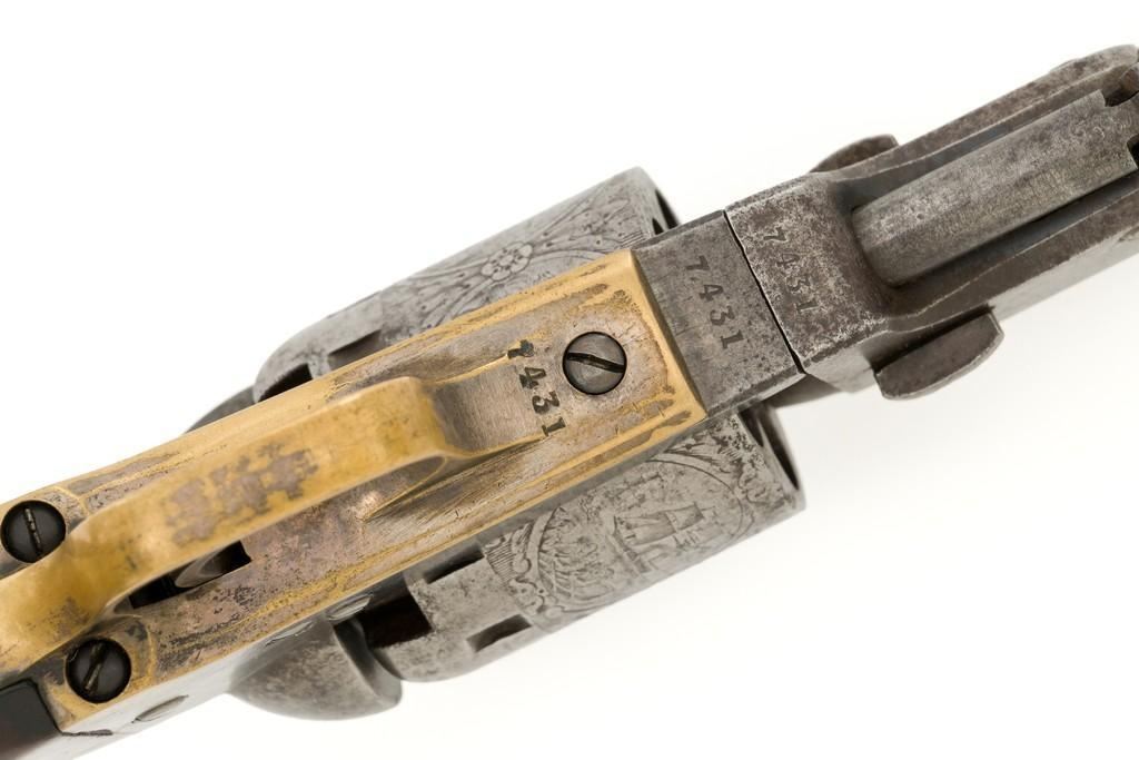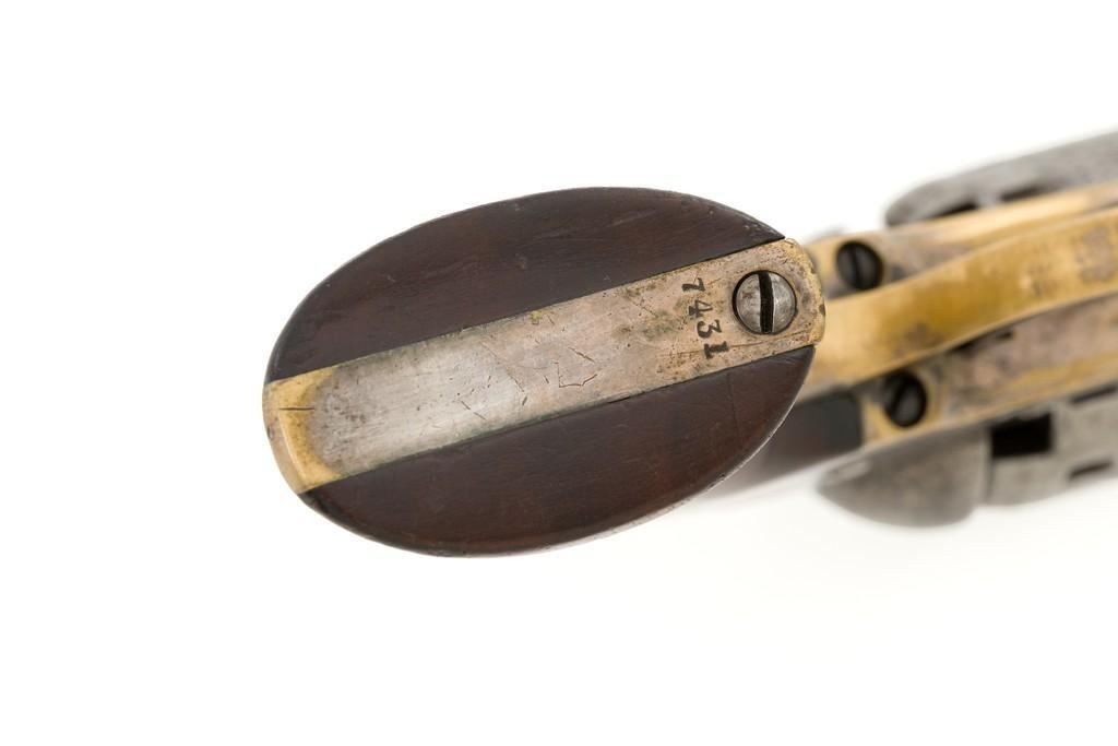 Manhattan Firearms Mfg. Co. Series II Navy Percussion Revolver, #7431, .36 cal., 4'' octagon barrel, originally with blued finish, brass trigger guard and backstrap, hardwood grips, brass blade front sight, and ''V''-notch rear sight. Cylinder with standard roll engraving for this model. Barrel address is marked in one-line ''MANHATTAN FIRE ARMS MFG. CO. NEW YORK''. Matching visible numbers, including the cylinder and wedge. Mfg'd circa 1860-1861. Overall condition is good, metal with an overall gray patina, displaying scattered very light pinprick pitting. Brass parts show thinning in the handling areas; balance moderate patina. Grips are fine, with lovely grain patterns, scattered light handling marks; majority of their rich oil finish remains. Barrel address is clear. Cylinder scene remains approx. 70% visible. Action is crisp and cycles smoothly. Bore is good with visible rifling and a few spots of scattered minor erosion. Est.: $700-$900. (Antique)