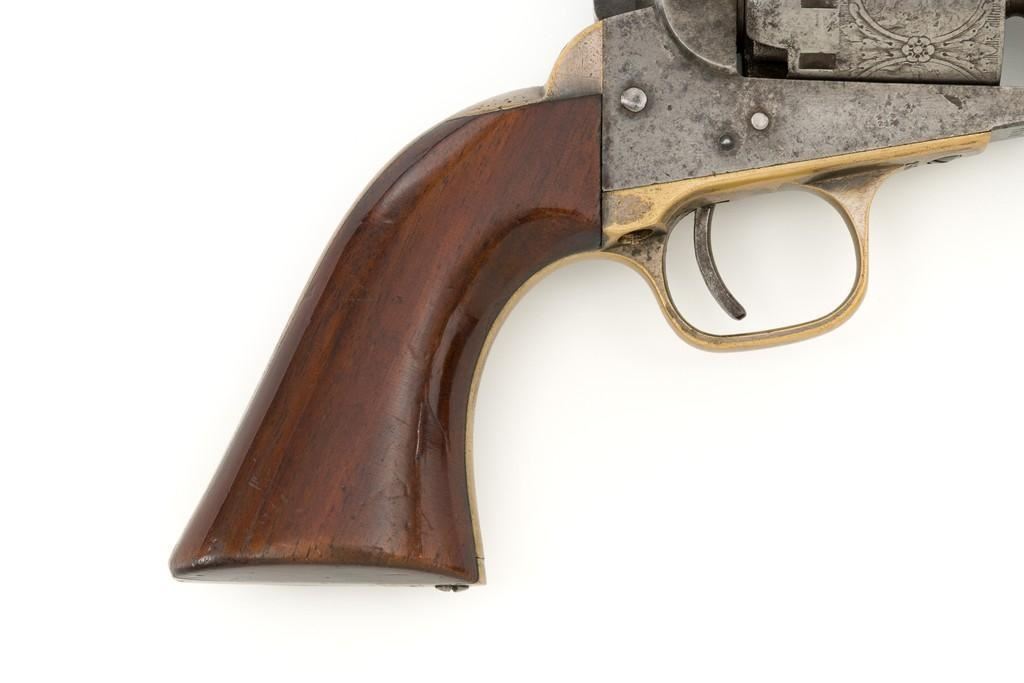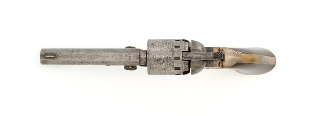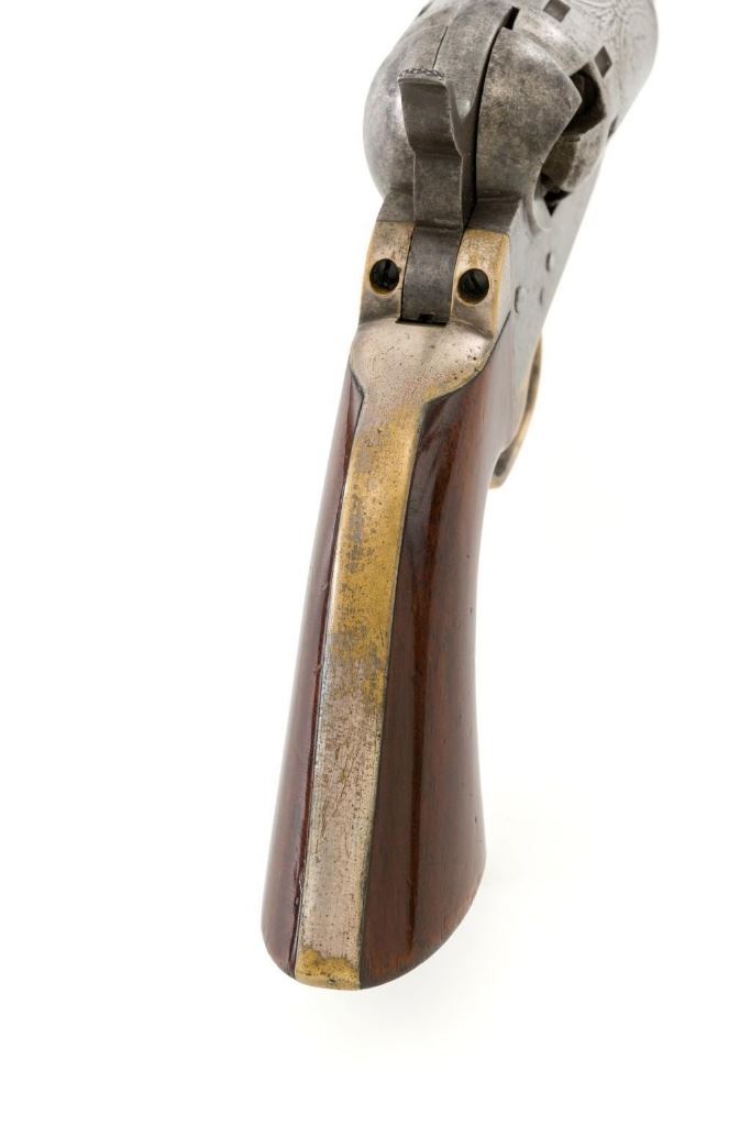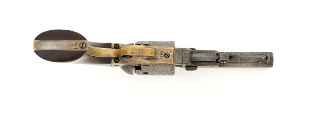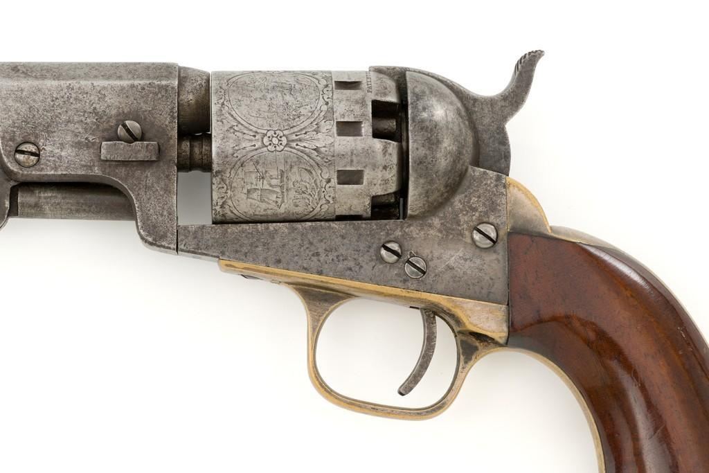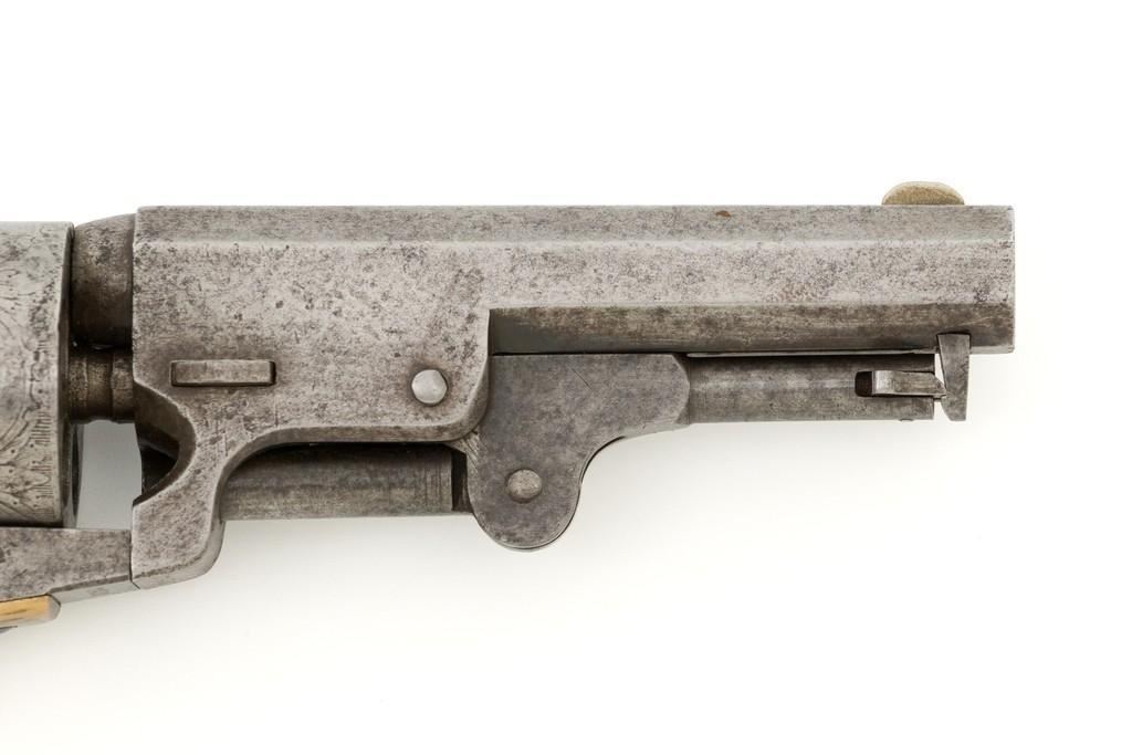 Manhattan Firearms Mfg. Co. Series II Navy Percussion Revolver, #7431, .36 cal., 4'' octagon barrel, originally with blued finish, brass trigger guard and backstrap, hardwood grips, brass blade front sight, and ''V''-notch rear sight. Cylinder with standard roll engraving for this model. Barrel address is marked in one-line ''MANHATTAN FIRE ARMS MFG. CO. NEW YORK''. Matching visible numbers, including the cylinder and wedge. Mfg'd circa 1860-1861. Overall condition is good, metal with an overall gray patina, displaying scattered very light pinprick pitting. Brass parts show thinning in the handling areas; balance moderate patina. Grips are fine, with lovely grain patterns, scattered light handling marks; majority of their rich oil finish remains. Barrel address is clear. Cylinder scene remains approx. 70% visible. Action is crisp and cycles smoothly. Bore is good with visible rifling and a few spots of scattered minor erosion. Est.: $700-$900. (Antique)