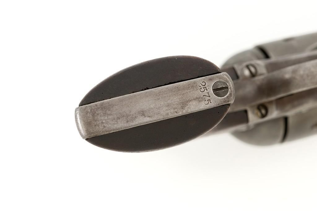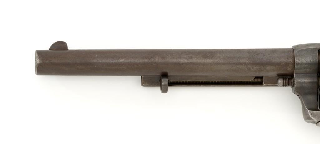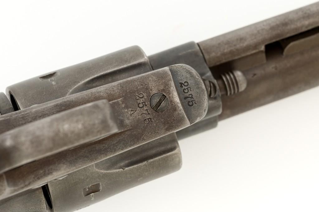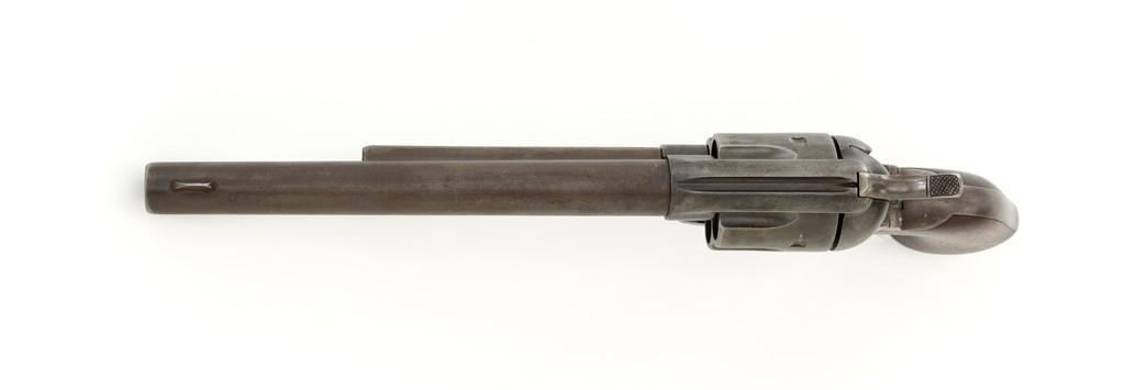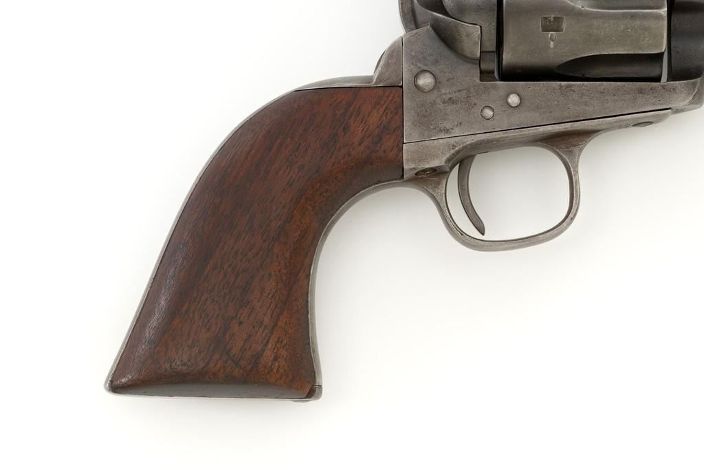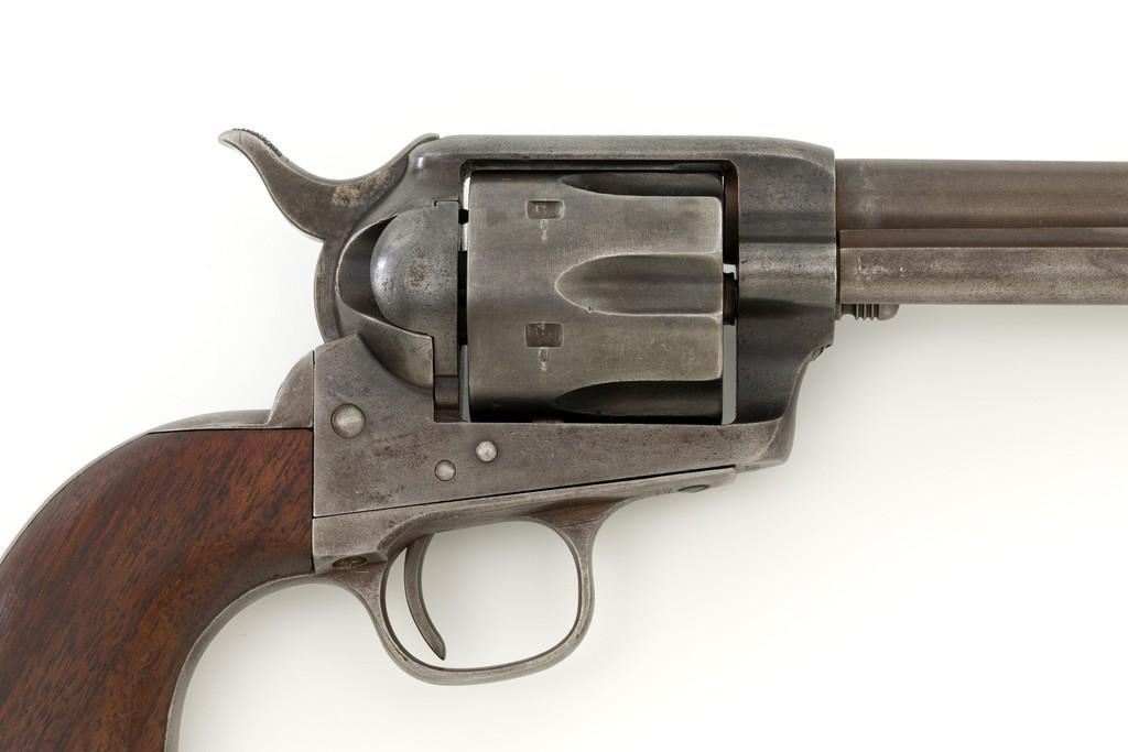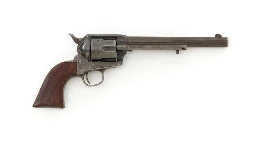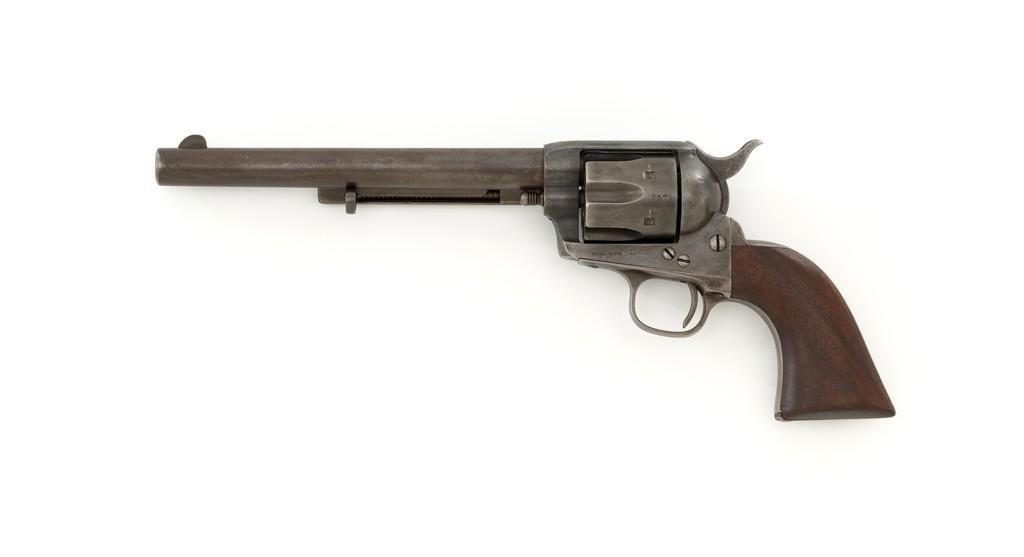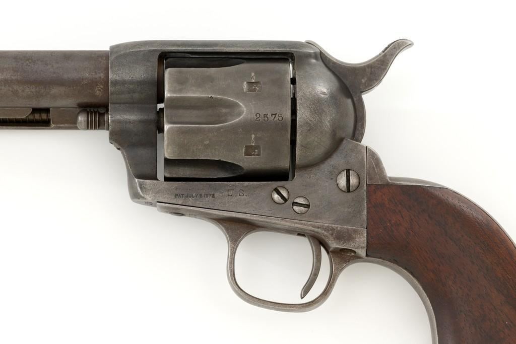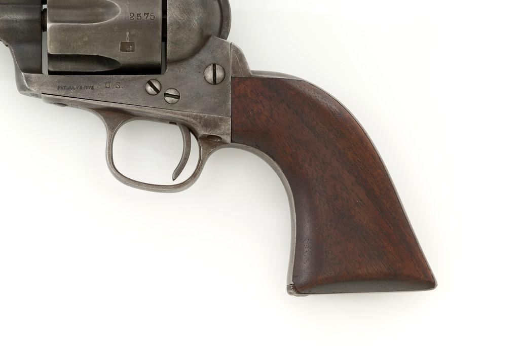 Factory Refurbished U.S. Colt Single Action Army Revolver Shipped to Manila, Philippines, #2575, .45 Colt cal., 7.5'' barrel, blued finish, smooth walnut grips, blade front sight, and fixed ''V'-notch rear sight. Manufactured in 1874 and has all matching visible serial numbers. Receiver has two-line patent dates and ''U.S.'' on the left side, and ''2575'' on the bottom. Loading gate is marked ''1794''. Trigger guard and backstrap are marked ''2575'', with a small ''A'' in front of the trigger guard. Cylinder is marked ''2575'', with small ''A'' and ''P''. Barrel is marked ''+COLT'S PT. F.A. MFG. CO. HARTFORD, CT. U.S.A.+'' on top and ''2575'', ''P'', and ''A'', on the bottom. Grip is not numbered and there are no visible cartouches. Overall condition is good, displaying an even brown/gray patina throughout, with some areas of mild pitting, general marks from age and use. Patent dates on the frame are partially worn. Otherwise, factory lettering is clear. Grips show moderate age and shrinkage, with scattered light handling marks. Action is crisp with all four clicks. Bore with some light etching but rates very good overall, with defined rifling. Includes a factory letter dated March 16, 1999, signed by Colt Historian Kathleen J. Hoyt, confirming the caliber and finish. Both the barrel length and type of stocks are ''Not Listed''. Factory letter states this revolver was shipped to ''Commanding Officer'', Address ''Manila Philippine Islands'' on November 26, 1901, as one of 100 same type guns in shipment. Interestingly, under ''Remarks'' the letter states ''The original records pertaining to this revolver were lost or destroyed many years ago. However, our records do indicate the return of this revolver for refurbishing and subsequent reshipment as noted above. The refurbishing consisted of replacement of worn parts, exterior refinishing and reassembly.'' Est.: $4,000-$6,000. (Antique)