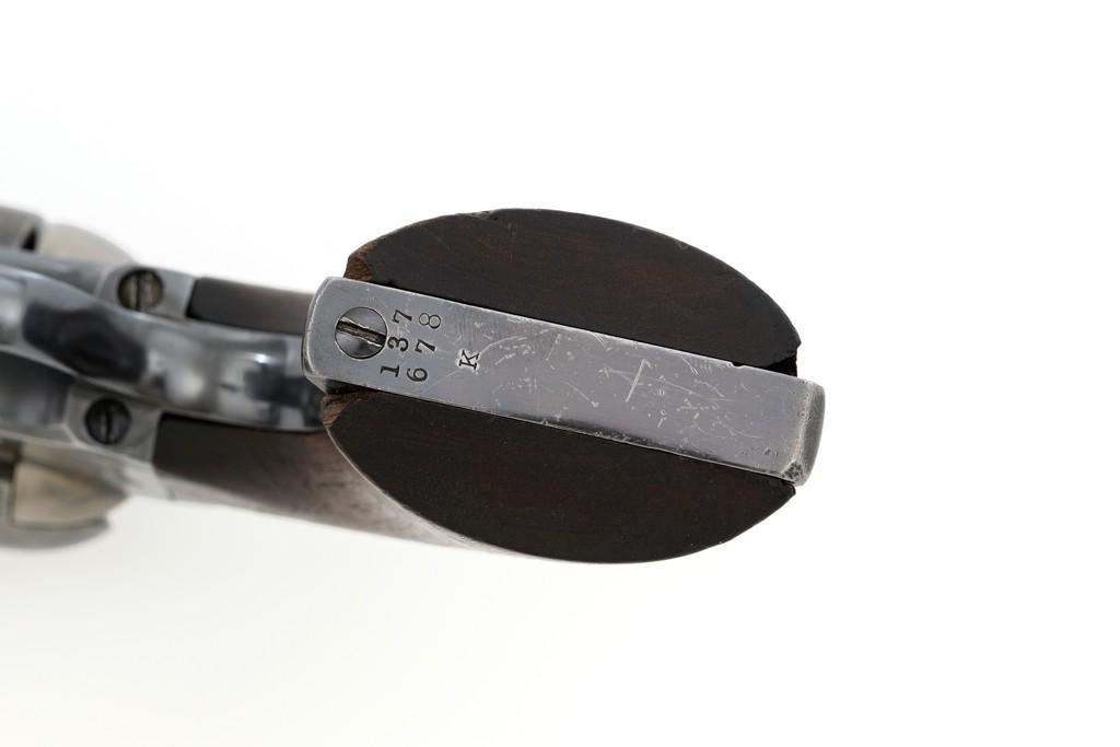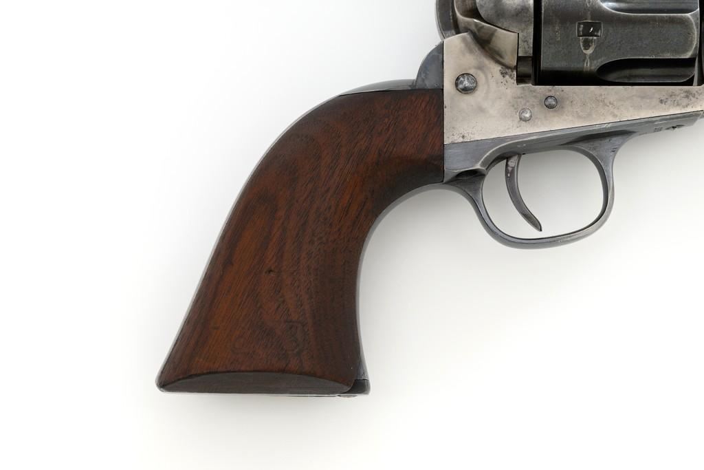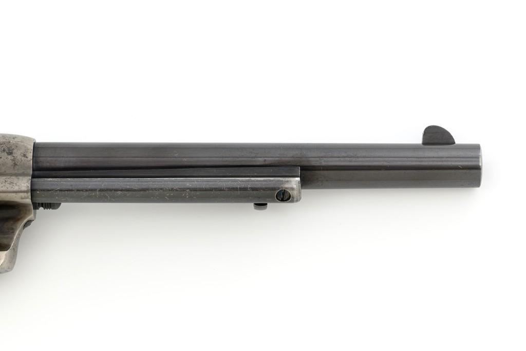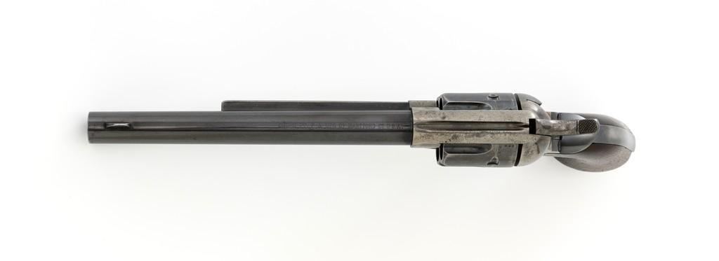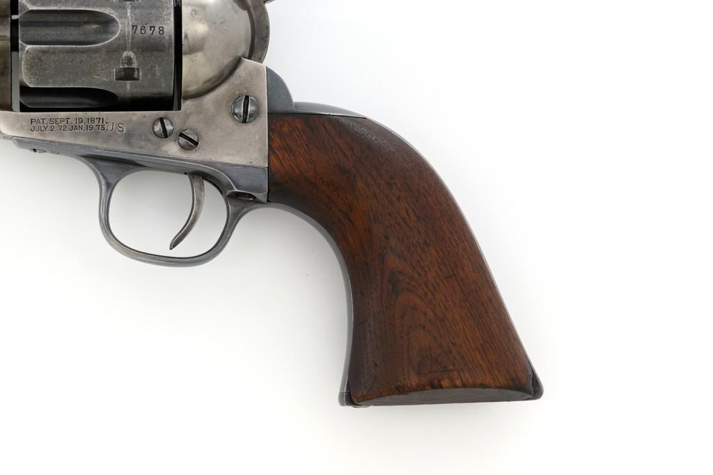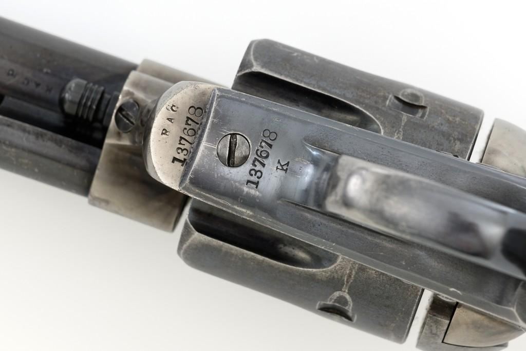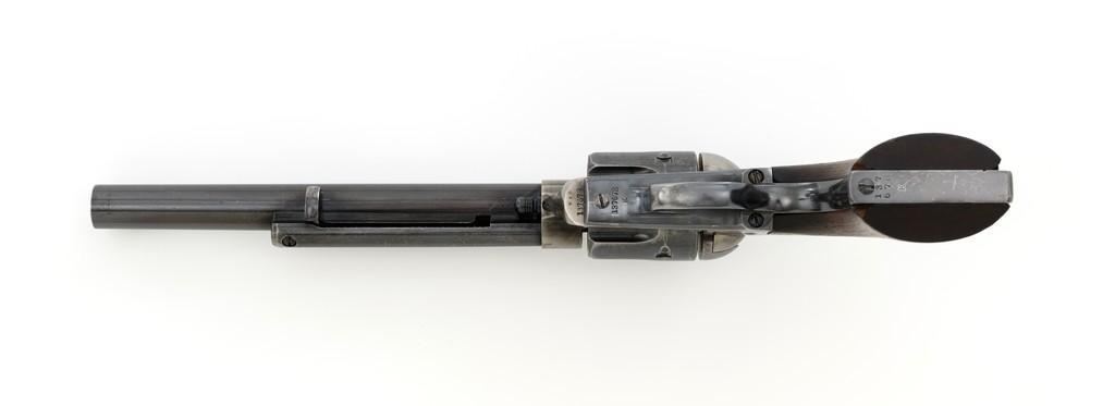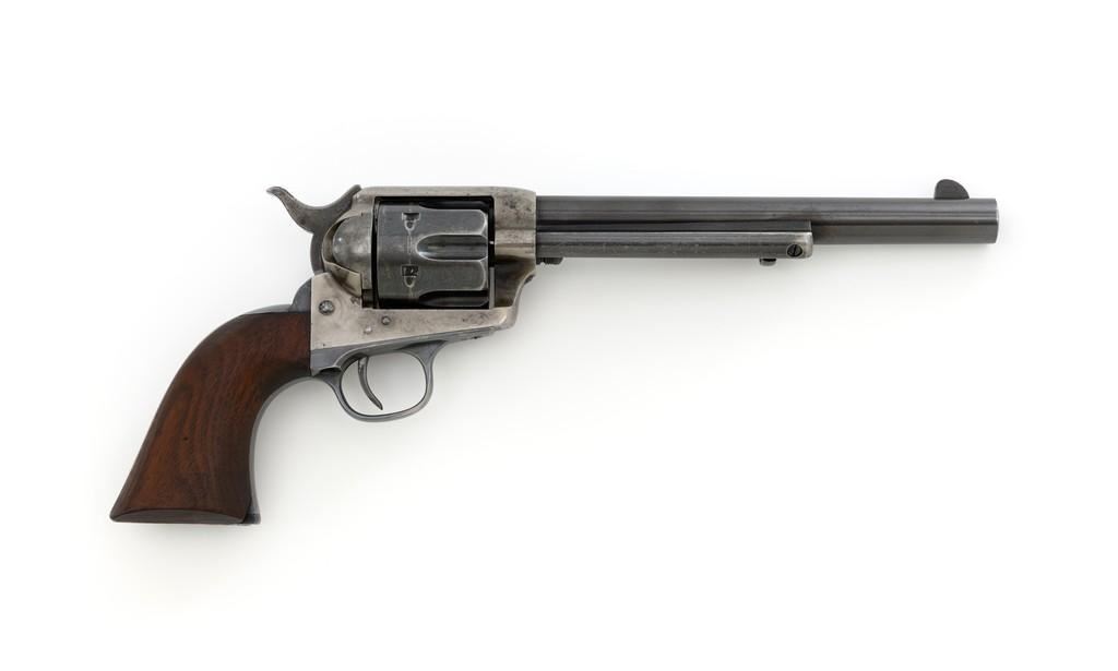 Colt Model 1873 U.S. Cavalry Single Action Revolver, #137678, .45 Colt cal., 7.5'' barrel, blue and case hardened finish, one-piece walnut grip, blade front sight, and ''U''-notch rear sight. The revolver was made in 1891 and has all matching serial numbered parts. Receiver has the two-line patent dates with ''U.S'' on the left side; ''RAC'' (Rinaldo A. Carr) and ''137678'' on the bottom. Trigger guard and backstrap are marked ''137678'' with a ''K''. Ejector housing is marked ''K'' at the front. Loading gate is marked ''622'' Cylinder is marked ''R.A.C.'' with a ''P'', and ''7678''. Barrel is marked ''COLT'S PT. F.A. MFG. CO. HARTFORD CT. U.S.A.'' on top, and ''R.A.C.'' with a ''P'' and ''7678'' on the bottom. Revolver is in very good condition overall. Case colors are visible in some of the protected areas on the receiver and hammer. Blued finish is approx. 70% with most wear on the cylinder and ejector housing. Barrel with light scratches and marks scattered throughout. Trigger guard and backstrap show evidence of an old reblued finish, now displaying some mild frosting. Feathering is visible at the front sight. Grips are faintly marked ''RAC'' on the right and ''1891/SEB'' (Capt. S.E. Blunt) on the left, which is hard to see. Grips were lightly sanded and the lower left side of the grip is chipped front and back, the right side is chipped on the front. Action locks up tight with four distinct clicks. Bore is bright with very good rifling. Est.: $4,000-$6,000. (Antique)