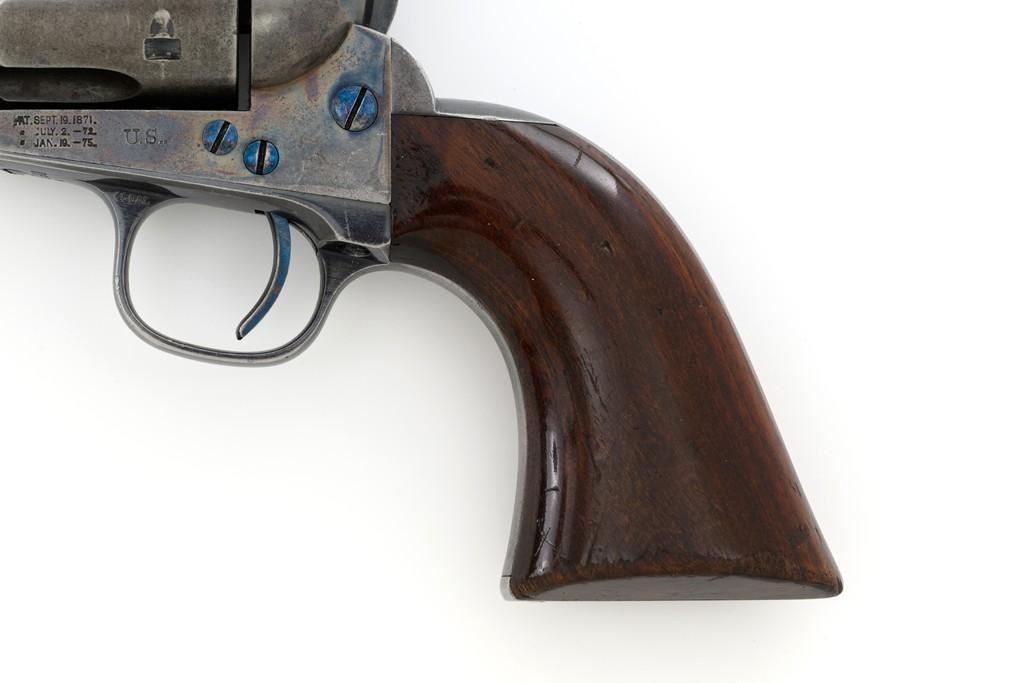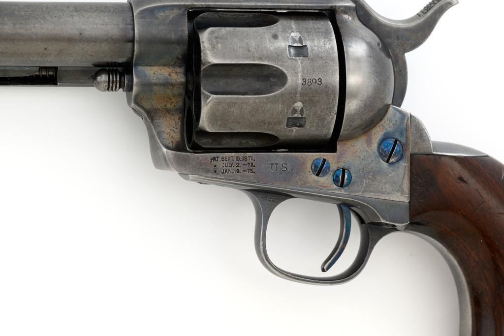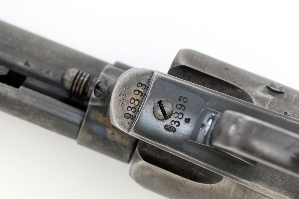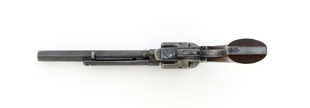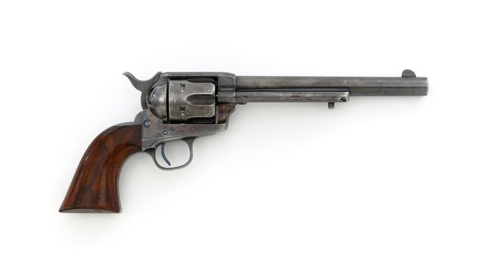 Colt Model 1873 U.S. Cavalry Single Action Revolver, #93893, .45 Colt cal. 7.5'' barrel, blue and case hardened finish, one-piece walnut grip, blade front sight, and ''U''-notch rear sight. The revolver was made in 1883 and has all matching serial numbered parts. Receiver has the three-line patent dates and ''U.S.'' on the left side, and D.F.C. (David F. Clark) with ''93893'' on the bottom. Loading gate is marked ''1011'' Trigger guard and backstrap are marked ''93893'' with a ''G''. Cylinder is marked ''D.F.C.'' with a ''P'' and ''3893''. Barrel is marked ''COLT'S PT. F.A. MFG. CO. HARTFORD CT. U.S.A.'' on top and ''3893'', ''D.F.C'', and ''P'' on the bottom. Condition is very good overall. Light case colors are visible on the frame and hammer. Blued finish is approx. 25%-30%, mostly on the trigger guard and ejector housing. Factory lettering is clear. Grips have light handling marks, are serial numbered to the revolver but not inspected. Grips also have an old original varnish finish and the trigger guard is marked ''45 CAL'', indicating this revolver may be a buy back or overrun that was sold commercially by Colt. Action locks up tight with 4 distinct clicks. Bore rates very good and is primarily bright, with a few spots of light erosion, and defined rifling. Est.: $3,500-$5,500. (Antique)