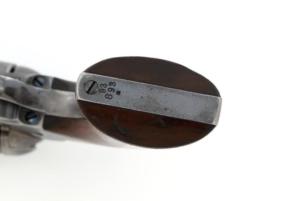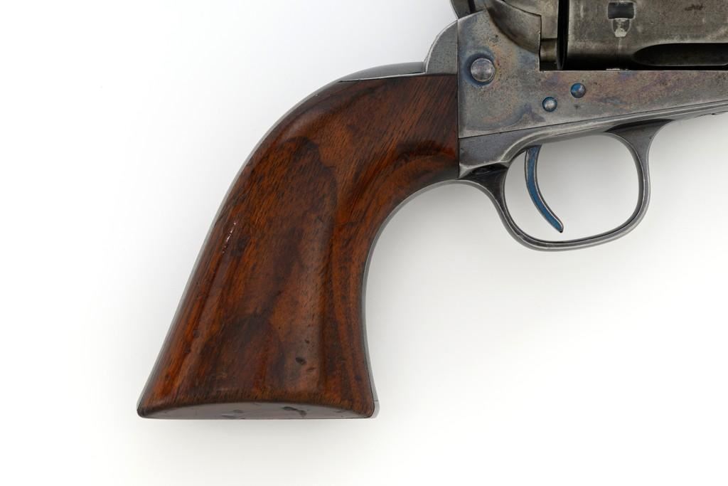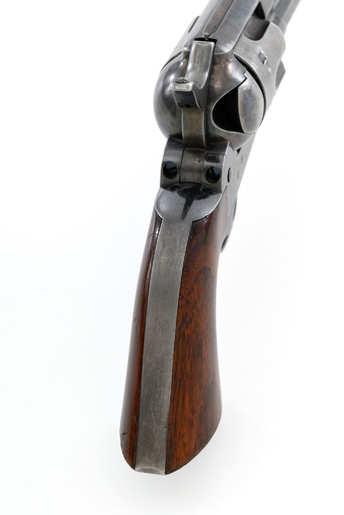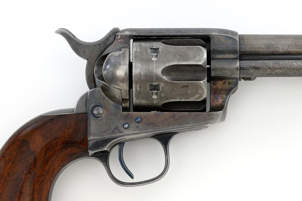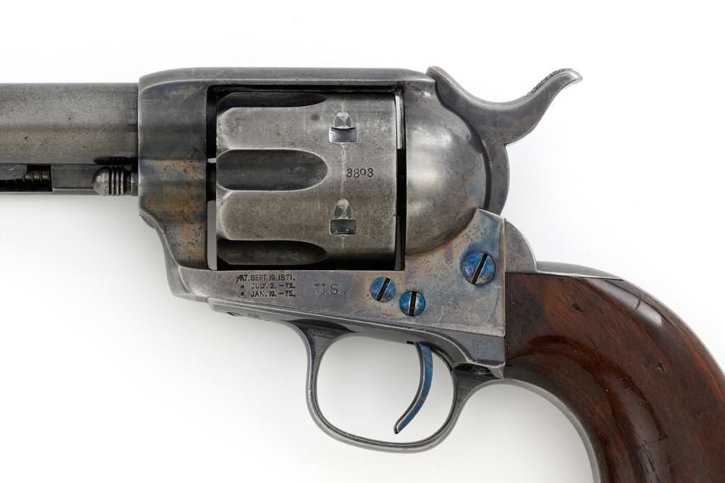 Colt Model 1873 U.S. Cavalry Single Action Revolver, #93893, .45 Colt cal. 7.5'' barrel, blue and case hardened finish, one-piece walnut grip, blade front sight, and ''U''-notch rear sight. The revolver was made in 1883 and has all matching serial numbered parts. Receiver has the three-line patent dates and ''U.S.'' on the left side, and D.F.C. (David F. Clark) with ''93893'' on the bottom. Loading gate is marked ''1011'' Trigger guard and backstrap are marked ''93893'' with a ''G''. Cylinder is marked ''D.F.C.'' with a ''P'' and ''3893''. Barrel is marked ''COLT'S PT. F.A. MFG. CO. HARTFORD CT. U.S.A.'' on top and ''3893'', ''D.F.C'', and ''P'' on the bottom. Condition is very good overall. Light case colors are visible on the frame and hammer. Blued finish is approx. 25%-30%, mostly on the trigger guard and ejector housing. Factory lettering is clear. Grips have light handling marks, are serial numbered to the revolver but not inspected. Grips also have an old original varnish finish and the trigger guard is marked ''45 CAL'', indicating this revolver may be a buy back or overrun that was sold commercially by Colt. Action locks up tight with 4 distinct clicks. Bore rates very good and is primarily bright, with a few spots of light erosion, and defined rifling. Est.: $3,500-$5,500. (Antique)