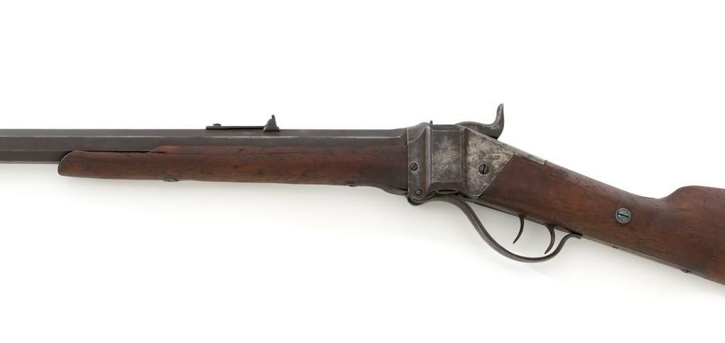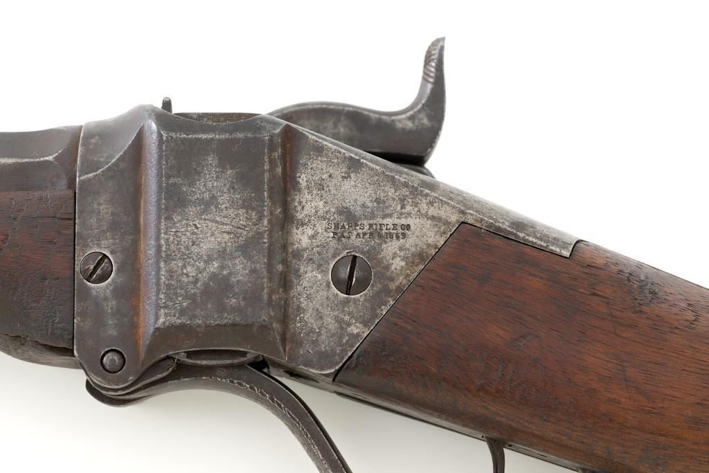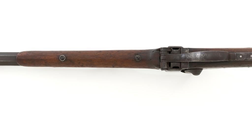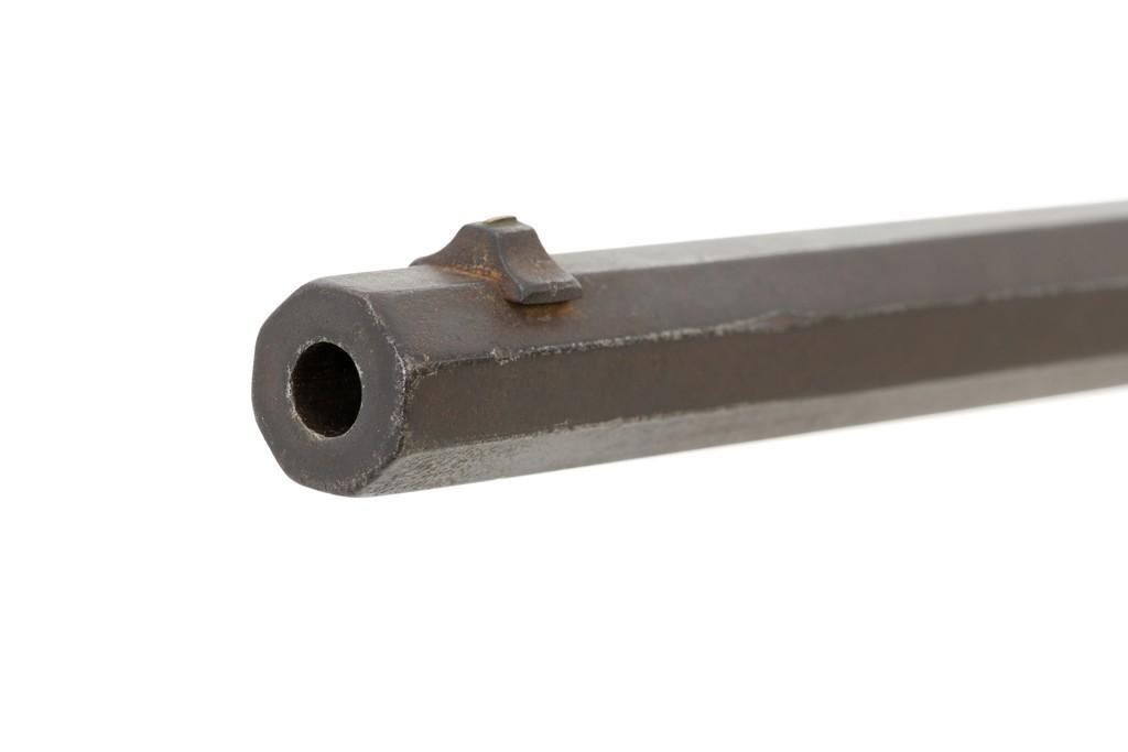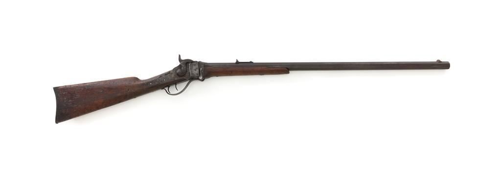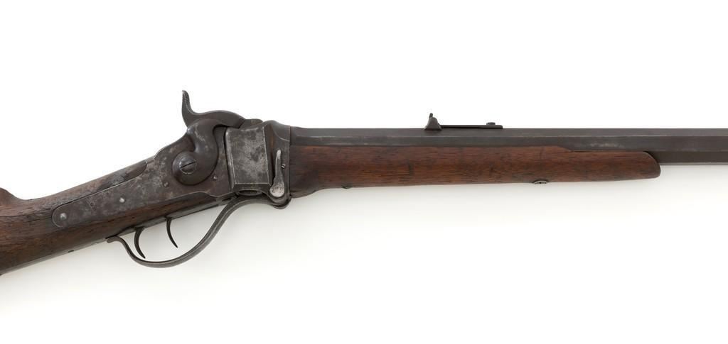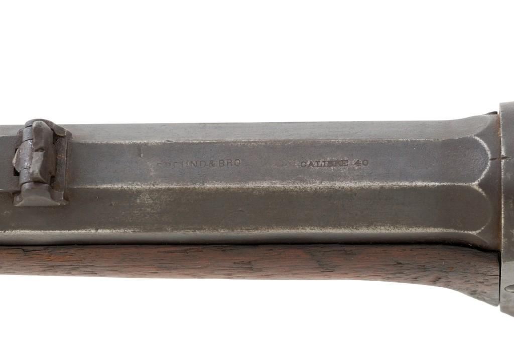Freund & Bro Marked Sharps Model 1874 Single Shot Sporting Rifle, #155467, .40 cal., 30'' heavy octagon barrel, blued and case hardened finish, walnut stock and forend, fixed front and rear sights. Top of the barrel at the breech is marked for famous frontier gunsmiths/dealers ''Freund & Bro''. Mfg'd circa 1876. This classic sporting rifle is in good, un-cleaned condition, displaying considerable muted blue finish mixed with brown patina on the barrel. Mottled gray patina to the receiver assembly. Factory markings are clear. Lower half of a few of the letters in ''Freund'' are worn. Wood is well-worn with scattered old mars and scratches from years of handling and use. Additionally, the forend shows an approx. 3'' x 1/8'' old loss to the front top on both sides. Action functions well. Bore is fair, showing expected age and wear, with good rifling, scattered spots of light erosion. Est.: $4,000-$6,000. (Antique)
