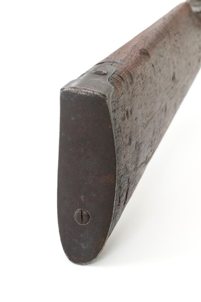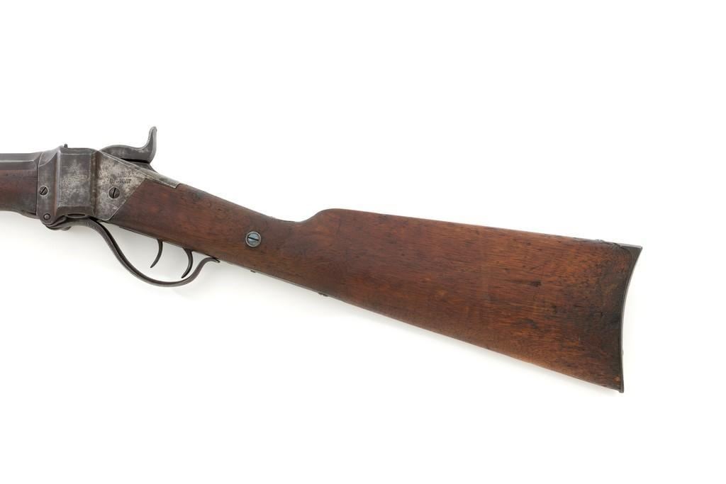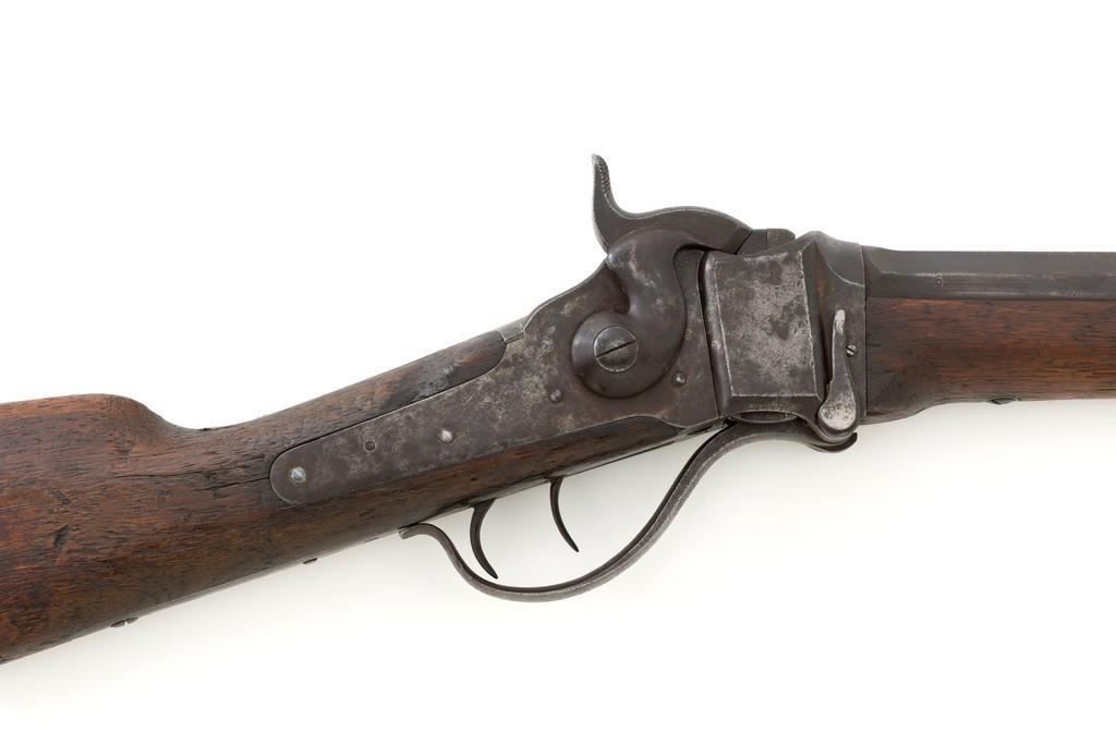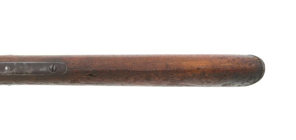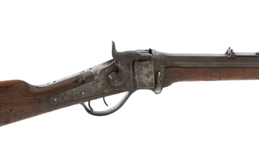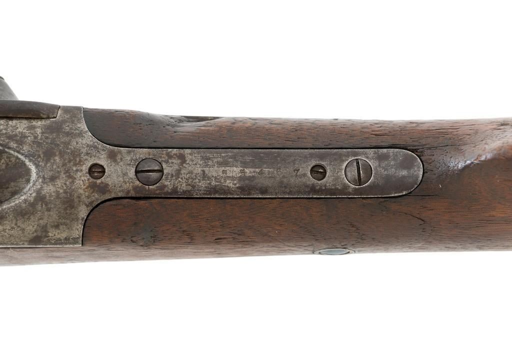 Freund & Bro Marked Sharps Model 1874 Single Shot Sporting Rifle, #155467, .40 cal., 30'' heavy octagon barrel, blued and case hardened finish, walnut stock and forend, fixed front and rear sights. Top of the barrel at the breech is marked for famous frontier gunsmiths/dealers ''Freund & Bro''. Mfg'd circa 1876. This classic sporting rifle is in good, un-cleaned condition, displaying considerable muted blue finish mixed with brown patina on the barrel. Mottled gray patina to the receiver assembly. Factory markings are clear. Lower half of a few of the letters in ''Freund'' are worn. Wood is well-worn with scattered old mars and scratches from years of handling and use. Additionally, the forend shows an approx. 3'' x 1/8'' old loss to the front top on both sides. Action functions well. Bore is fair, showing expected age and wear, with good rifling, scattered spots of light erosion. Est.: $4,000-$6,000. (Antique)