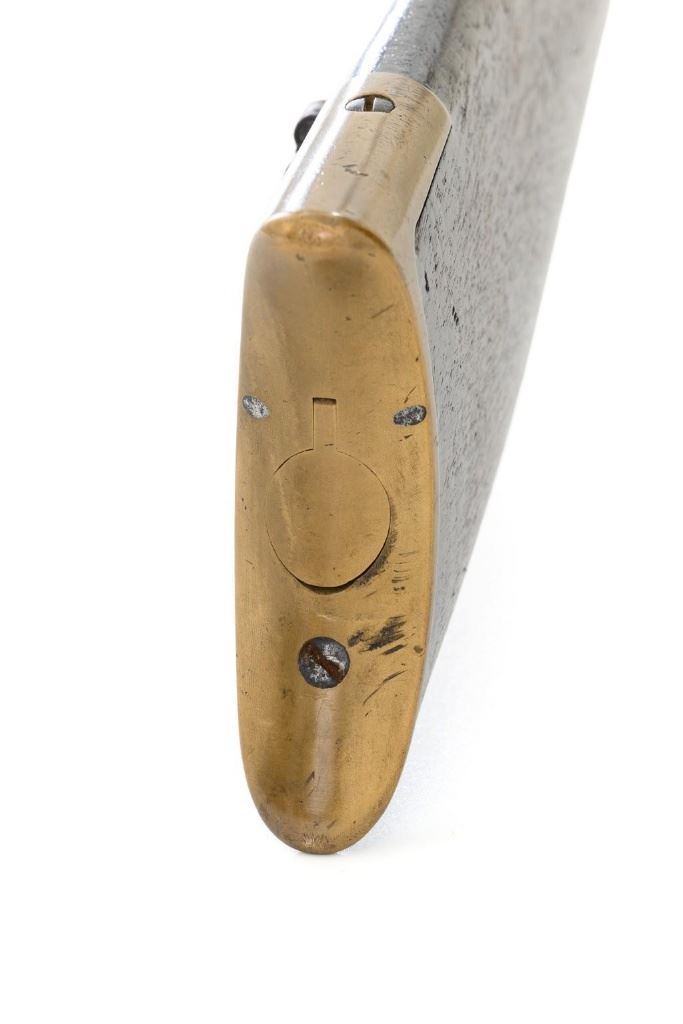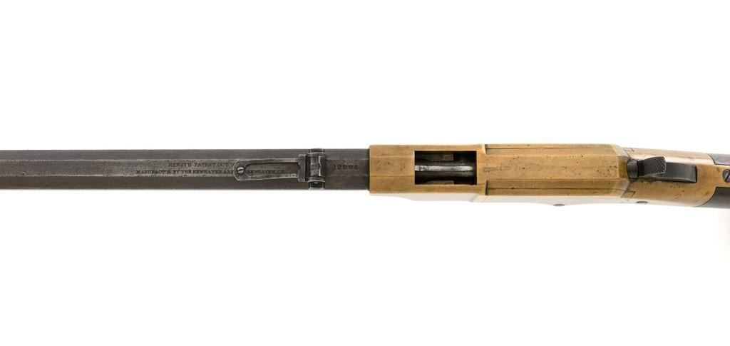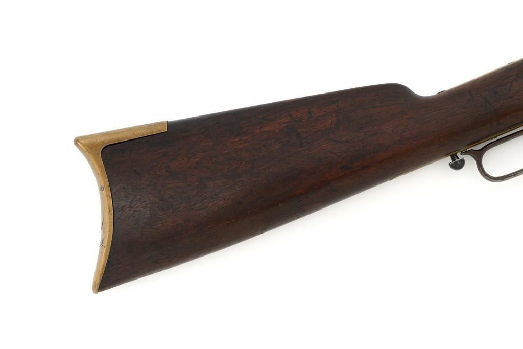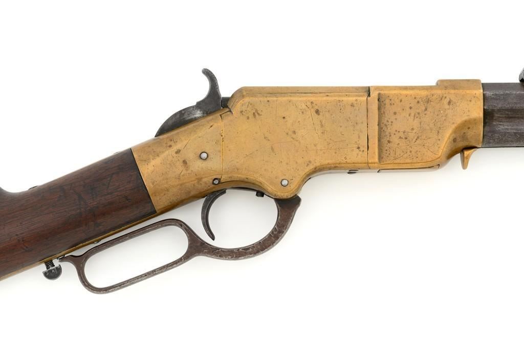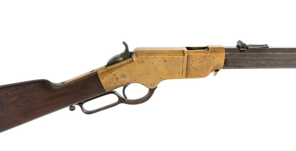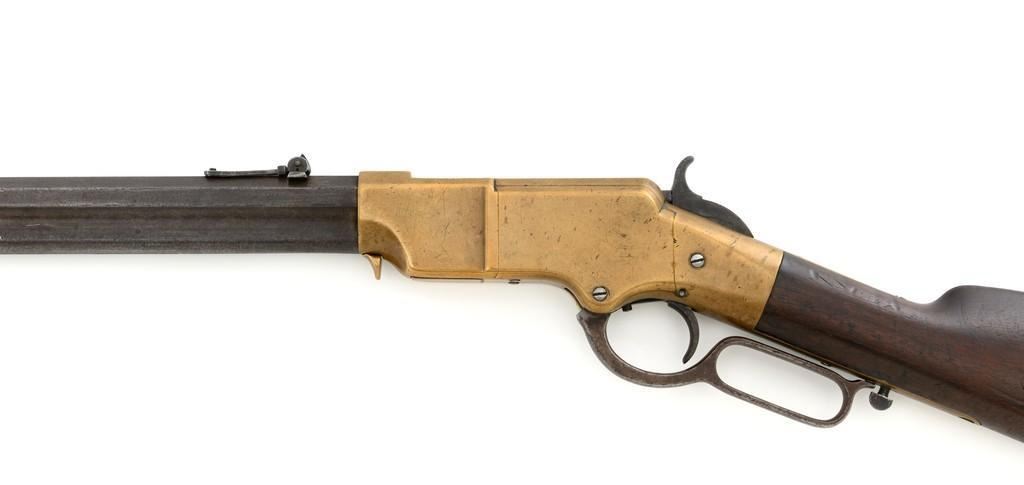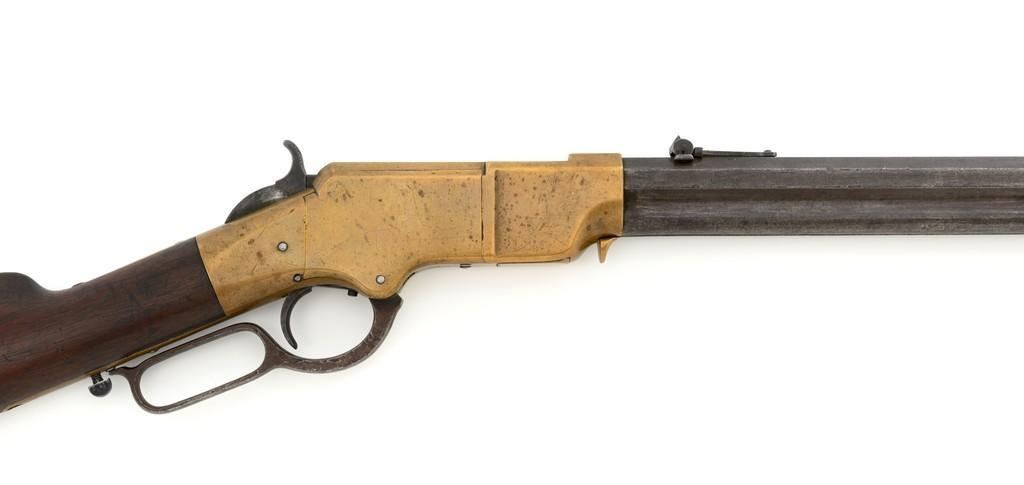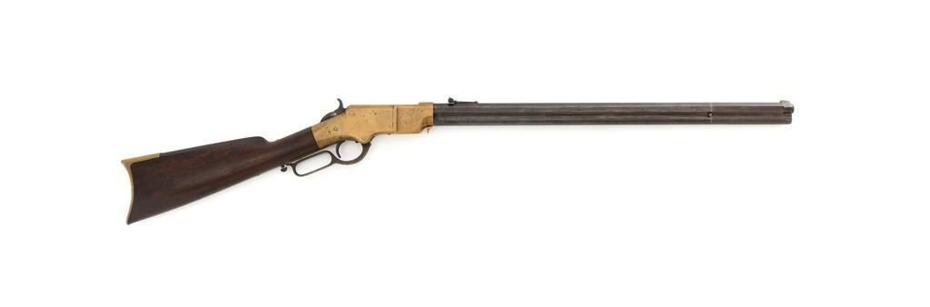 Late New Haven Arms Co. Henry Model 1860 Lever Action Rifle, #12832, .44 RF cal., 24'' barrel, brass frame, smooth walnut buttstock with sling swivel on the left side, brass buttplate with trapdoor, German silver blade front sight, notched rear sight with rounded folding leaf. Top of the barrel is marked in two-lines ''HENRY'S PATENT. OCT. 16, 1860/MANUFACT'D BY THE NEW HAVEN ARMS CO. NEW HAVEN, CT.'' Barrel is numbered ''12896'', which is 64 numbers away from the serial number on left side of the receiver tang (12832). Inside of the upper stock channel is numbered ''10276''. Buttplate number was not verified, as the lower screw is marred and could not be removed. Lower tang with small ''W'' inspector's stamp. Mfg'd 1866. Rifle is in very good overall condition, displaying signs of even age and wear throughout the rifles parts. Barrel has a mostly mottled brown, uncleaned appearance. Barrel address is clear. Brass shows even toning, with expected handling marks, and a few spots of darkening to the right side. Buttstock with scattered moderate marks from age and use; wood to metal fit at the receiver is strong; there is an impression at the toe, leaving the buttplate a little proud. Action functions well. Bore with scattered moderate surface erosion; rifling is well-defined and rates very good. Overall, a nice looking Henry rifle. Est.: $12,000-$15,000. (Antique)