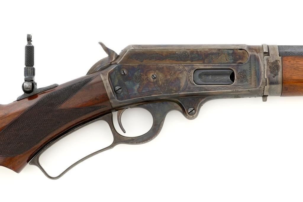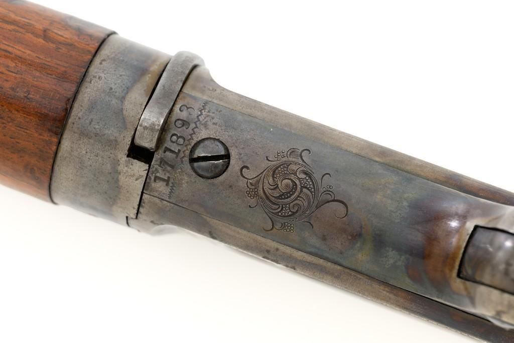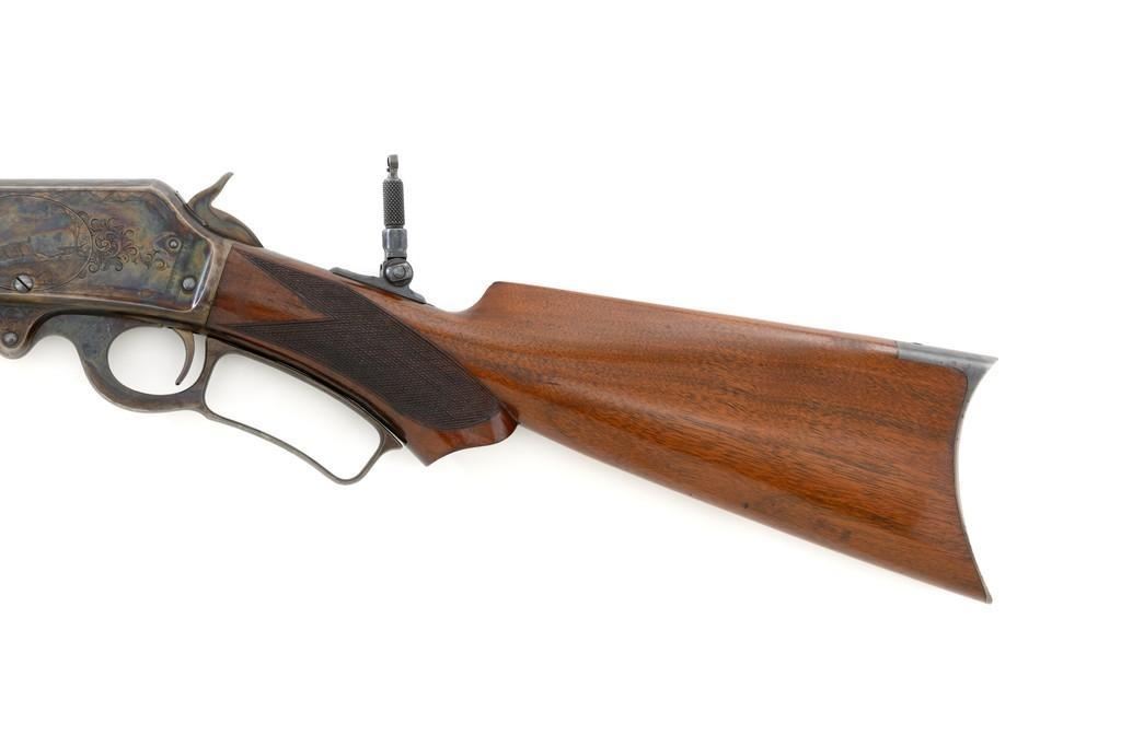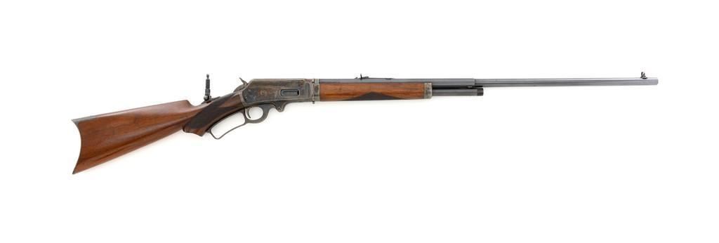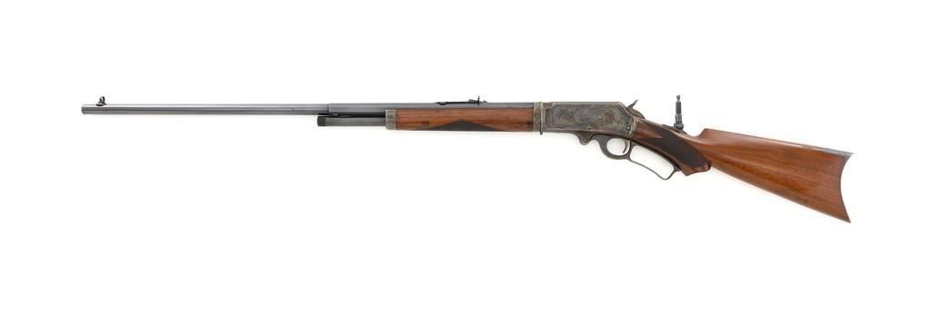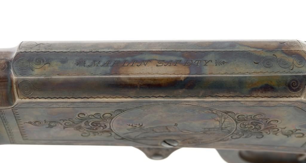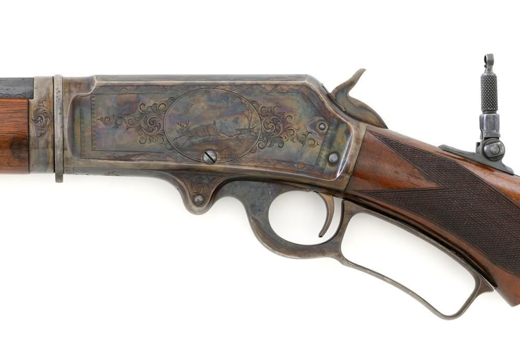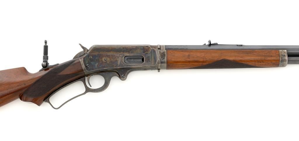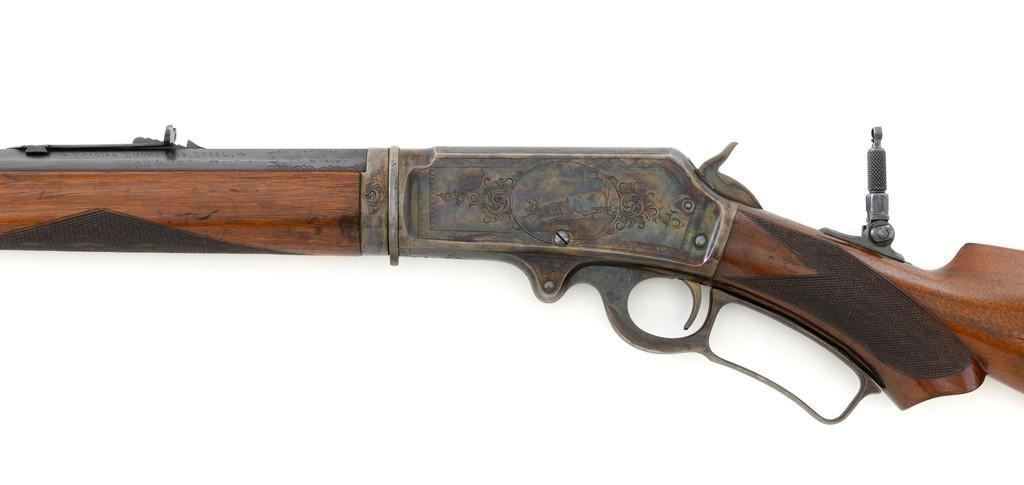 Engraved Special Order Marlin Deluxe Model 1893 Lever Action Takedown Rifle, #171893, .30-30 cal., 28'' blued half-octagon/half-round barrel with 1/2 magazine; finely checkered walnut forend and factory ''No. A'' pistol grip stock, ending with case hardened forend cap, takedown collar, and crescent buttplate. Special order Beach folding combination front sight and semi-buckhorn rear sight with elevator. With a period aperture sight at the upper tang. Grade No. 2 fine panel scene engraving to the color case hardened receiver is intricately engraved, likely by Conrad F. Ulrich, with game scenes depicting Whitetail bucks on both sides, surrounded by fine scroll patterns and border engraving. Additionally, there are scroll patterns on the color case hardened forend cap and takedown collar. Factory markings are clear, with a crisp barrel address, marked ''SPECIAL SMOKELESS STEEL'' on the left side of the barrel, and ''MARLIN SAFETY'' on top of the receiver. Mfg'd 1898. Rifle is in fine overall condition, retaining approx. 96%-97% toning finish on the barrel and magazine tube. Barrel shows light wear at the muzzle, with scattered light handling marks, minor scratches and freckles of patina. Receiver displays approx. 90% vivid color case hardened finish. There are light scratches and moderate finis wear to the loading gate. Additionally, there is a fine corresponding 1" scratch to the right side engraving behind the loading gate. There is some honest toning and wear on parts of the take down collar, lever, and buttplate; still case colors are strong in these areas and a majority remain. Wood is in fine condition, showing scattered mostly moderate indentations and scratches consistent with carry and use. Left side of the forend with a few larger impressions; checkering detail on both the stock and forend shows only a few spots of light wear and remains primarily crisp. Action is crisp and functions smoothly. Bore rates very good+ overall with defined rifling. An outstanding Model 1893. Est.: $15,000-$20,000. (Antique)