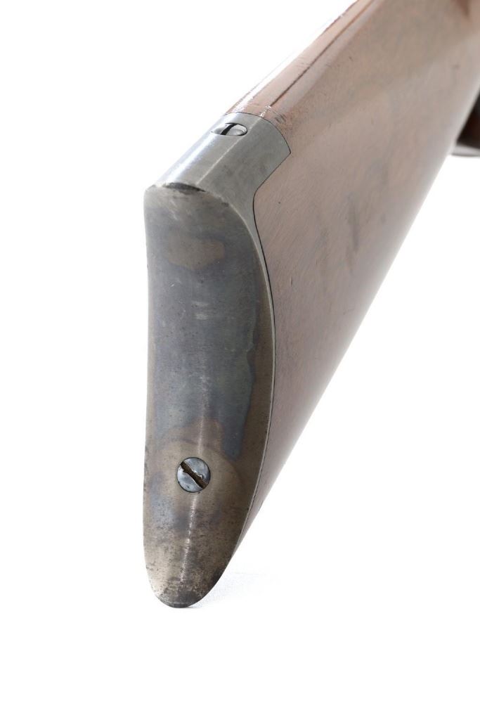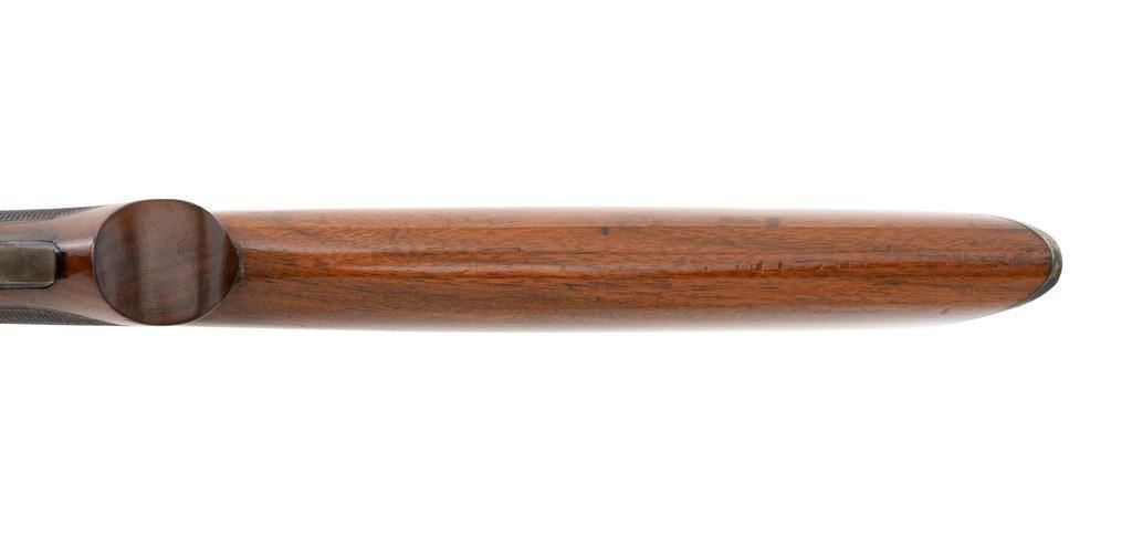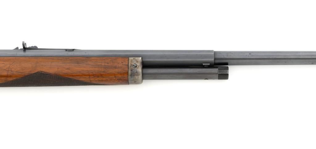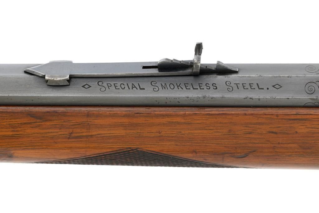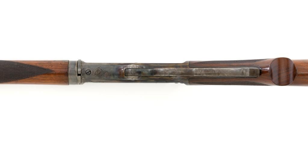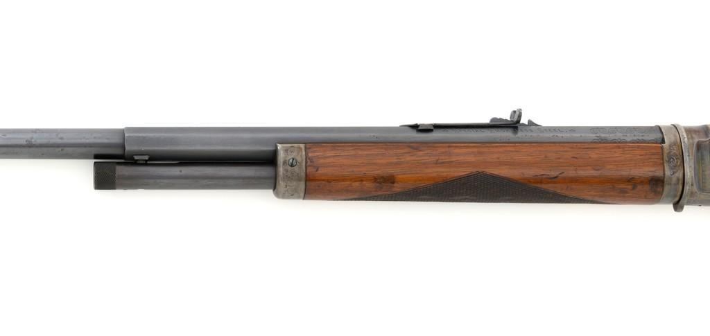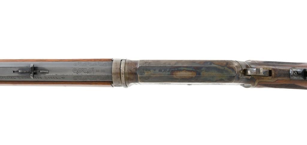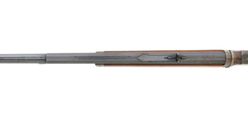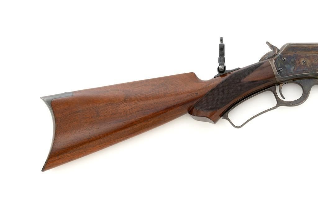Engraved Special Order Marlin Deluxe Model 1893 Lever Action Takedown Rifle, #171893, .30-30 cal., 28'' blued half-octagon/half-round barrel with 1/2 magazine; finely checkered walnut forend and factory ''No. A'' pistol grip stock, ending with case hardened forend cap, takedown collar, and crescent buttplate. Special order Beach folding combination front sight and semi-buckhorn rear sight with elevator. With a period aperture sight at the upper tang. Grade No. 2 fine panel scene engraving to the color case hardened receiver is intricately engraved, likely by Conrad F. Ulrich, with game scenes depicting Whitetail bucks on both sides, surrounded by fine scroll patterns and border engraving. Additionally, there are scroll patterns on the color case hardened forend cap and takedown collar. Factory markings are clear, with a crisp barrel address, marked ''SPECIAL SMOKELESS STEEL'' on the left side of the barrel, and ''MARLIN SAFETY'' on top of the receiver. Mfg'd 1898. Rifle is in fine overall condition, retaining approx. 96%-97% toning finish on the barrel and magazine tube. Barrel shows light wear at the muzzle, with scattered light handling marks, minor scratches and freckles of patina. Receiver displays approx. 90% vivid color case hardened finish. There are light scratches and moderate finis wear to the loading gate. Additionally, there is a fine corresponding 1" scratch to the right side engraving behind the loading gate. There is some honest toning and wear on parts of the take down collar, lever, and buttplate; still case colors are strong in these areas and a majority remain. Wood is in fine condition, showing scattered mostly moderate indentations and scratches consistent with carry and use. Left side of the forend with a few larger impressions; checkering detail on both the stock and forend shows only a few spots of light wear and remains primarily crisp. Action is crisp and functions smoothly. Bore rates very good+ overall with defined rifling. An outstanding Model 1893. Est.: $15,000-$20,000. (Antique)