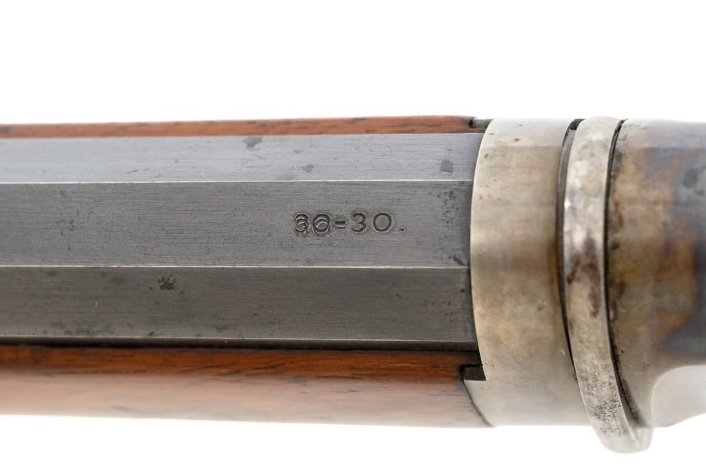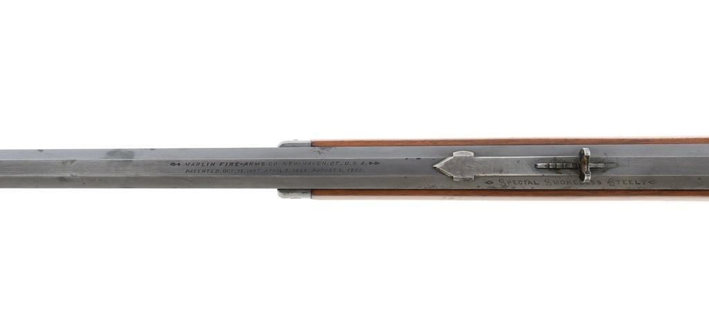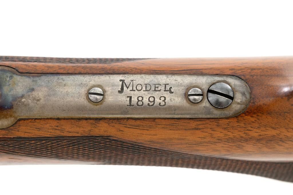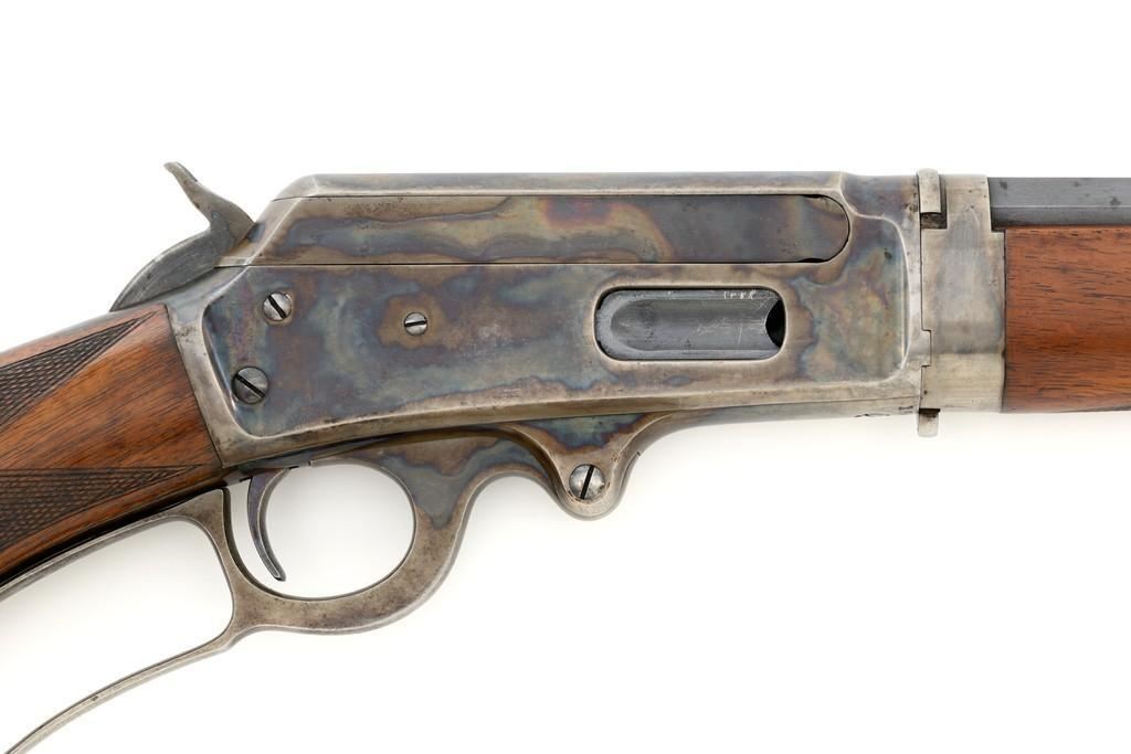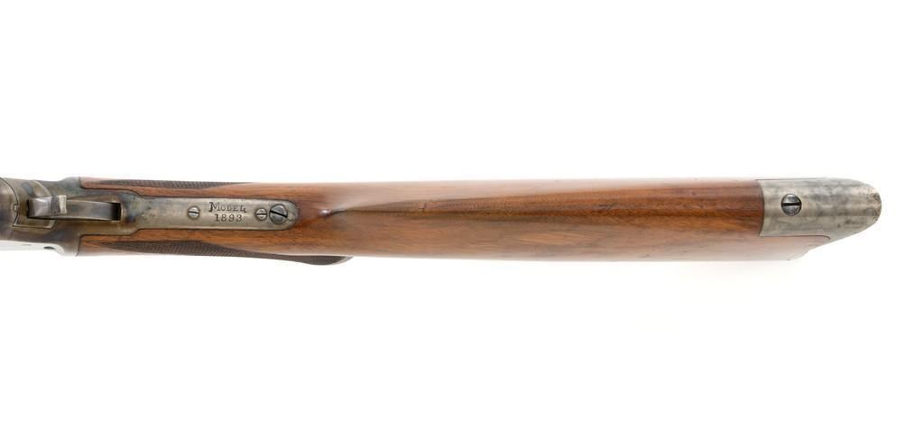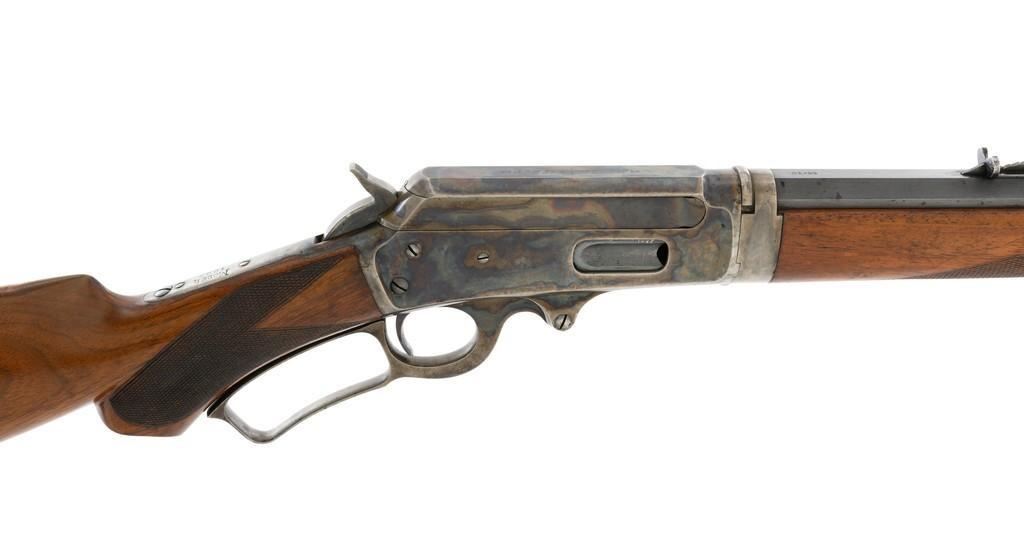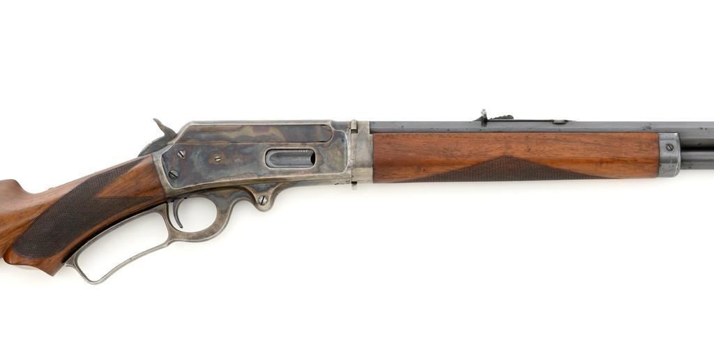 Marlin Model 1893 Lever Action Takedown Rifle, #164523, .30-30 cal., 30'' octagon barrel with 1/2 magazine, blue and color case hardened finish, checkered walnut forend and factory ''No. A'' pistol grip stock, case hardened crescent buttplate, dovetailed German silver blade front sight, and semi-buckhorn rear sight with elevator. Receiver, lever, and hammer are color case hardened. Factory markings are clear, with a crisp barrel address, marked ''SPECIAL SMOKELESS STEEL'' on the left side of the barrel, and ''MARLIN SAFETY'' on top of the receiver. Mfg'd 1898. Rifle is in fine overall condition, retaining approx. 95% blue on the barrel and magazine tube. There are several spots of light erosion on the right side of the barrel, most are located within 8'' down from the muzzle. Magazine shows scattered spots of mild surface erosion and frosting on the left side. Receiver and lever retain approx. 80%-85% vivid color case hardened finish, with toning and wear primarily to the lever and bottom of the frame. Buttplate with a few traces of case colors and is now mostly silver with scattered spots of patina. Stock is in fine condition, showing mostly moderate indentations and scratches, checkering detail is primarily crisp. Wood was likely cleaned and reoiled; new oil now shows age and some thinning. Action functions well and locks up securely. Bore rates very good+ and has well-defined rifling. Est.: $2,000-$3,000. (Antique)