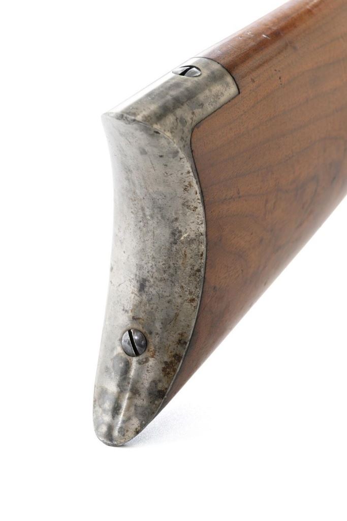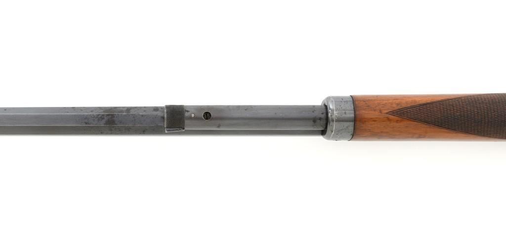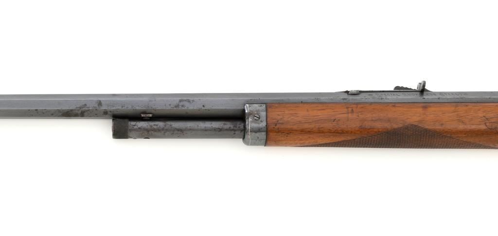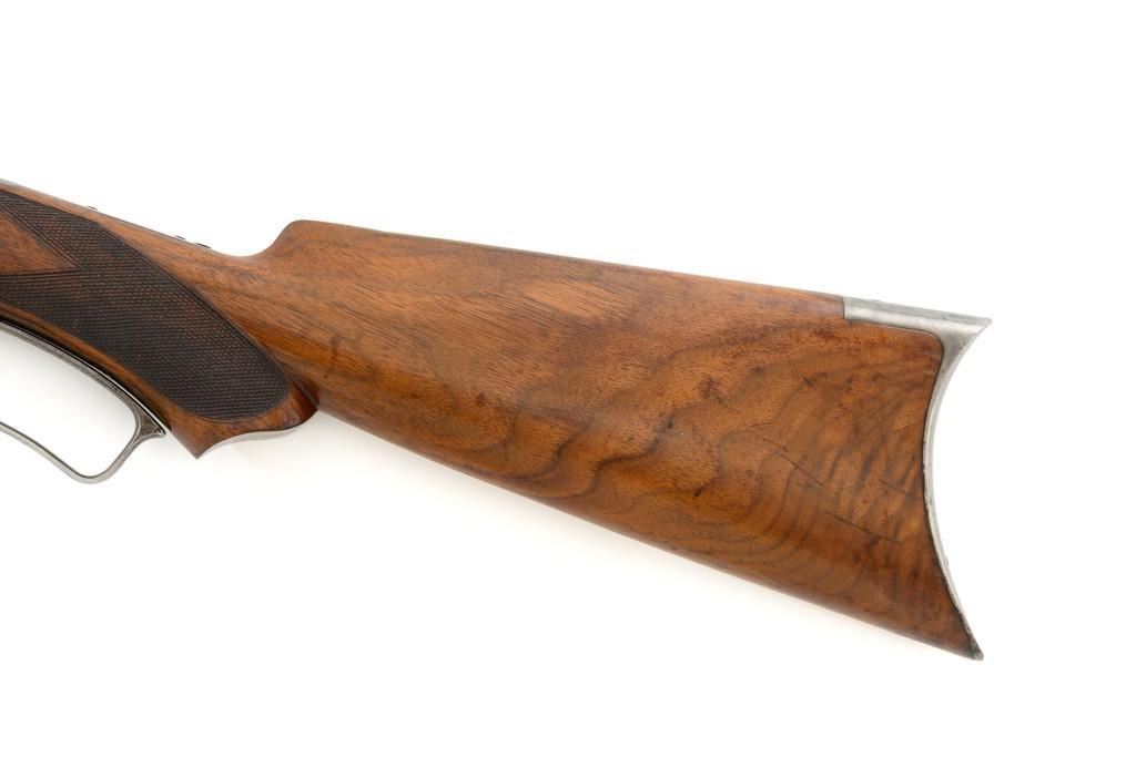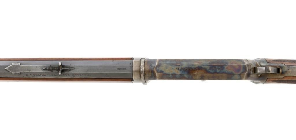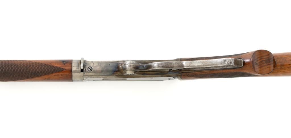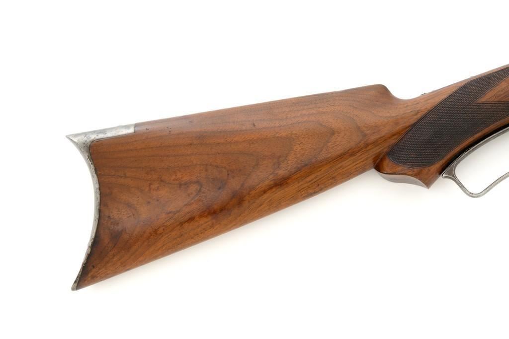 Marlin Model 1893 Lever Action Takedown Rifle, #164523, .30-30 cal., 30'' octagon barrel with 1/2 magazine, blue and color case hardened finish, checkered walnut forend and factory ''No. A'' pistol grip stock, case hardened crescent buttplate, dovetailed German silver blade front sight, and semi-buckhorn rear sight with elevator. Receiver, lever, and hammer are color case hardened. Factory markings are clear, with a crisp barrel address, marked ''SPECIAL SMOKELESS STEEL'' on the left side of the barrel, and ''MARLIN SAFETY'' on top of the receiver. Mfg'd 1898. Rifle is in fine overall condition, retaining approx. 95% blue on the barrel and magazine tube. There are several spots of light erosion on the right side of the barrel, most are located within 8'' down from the muzzle. Magazine shows scattered spots of mild surface erosion and frosting on the left side. Receiver and lever retain approx. 80%-85% vivid color case hardened finish, with toning and wear primarily to the lever and bottom of the frame. Buttplate with a few traces of case colors and is now mostly silver with scattered spots of patina. Stock is in fine condition, showing mostly moderate indentations and scratches, checkering detail is primarily crisp. Wood was likely cleaned and reoiled; new oil now shows age and some thinning. Action functions well and locks up securely. Bore rates very good+ and has well-defined rifling. Est.: $2,000-$3,000. (Antique)