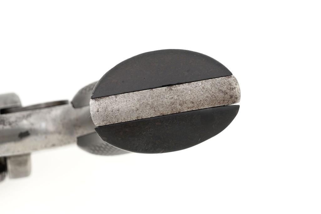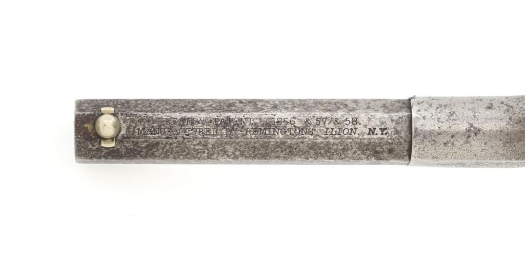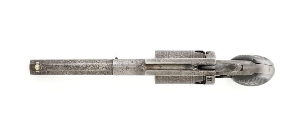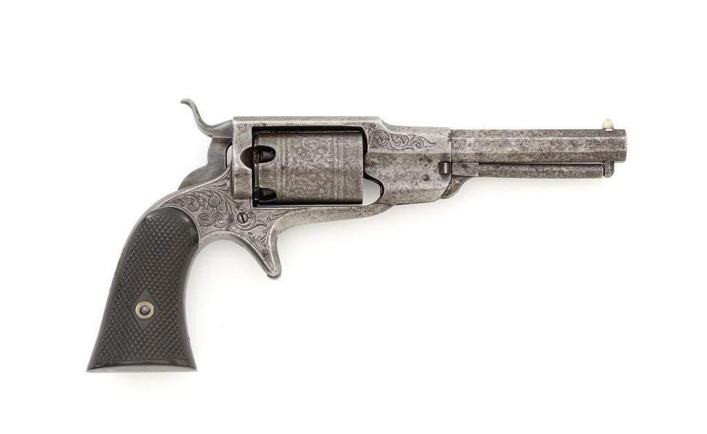 Scarce Engraved Remington-Beals 3rd Model Pocket Revolver, #162, .31 cal., 4'' octagon barrel, gray/brown patina, checkered hard rubber grips, silver cone front sight, and fixed ''V''-notch rear sight. Cylinder with etched scroll design. Frame with period floral scroll engraving. Barrel address is marked in two-lines "BEALS PATENT 1856 & 57, & 58./MANUFACTURED BY REMINGTONS ILION, N.Y.". Matching numbers located on left side of the grip frame, underside of the barrel, and back of each grip panel. The 3rd Model was only manufactured between 1859 & 1860, with a production quantity of only approx. 1,000 . Overall condition of this revolver is good, displaying an even gray color across the metal surfaces, mixed with spots of darker patina, intermittent light pinprick pitting and mild erosion. Barrel address is clear. Engraving on the frame is crisp. Etching on the cylinder is clearly visible. Grips are near excellent, showing only minor handling marks. Action is crisp. Rifling is clearly defined; bore with moderate+ surface erosion scattered throughout. Est.: 1,000-$1,500. (Antique)(Michael Strietbeck Collection)