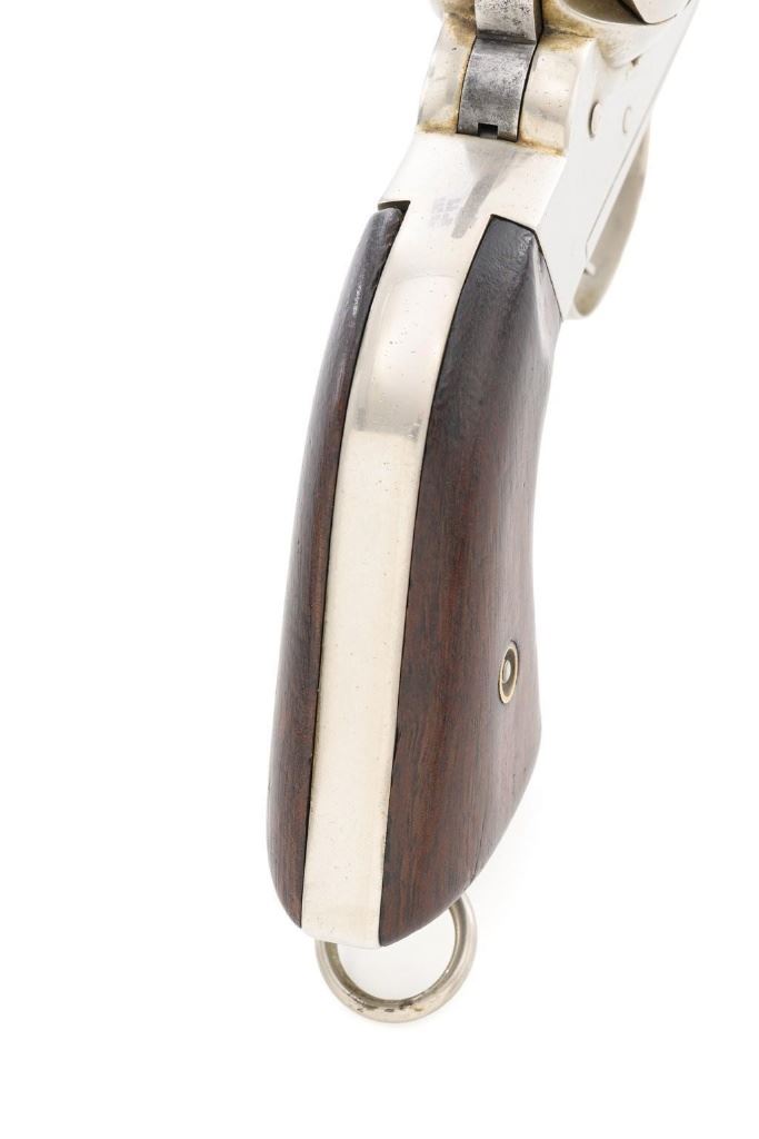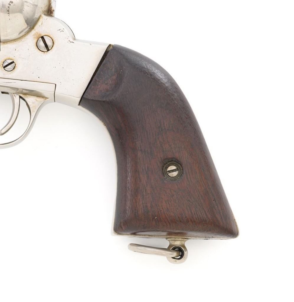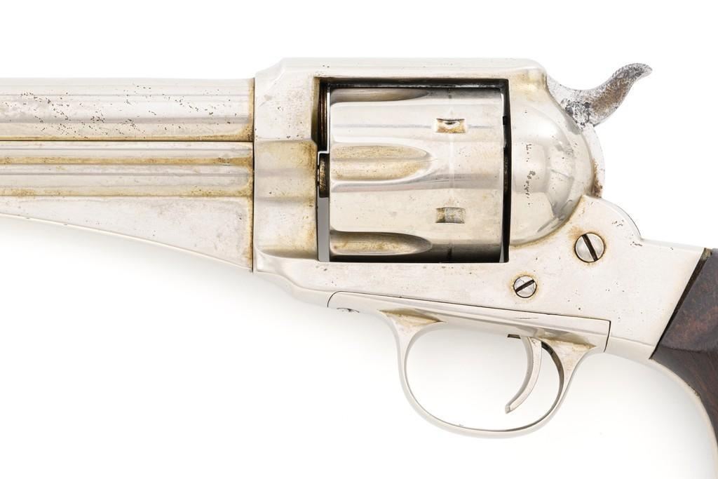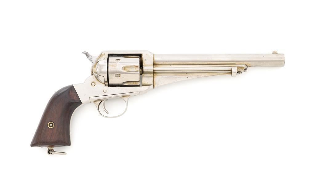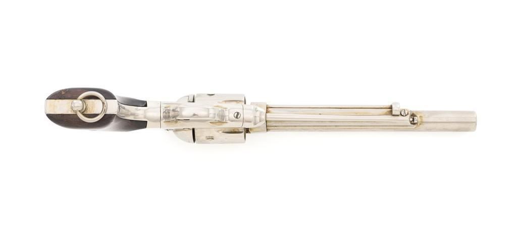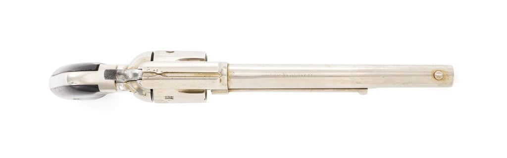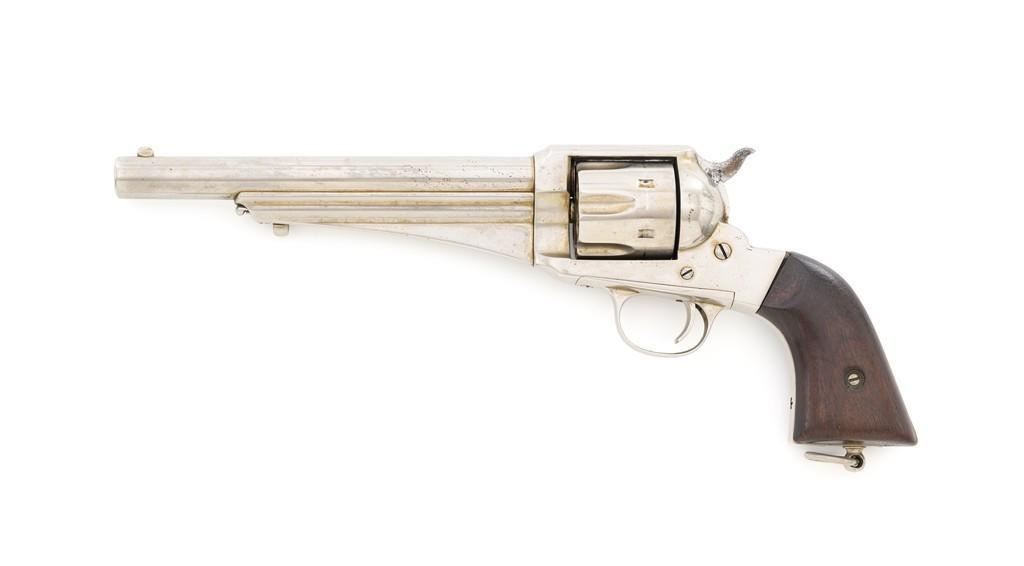 Remington Model 1875 Single Action Revolver, #13576, .45 LC cal., 7.5'' barrel, re-nickeled finish, two-piece smooth walnut grips, fixed blade front sight and notched rear sight, with lanyard ring at the butt. Barrel address is partially legible and reads from breech to muzzle ''MINGTON & SONS. ILION, N.Y. U.S.A.'' Back of the cylinder is marked ''45''. Serial number located on left side of grip frame. The Remington Model 1875 was manufactured circa 1875-1889, with approx. 25,000-30,000 produced, although a majority were chambered in .44 caliber. Overall condition is fine, displaying a smooth and soft lightly cleaned appearance, with straw colored hues in the protected areas, scattered specks of light pitting, particularly on right side of the frame. Grips are also fine with pleasing grain patterns & retention of their rich oil finish, with scattered light handling marks. Action is crisp and cycles smoothly. Bore with scattered spots of light erosion, rifling is clearly defined and rates very good overall. Est.: $1,500-$2,000. (Antique)(Michael Strietbeck Collection)