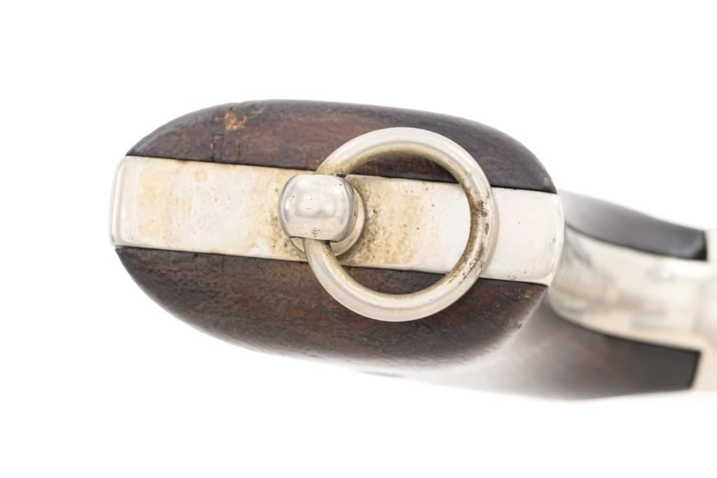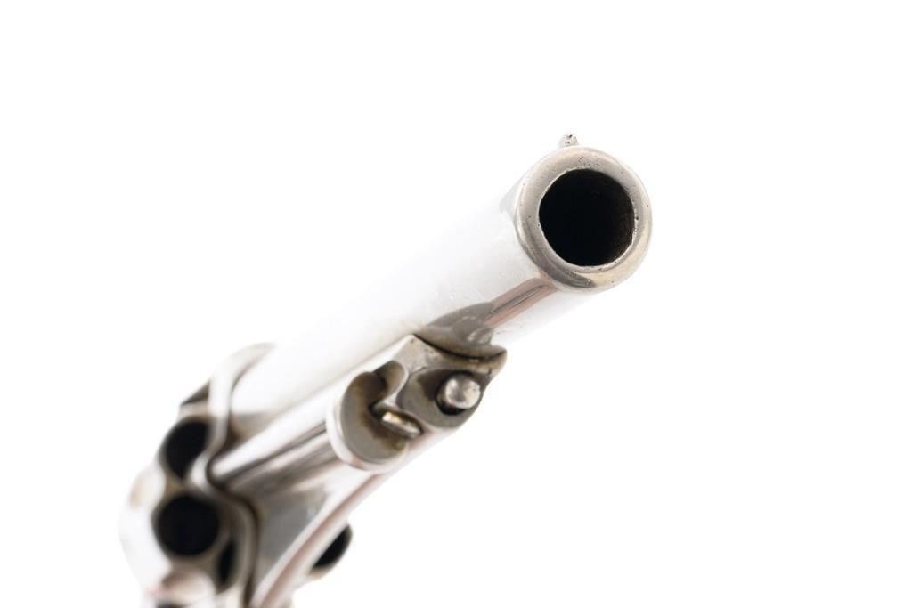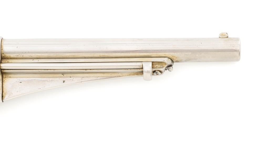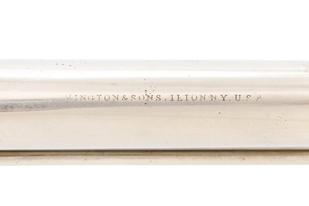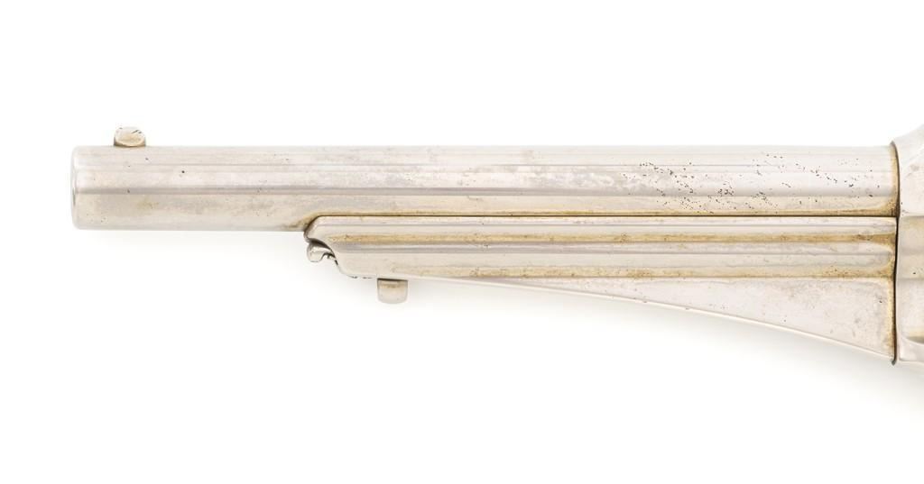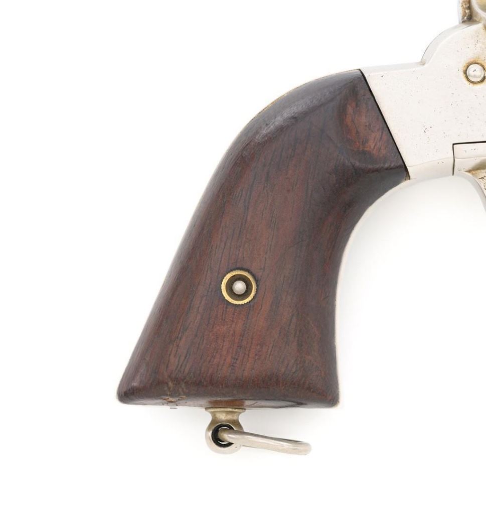 Remington Model 1875 Single Action Revolver, #13576, .45 LC cal., 7.5'' barrel, re-nickeled finish, two-piece smooth walnut grips, fixed blade front sight and notched rear sight, with lanyard ring at the butt. Barrel address is partially legible and reads from breech to muzzle ''MINGTON & SONS. ILION, N.Y. U.S.A.'' Back of the cylinder is marked ''45''. Serial number located on left side of grip frame. The Remington Model 1875 was manufactured circa 1875-1889, with approx. 25,000-30,000 produced, although a majority were chambered in .44 caliber. Overall condition is fine, displaying a smooth and soft lightly cleaned appearance, with straw colored hues in the protected areas, scattered specks of light pitting, particularly on right side of the frame. Grips are also fine with pleasing grain patterns & retention of their rich oil finish, with scattered light handling marks. Action is crisp and cycles smoothly. Bore with scattered spots of light erosion, rifling is clearly defined and rates very good overall. Est.: $1,500-$2,000. (Antique)(Michael Strietbeck Collection)