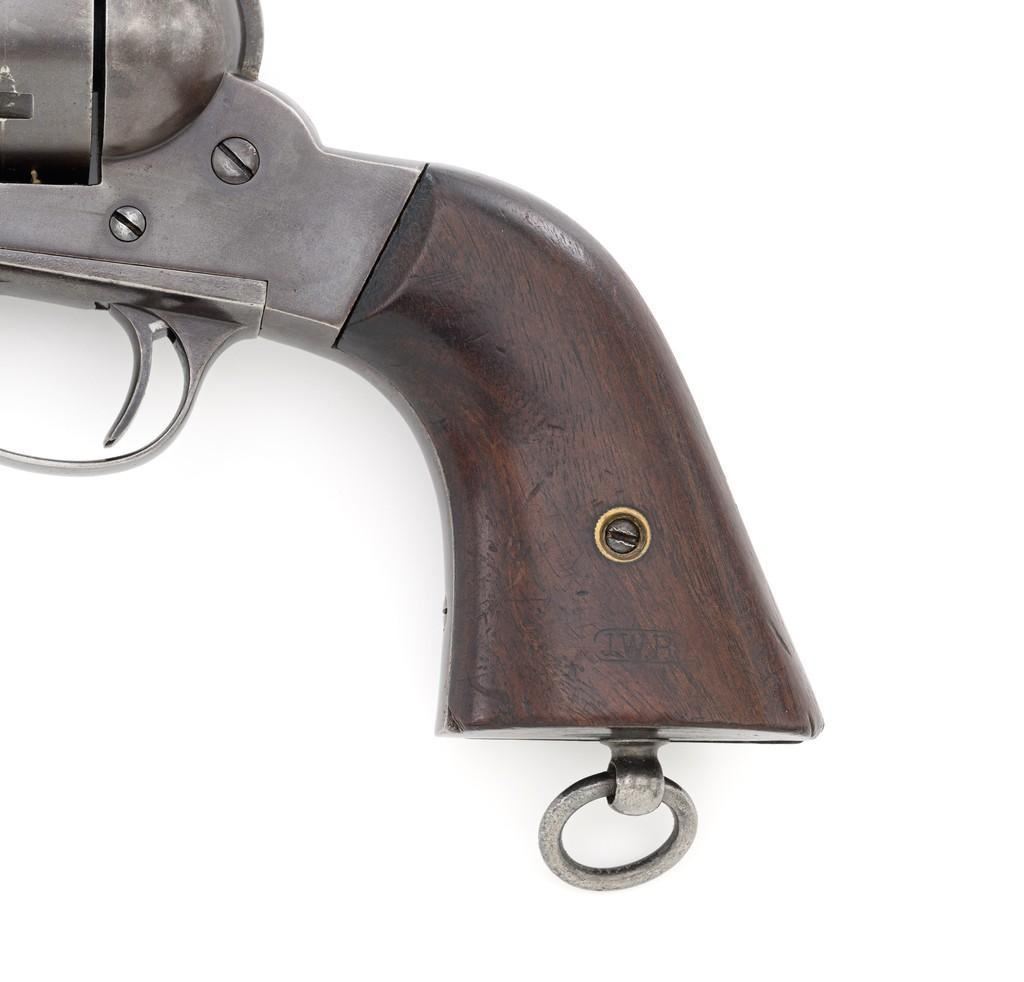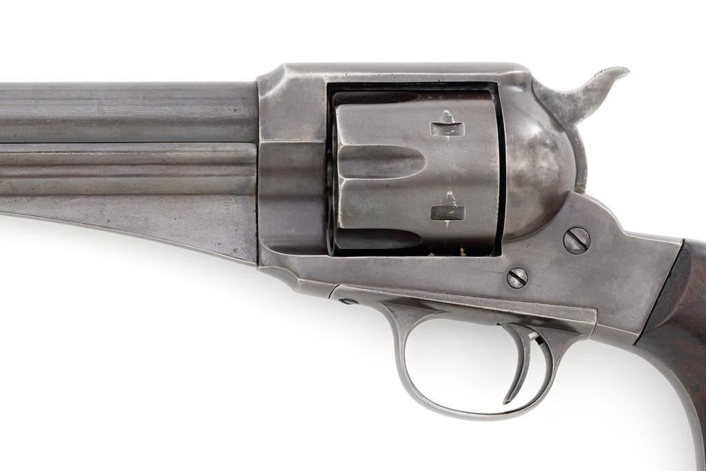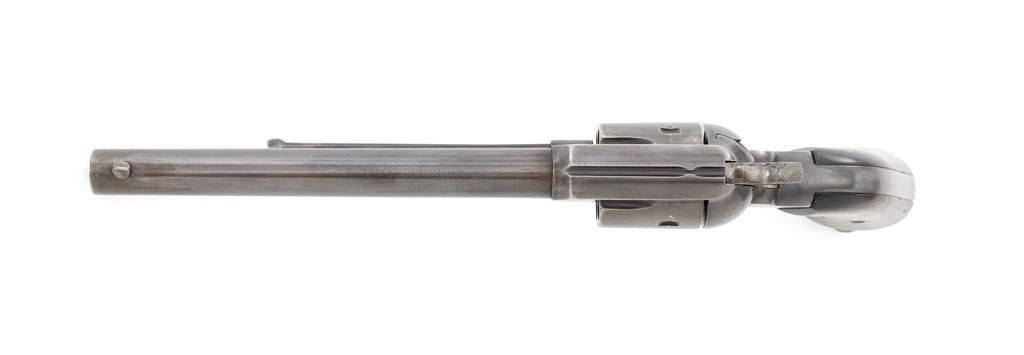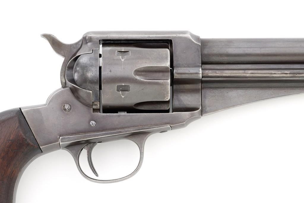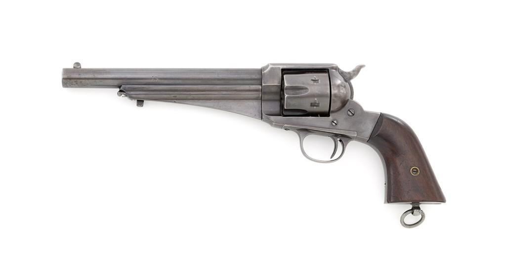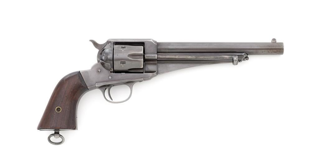 Scarce Egyptian Contract Remington Model 1875 Single Action Revolver, #12415, .44 Rem. cal., 7.5'' round barrel, blue finish, smooth walnut grips, ''pinched'' blade front sight, fixed ''U''-notch rear sight, with lanyard ring. Barrel address reads from breech to muzzle "E. REMINGTON & SONS. ILION, N.Y. U.S.A." Serial number located on left side of the grip frame and back of each grip in pencil. There is a small ''(star)R'' located on left side of the barrel and another is very faintly marked on left side of the frame; both are adjacent of each other. Walnut grips with ''JWR'' inspector's cartouche (James W. Reilly, Major) on the bottom left grip panel. One of approx. 10,000 that were ordered by the Egyptian government, exact numbers are unknown but only a small quantity were made or delivered. Revolver is in good condition with an overall smooth brown patina to the metal, showing evidence of light cleaning and likely an old refinish. There are some intermittent specks of light pitting, primarily on the barrel assembly. Barrel address is legible. Proof mark on the barrel is light but visible; frame is very faint and partially visible. Grips are fine with clear inspector's cartouche, showing moderate age and wear. Action is crisp. Bore with scattered light to moderate erosion; rifling is good. Est.: $2,500-$3,500. (Antique)(Michael Strietbeck Collection)
