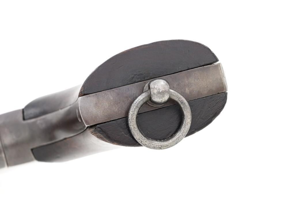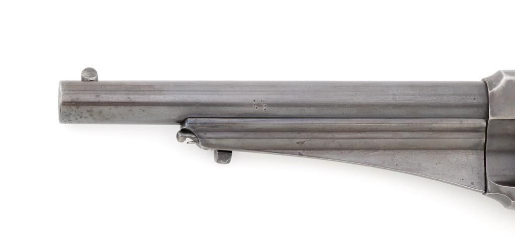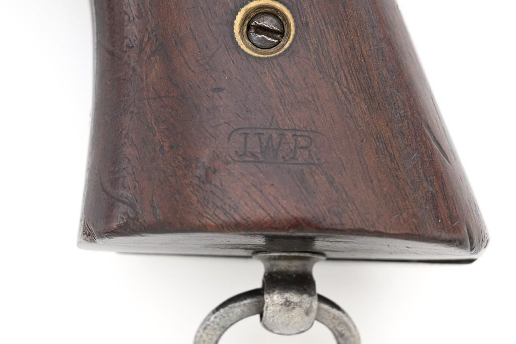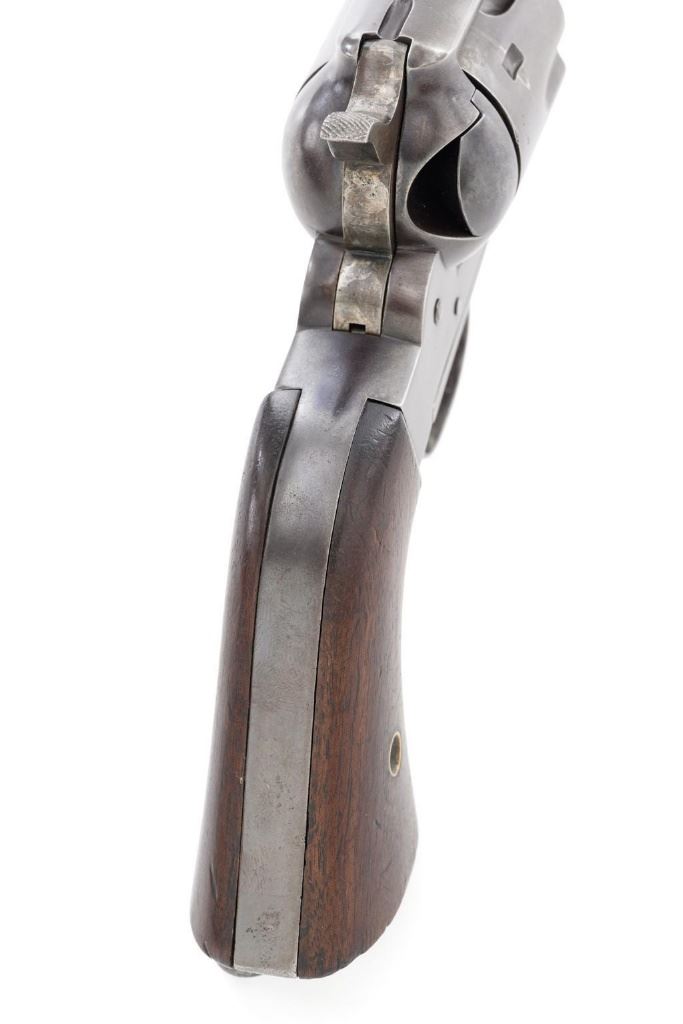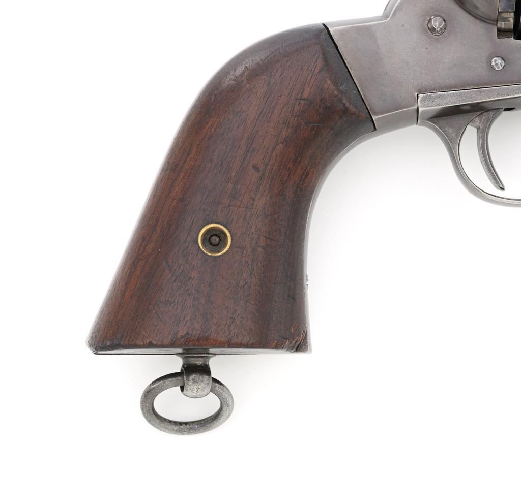 Scarce Egyptian Contract Remington Model 1875 Single Action Revolver, #12415, .44 Rem. cal., 7.5'' round barrel, blue finish, smooth walnut grips, ''pinched'' blade front sight, fixed ''U''-notch rear sight, with lanyard ring. Barrel address reads from breech to muzzle "E. REMINGTON & SONS. ILION, N.Y. U.S.A." Serial number located on left side of the grip frame and back of each grip in pencil. There is a small ''(star)R'' located on left side of the barrel and another is very faintly marked on left side of the frame; both are adjacent of each other. Walnut grips with ''JWR'' inspector's cartouche (James W. Reilly, Major) on the bottom left grip panel. One of approx. 10,000 that were ordered by the Egyptian government, exact numbers are unknown but only a small quantity were made or delivered. Revolver is in good condition with an overall smooth brown patina to the metal, showing evidence of light cleaning and likely an old refinish. There are some intermittent specks of light pitting, primarily on the barrel assembly. Barrel address is legible. Proof mark on the barrel is light but visible; frame is very faint and partially visible. Grips are fine with clear inspector's cartouche, showing moderate age and wear. Action is crisp. Bore with scattered light to moderate erosion; rifling is good. Est.: $2,500-$3,500. (Antique)(Michael Strietbeck Collection)