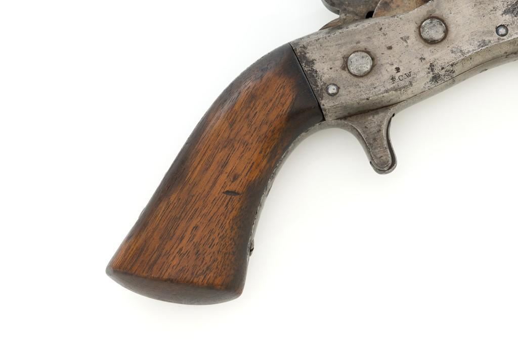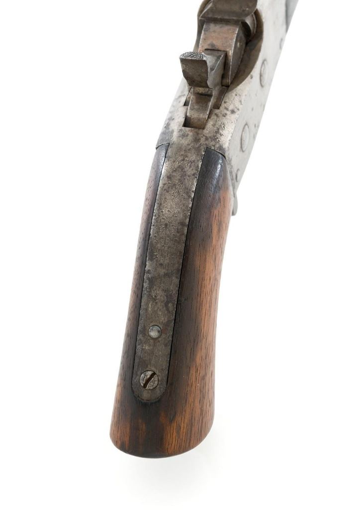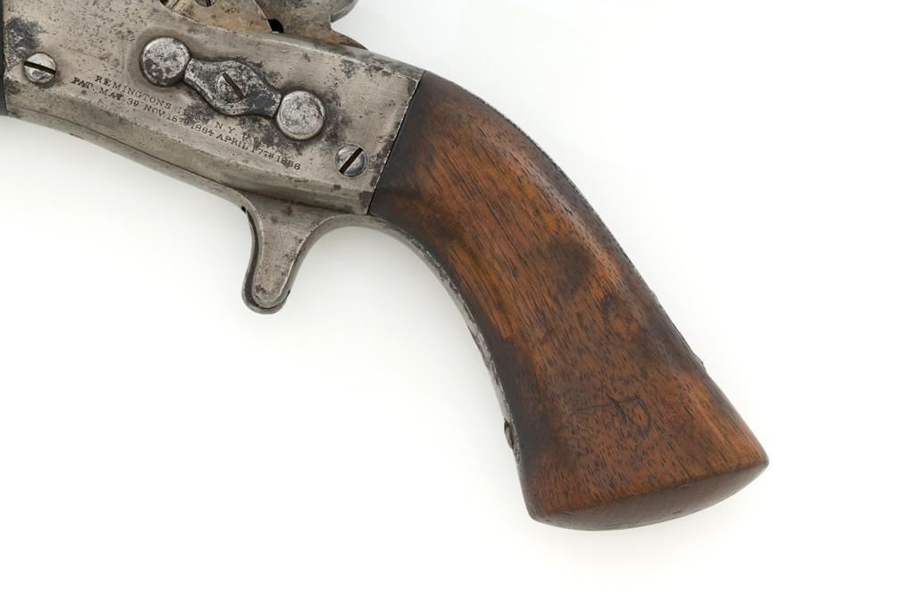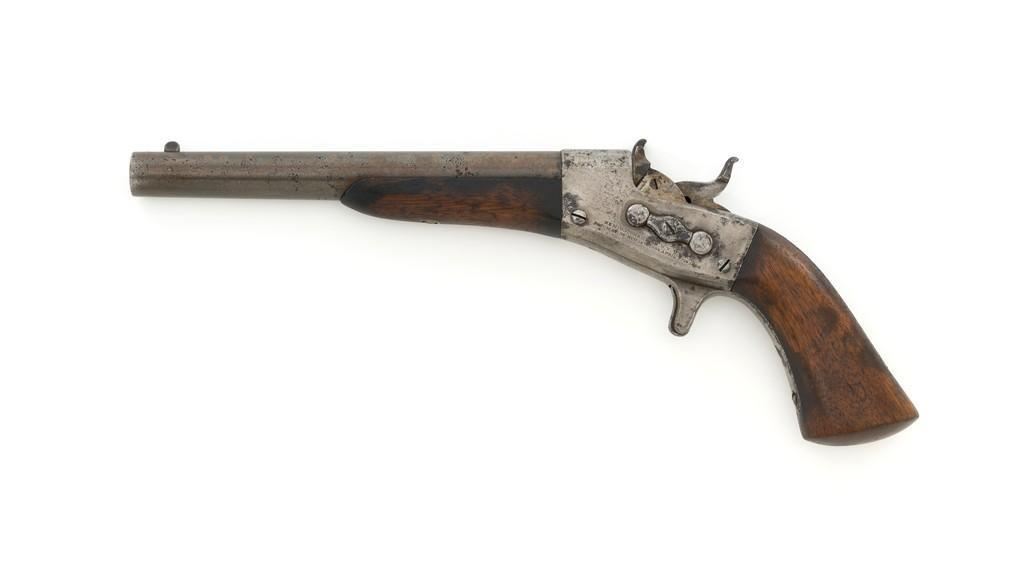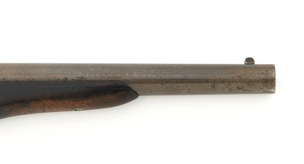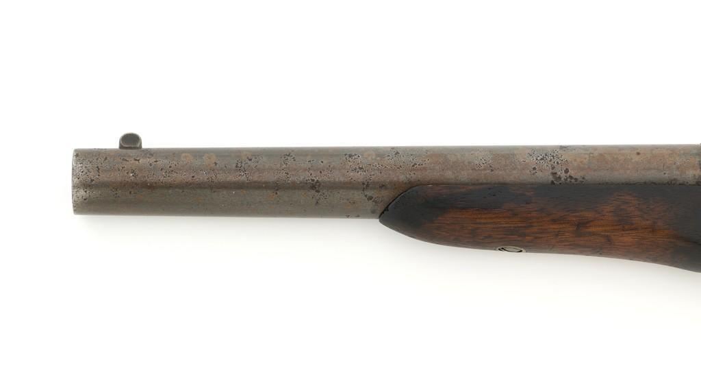 Martially Marked Remington Model 1865 Navy Rolling Block Pistol, #NVSN, .50 RF cal.,8.5'' round barrel, blued and case hardened finish, walnut one-piece grip and forend, fixed blade front sight, and small notched groove located on the breechblock. Top of barrel is marked with small naval anchor near the breech. No barrel address or serial number on the barrel. Left side of the frame is marked in two-lines with makers information and ''April 17th 1866'' last patent date. There is a small ''P / F.C.W.'' inspector's stamp on the right side of the frame. Left side of the grip with remnants of an inspector's cartouche. Mfg'd circa 1866-70. Pistol is in overall good condition, presenting a gray patina to all the gun's parts with scattered areas of light to moderate erosion. Factory markings are legible. Grip and forend are both in good condition, showing scattered nicks and mars from handling, plus dark staining around edges. Action is crisp. Bore is good with defined rifling, and intermittent small spots of light erosion. One of only approximately 6,500 made under official contract to the U.S. Navy from 1866 to 1870. Est.: $1,500-$2,000. (Antique)(Michael Strietbeck Collection)