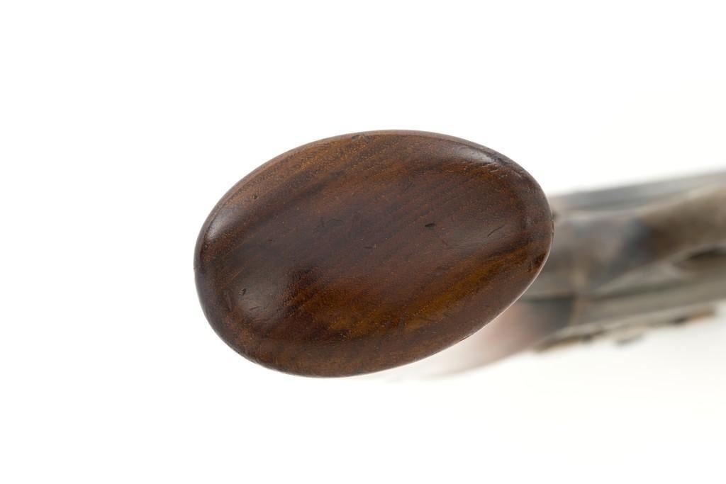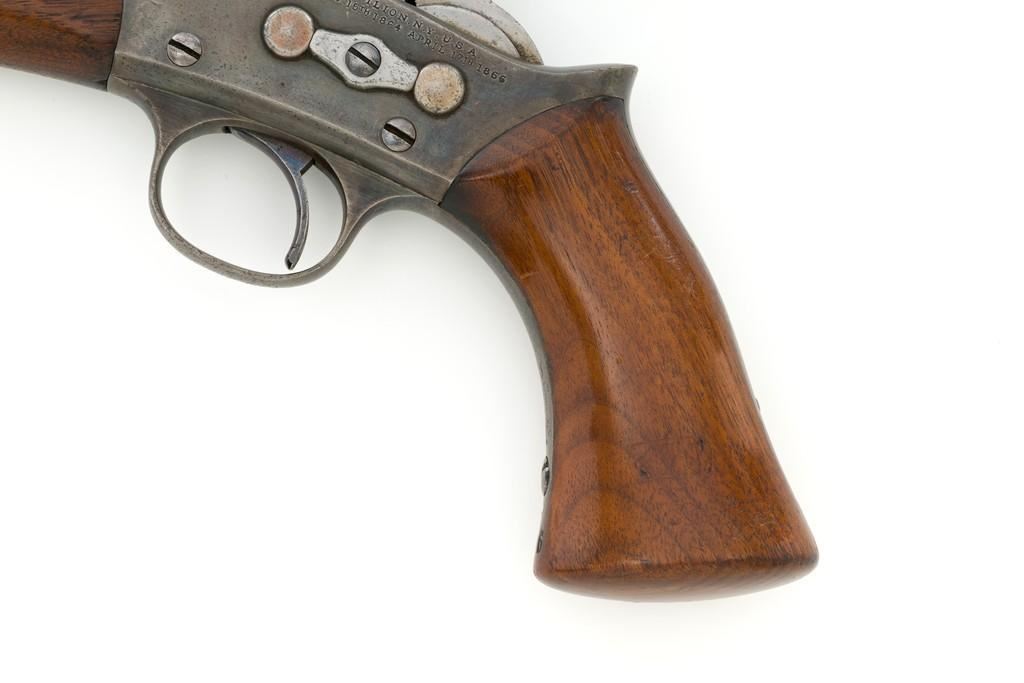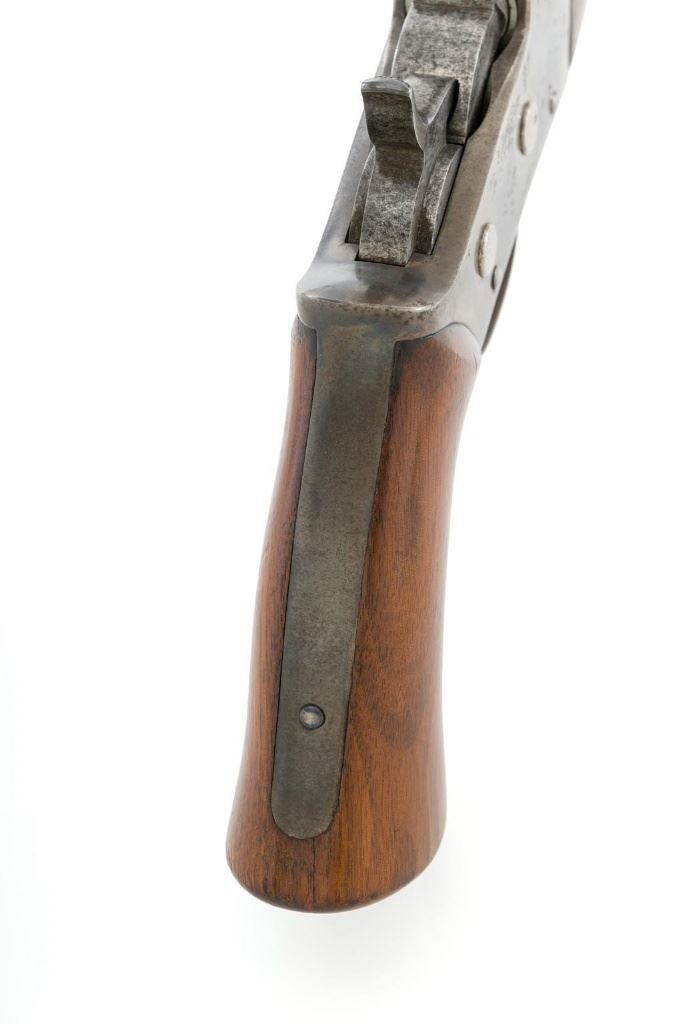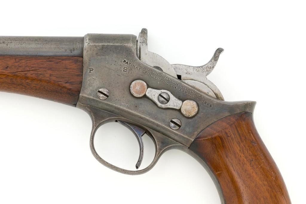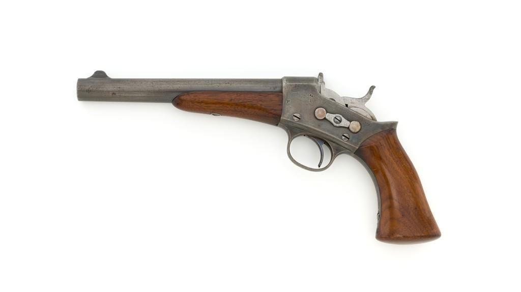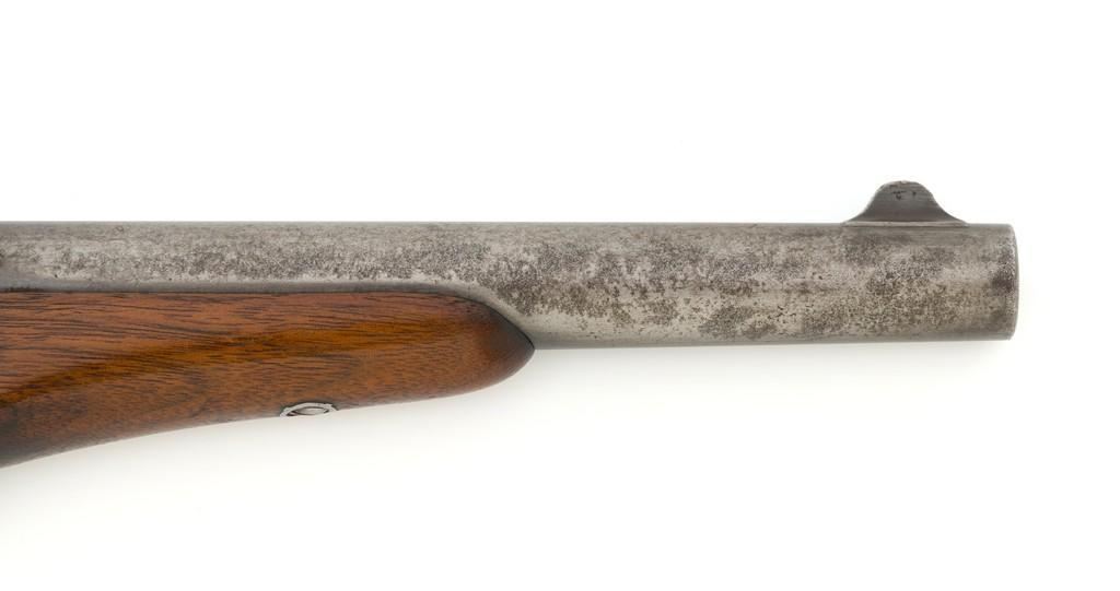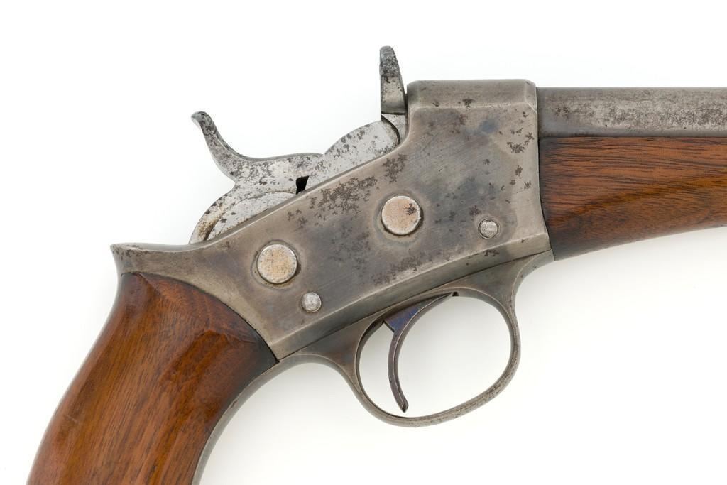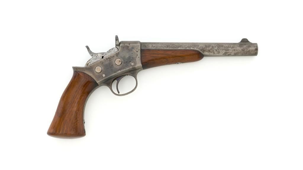 Martially Marked Remington Model 1871 Rolling Block Army Pistol, Smoothbore Conversion, #2280, .50 CF cal., 8'' round barrel, blue and case hardened finish, walnut one-piece grip and forend, fixed blade front sight, with small ''V''-notched groove located on the breechblock. There are a ''P'' and ''S'' inspector's markings on the left side of the frame and it is marked in two-lines with makers information and ''April 17th 1866'' last patent date. ''CRS'' inspector's cartouche on the left grip. ''306'' is stamped on the grip below the front tang. Overall condition of this pistol is fine, displaying a silver/gray patina to the exposed portion of the barrel, with considerable finish under the forend. There are approx. 40% toning case colors visible on the frame & small parts plus traces of niter blue on the trigger. Grip was lightly sanded and revarnished, now with general light marks, the inspectors cartouche is light but legible. Action is crisp. Bore is very good, showing moderate wear, no erosion. Approx. 6,000 of these pistols were produced. It is believed that these smoothbore conversions were done by a few different commercial companies, to fire a shotshell type variation of the .50 CF cal. Est.: $1,000-$1,500. (Antique)(Michael Strietbeck Collection)