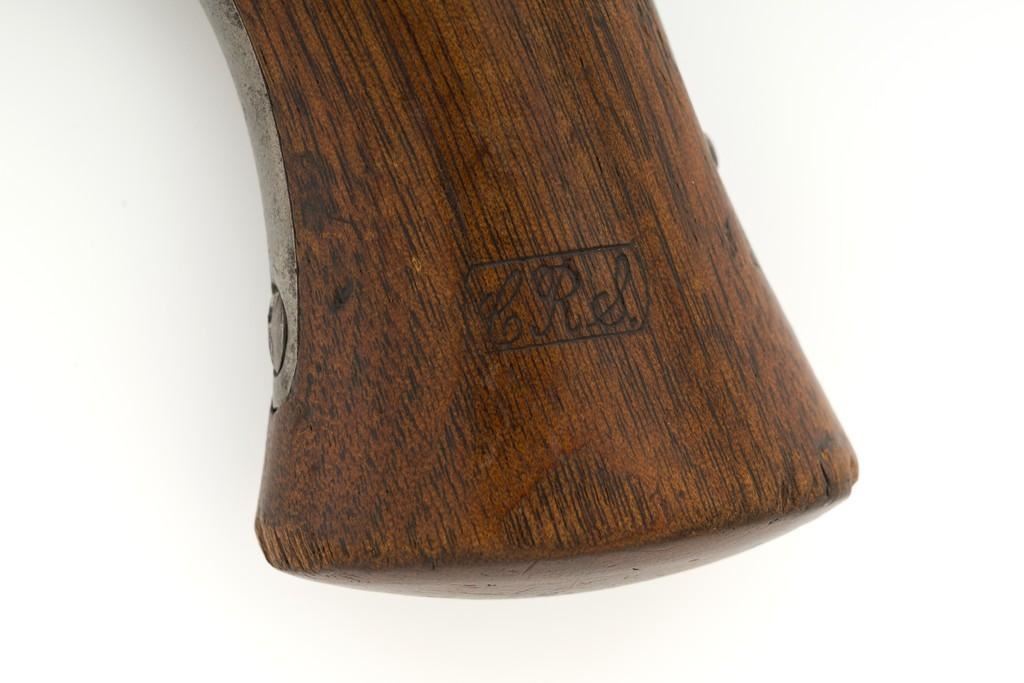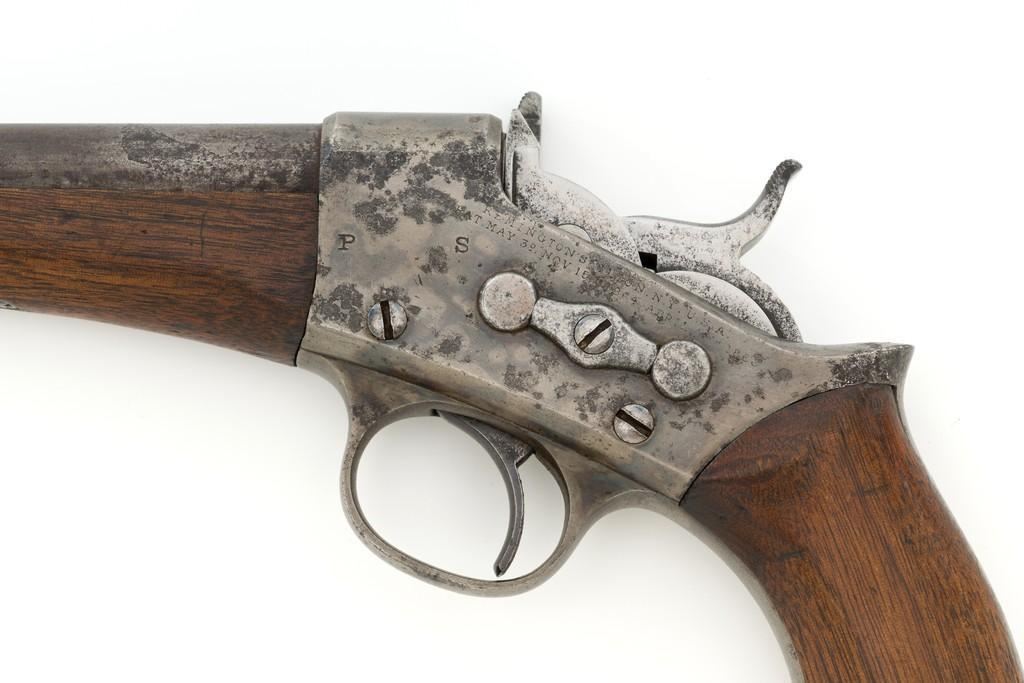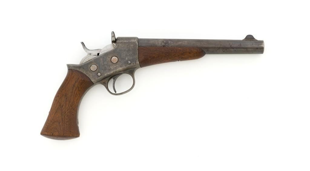 Martially Marked Remington Model 1871 Rolling Block Army Pistol, #429, .50 CF cal., 8'' round barrel, blue and case hardened finish, walnut one-piece grip and forend, fixed blade front sight, with small ''V''-notched groove located on the breechblock. There are a ''P'' and ''S'' inspector's markings on the left side of the frame and it is marked in two-lines with makers information and ''April 17th 1866'' last patent date. Left side of the grip with ''CRS'' inspector's cartouche. Matching assembly numbers ''337'' on left side of the grip straps. Inside of the grip is numbered (475) but does not match. Overall condition is good, displaying approx. 25% thinning and toning blue finish, with a few spots of moderate erosion on the barrel. Approx. 40%-45% muted and toning case colors remain, with erosion on the sides of the frame. Grip and forend are good, showing expected marks from age and use, with a clear grip cartouche. Action is crisp. Bore rates very good with defined rifling and no significant surface blemishes. Est.: $1,200-$1,800. (Antique)(Michael Strietbeck Collection)