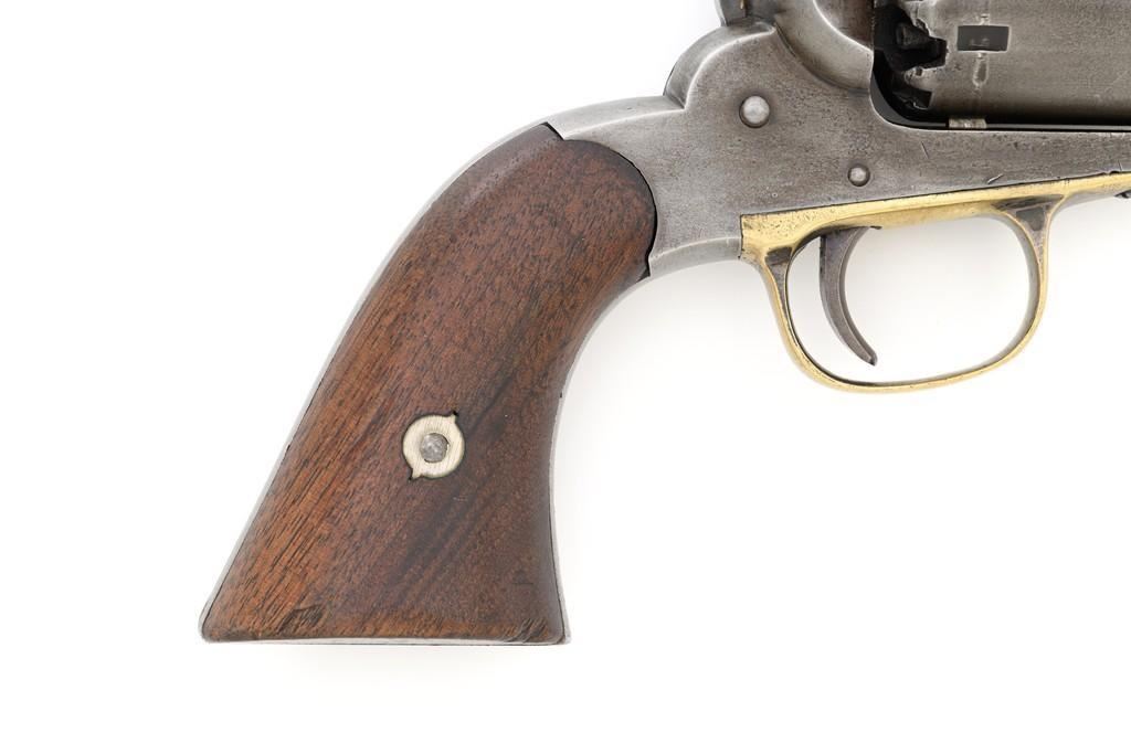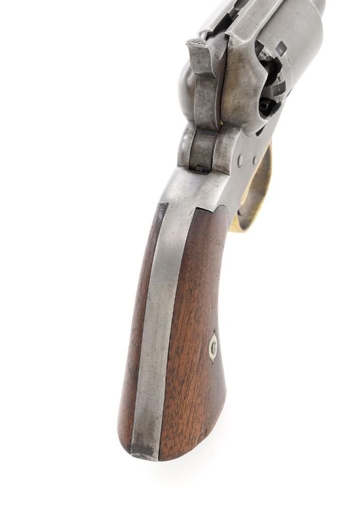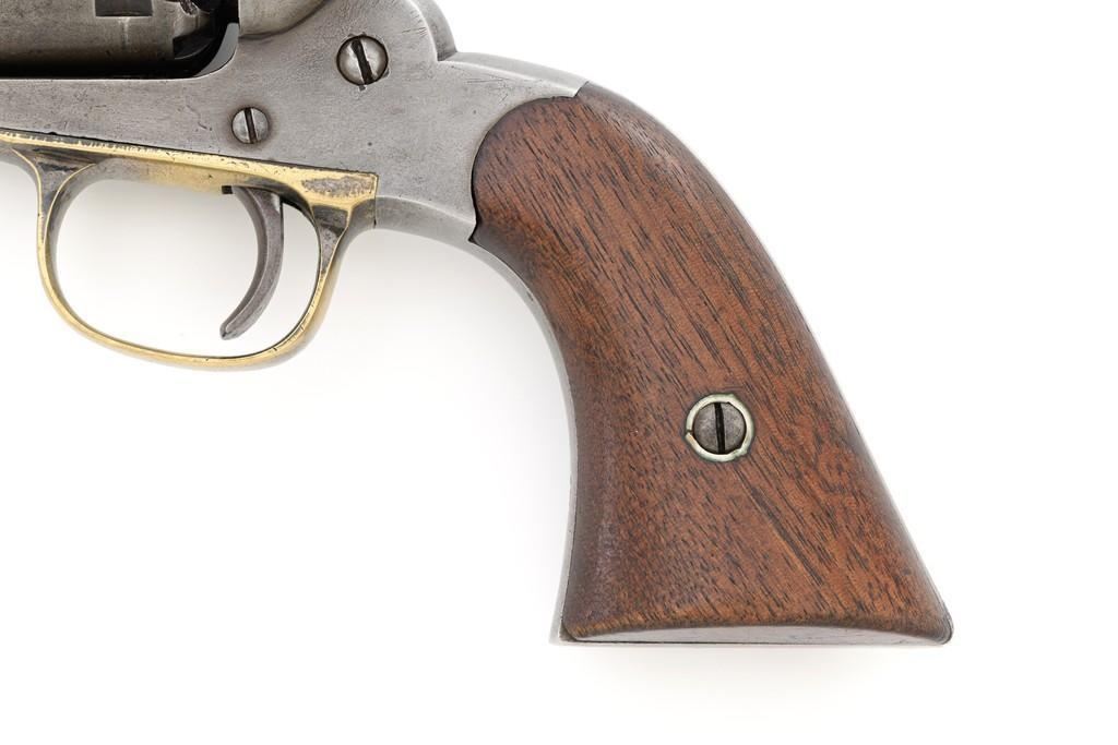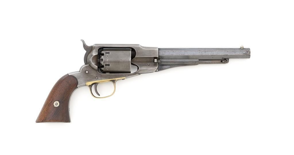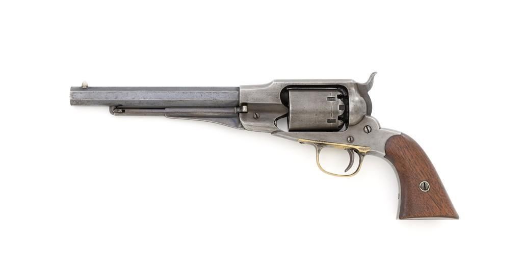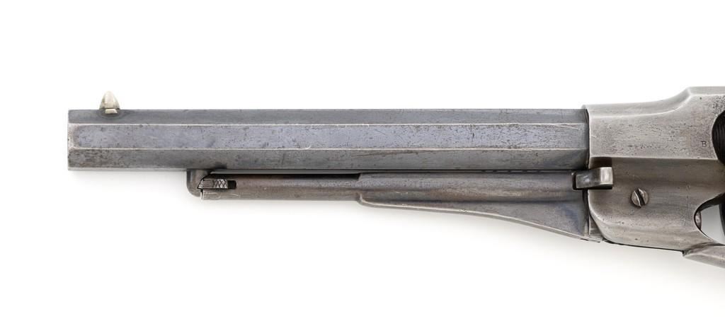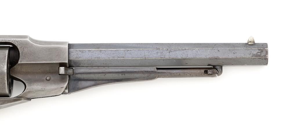 Remington Transitional New Model Navy Civilian Single Action Percussion Revolver, #23187, .36 cal., 7-3/8'' octagon barrel, blued finish, brass trigger guard, two-piece smooth walnut grips, silver cone front sight, and ''U''-shaped rear sight. Barrel is marked in two-lines ''PATENTED SEPT. 14, 1858/E. REMINGTON & SONS. ILION NEW YORK, U.S.A.'' No ''New Model'' markings and this revolver still features some of the earlier features found on the Model 1861 Navy revolver. Other markings include a small ''B'' stamped on the left front side of the frame. Matching numbers on left side of the grip frame and underside of the barrel. Back of the cylinder is marked ''3170E''. Condition is very good, retaining approx. 45% blue, located primarily on the barrel and lever. Balance of the metal has an even gray appearance, with some areas of mild pin prick pitting. Barrel address is clear. Left grip rates as fine showing moderate signs of age and wear; right grip with a few more noticeable impressions and small chip from the lower edge. Action is crisp. Bore is very good with scattered spots of moderate erosion. Est.: $1,200-$1,800. (Antique)(Michael Strietbeck Collection)