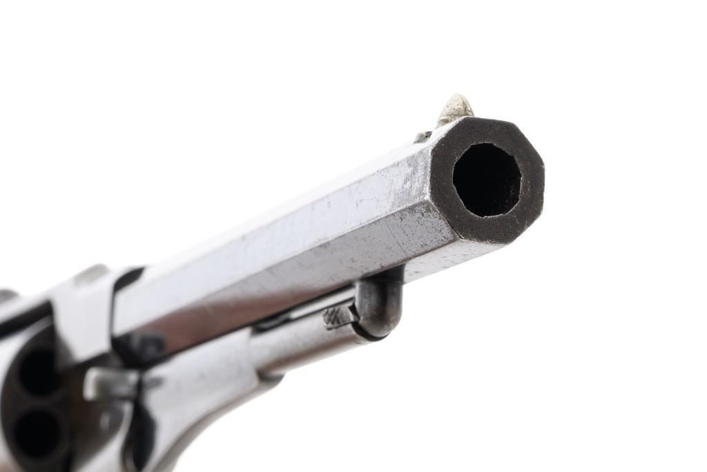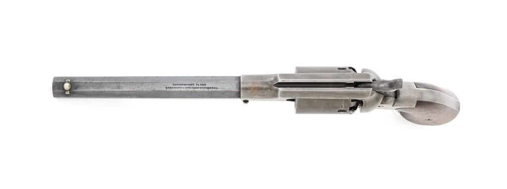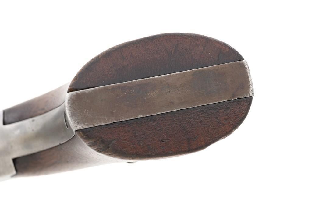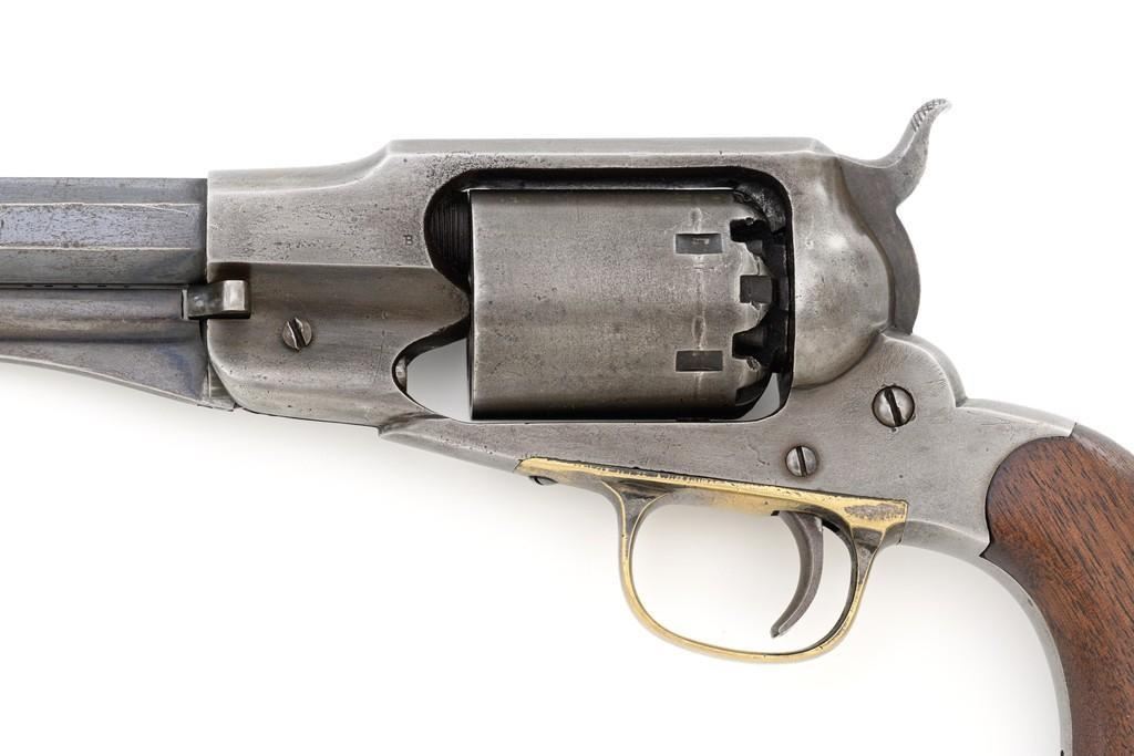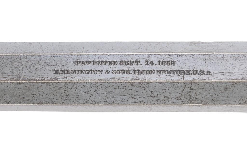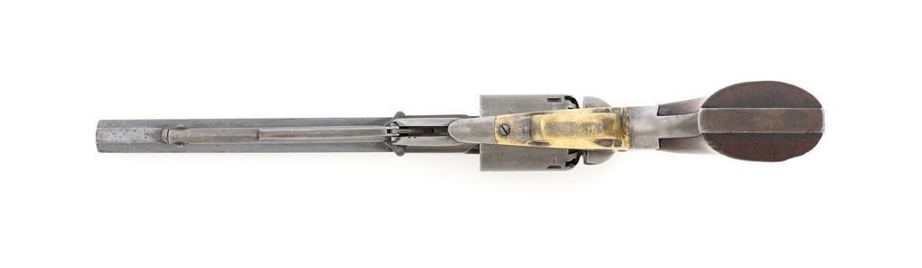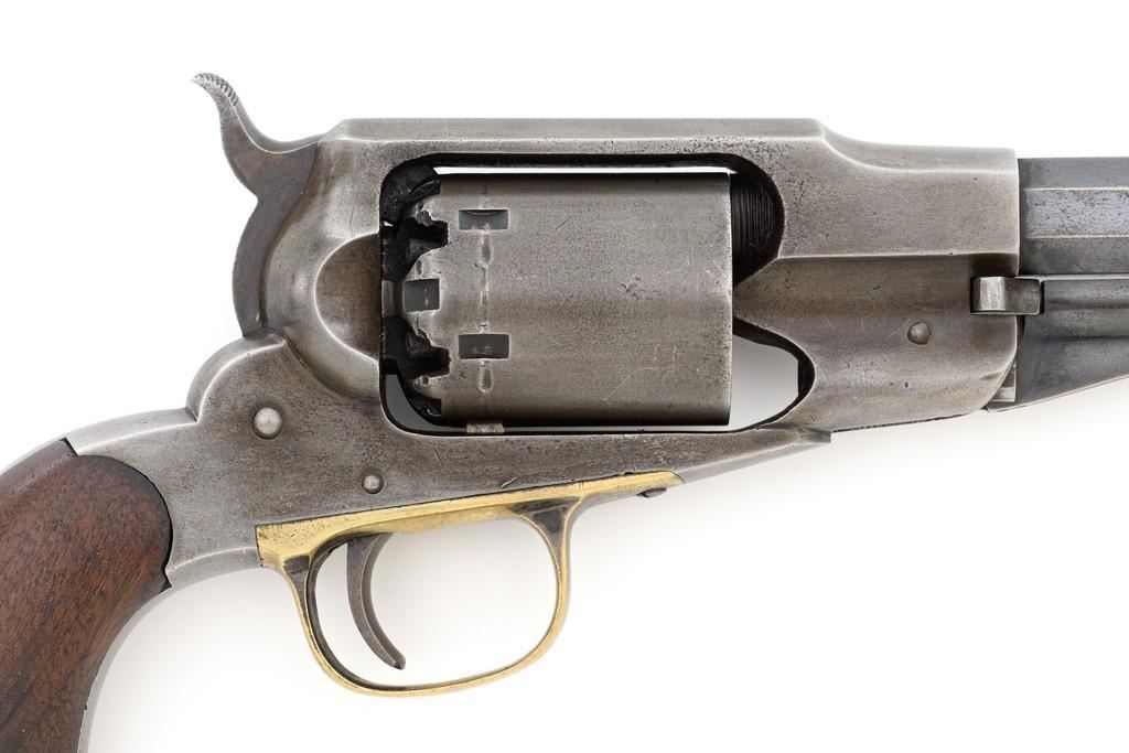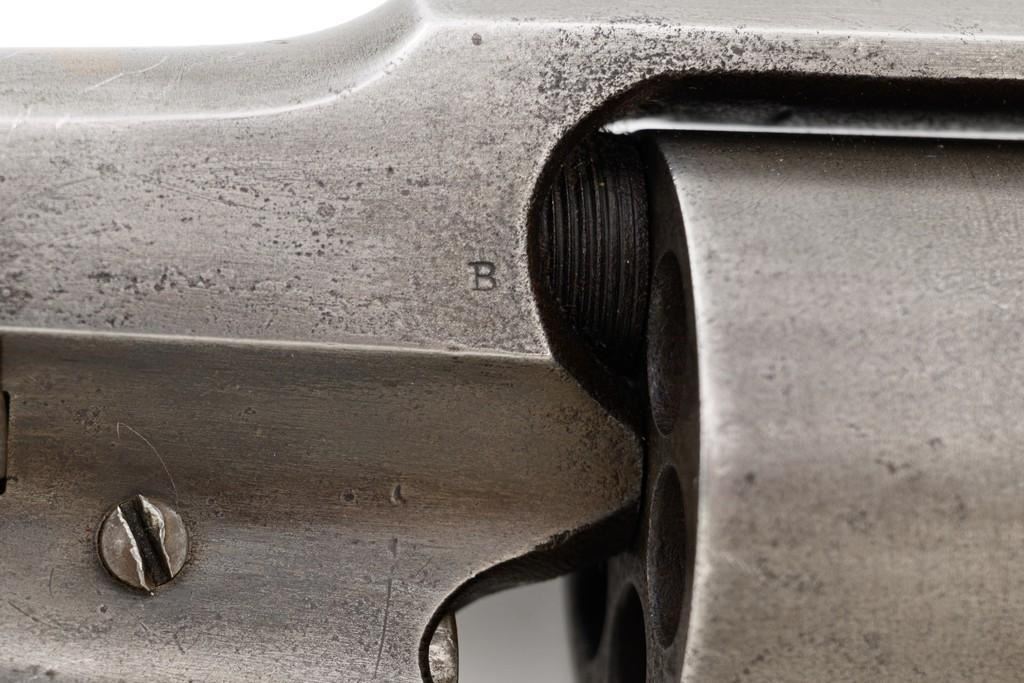 Remington Transitional New Model Navy Civilian Single Action Percussion Revolver, #23187, .36 cal., 7-3/8'' octagon barrel, blued finish, brass trigger guard, two-piece smooth walnut grips, silver cone front sight, and ''U''-shaped rear sight. Barrel is marked in two-lines ''PATENTED SEPT. 14, 1858/E. REMINGTON & SONS. ILION NEW YORK, U.S.A.'' No ''New Model'' markings and this revolver still features some of the earlier features found on the Model 1861 Navy revolver. Other markings include a small ''B'' stamped on the left front side of the frame. Matching numbers on left side of the grip frame and underside of the barrel. Back of the cylinder is marked ''3170E''. Condition is very good, retaining approx. 45% blue, located primarily on the barrel and lever. Balance of the metal has an even gray appearance, with some areas of mild pin prick pitting. Barrel address is clear. Left grip rates as fine showing moderate signs of age and wear; right grip with a few more noticeable impressions and small chip from the lower edge. Action is crisp. Bore is very good with scattered spots of moderate erosion. Est.: $1,200-$1,800. (Antique)(Michael Strietbeck Collection)
