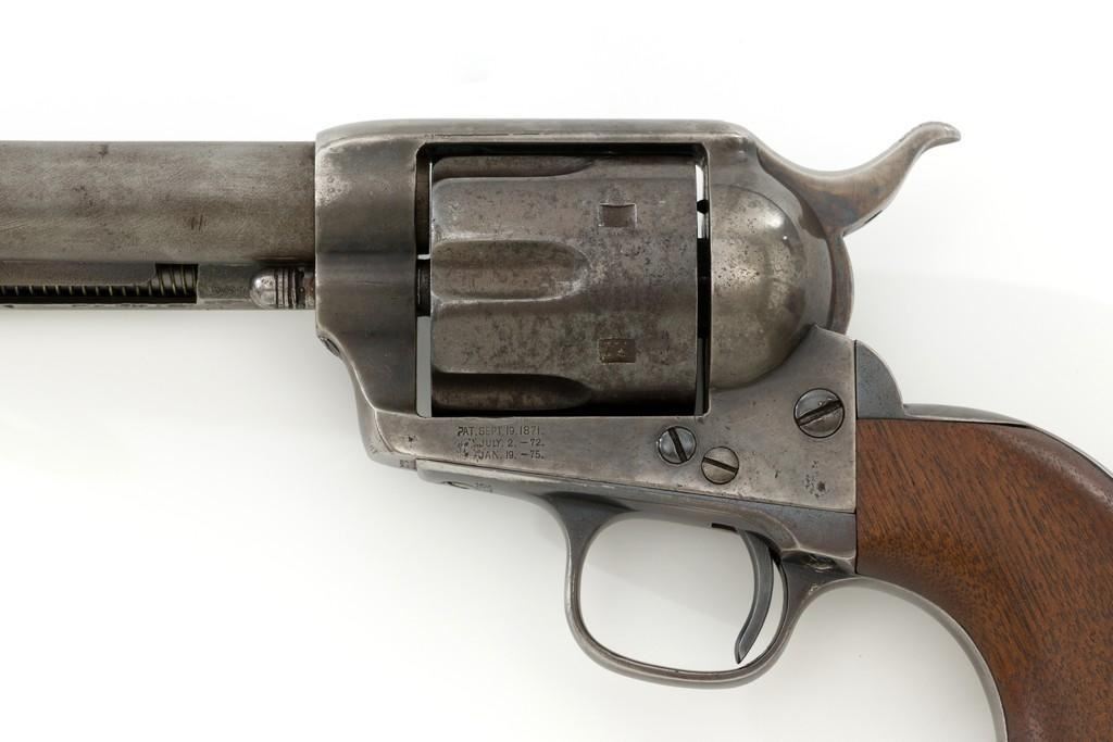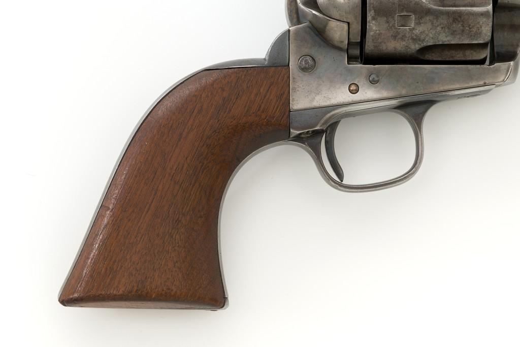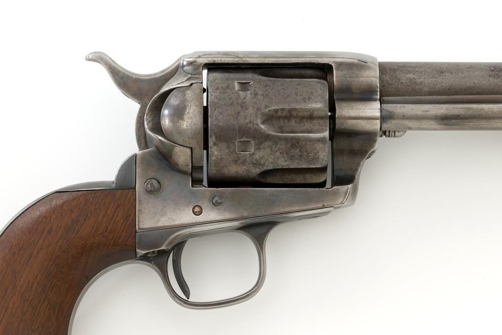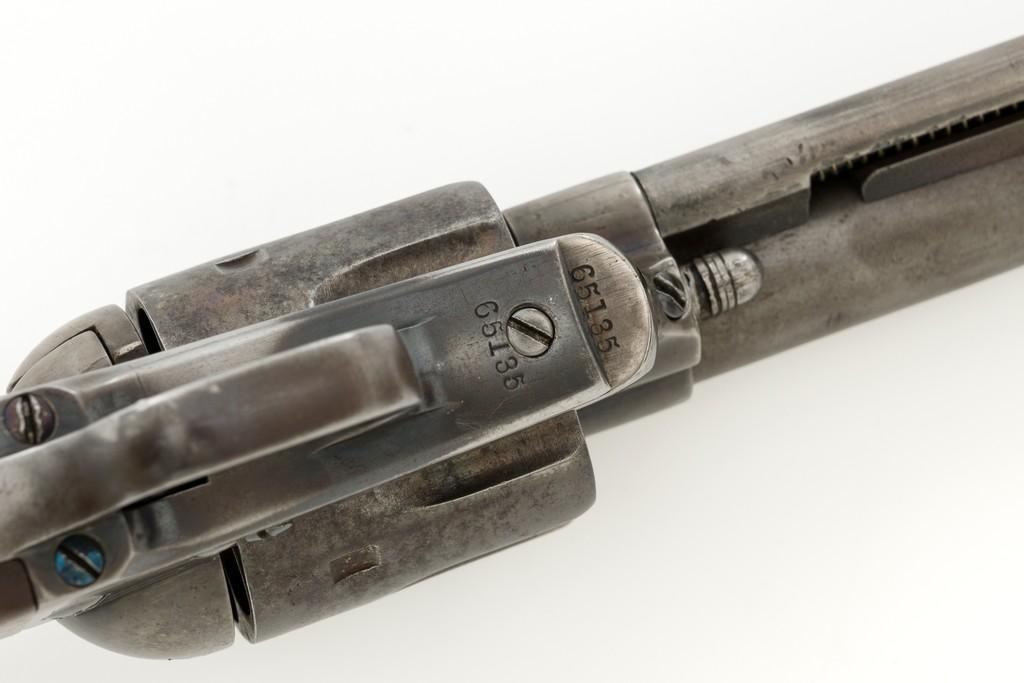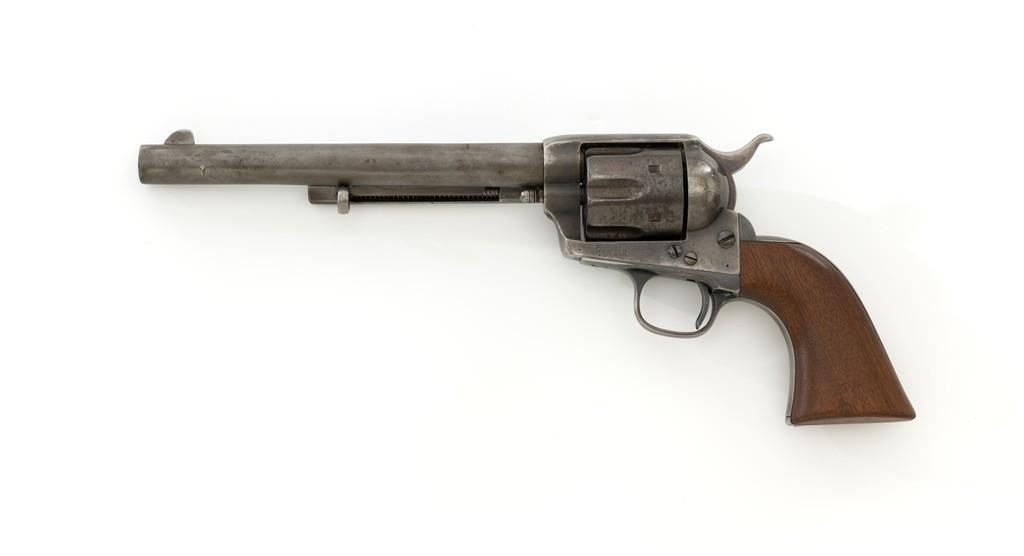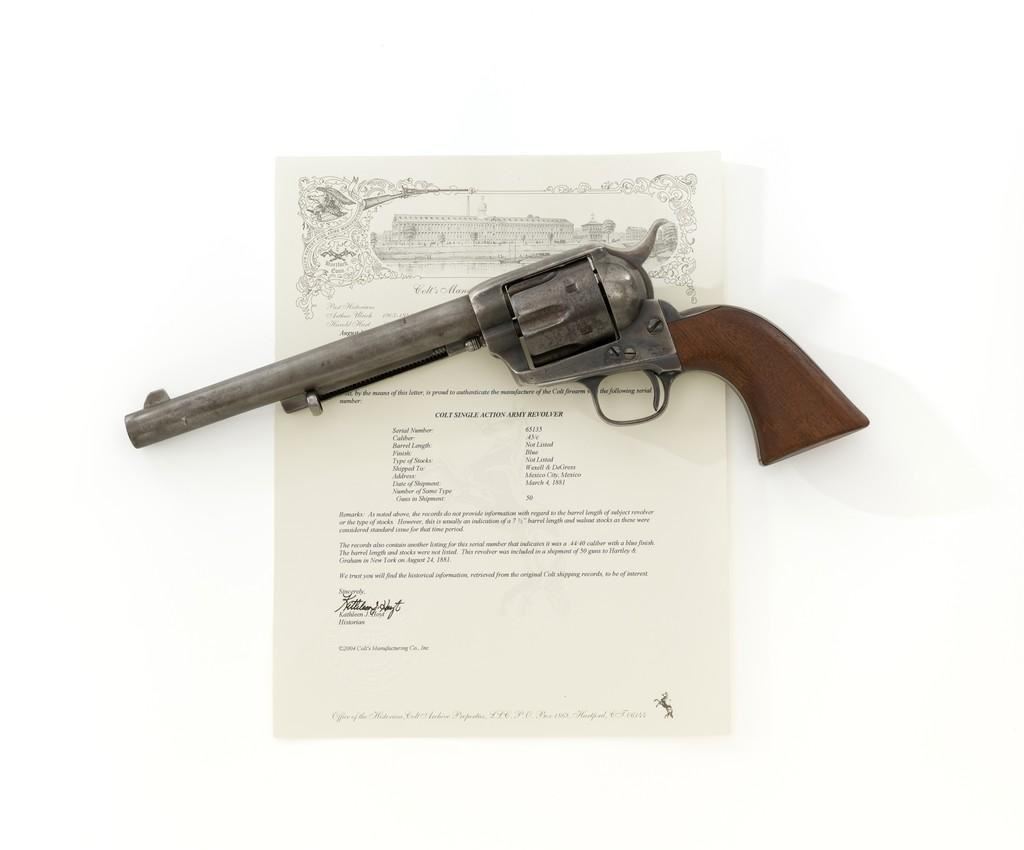 Antique Colt Single Action Army Revolver, #65135, .45 Colt cal., 7.5'' barrel, originally blue and color case hardened finish, smooth walnut grips, blade front and fixed ''V''-notch rear sight. Top of barrel with one-line address. Lower left side of the frame with three-line patent dates. Serial numbers are matching on the frame, trigger guard, and backstrap. Barrel is numbered ''3159''. There is a ''2'' and ''B'' on back of the cylinder. Loading gate with ''5030'' assembly number. Mfg'd 1881. Revolver is in good condition, displaying approx. 10% muted blue finish in the protected areas, hints of case color to the frame and hammer, the balance areas of dark patina and scattered surface blemishes associated with age and use. Grips with pleasing grain patterns, several small old mars on the lower left grip panel, showing a little shrinkage from age. Factory markings are legible. Action is crisp and functions smoothly, with all four clicks. Bore is fair with scattered light to moderate erosion; rifling is clearly defined. Includes factory letter confirming the caliber and finish; type of stocks ''not listed''. Shipped to Wexell & DeGress, Mexico City, Mexico, on March 4, 1881, as one of 50 same type guns in shipment. When no information on barrel length or type of stocks is available. This is usually an indication of a 7-1/2'' barrel length and walnut stocks as these were considered standard issue for that period. The records also contain another listing for this serial number that indicates it was a .44-40 caliber revolver with a blue finish. The barrel length and stocks were not listed. This revolver was included in a shipment of 50 guns to Hartley & Graham in New York on August 24, 1881. Est.: $3,000-$4,000. (Antique)