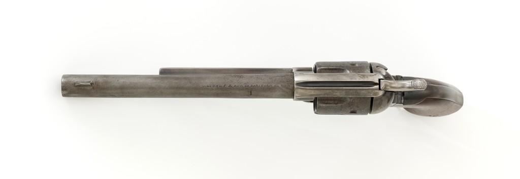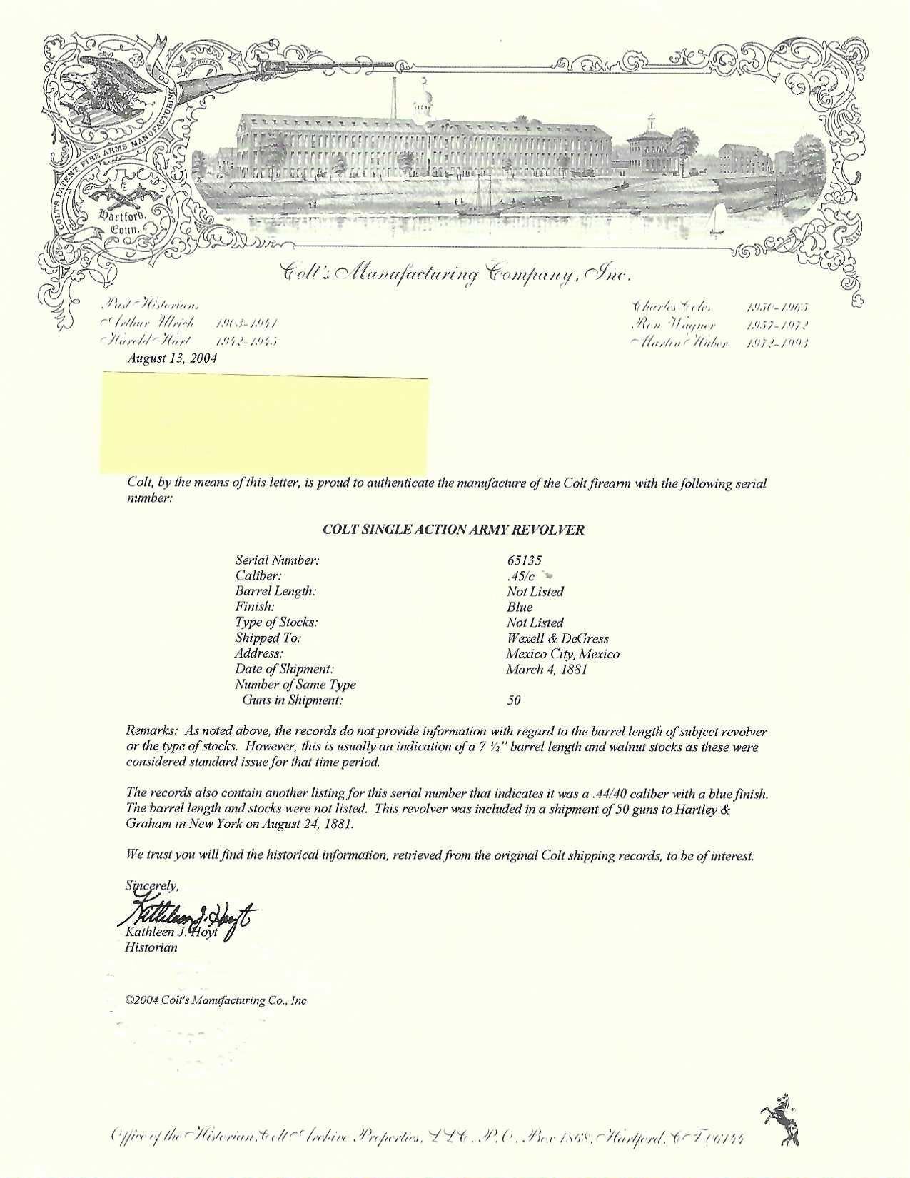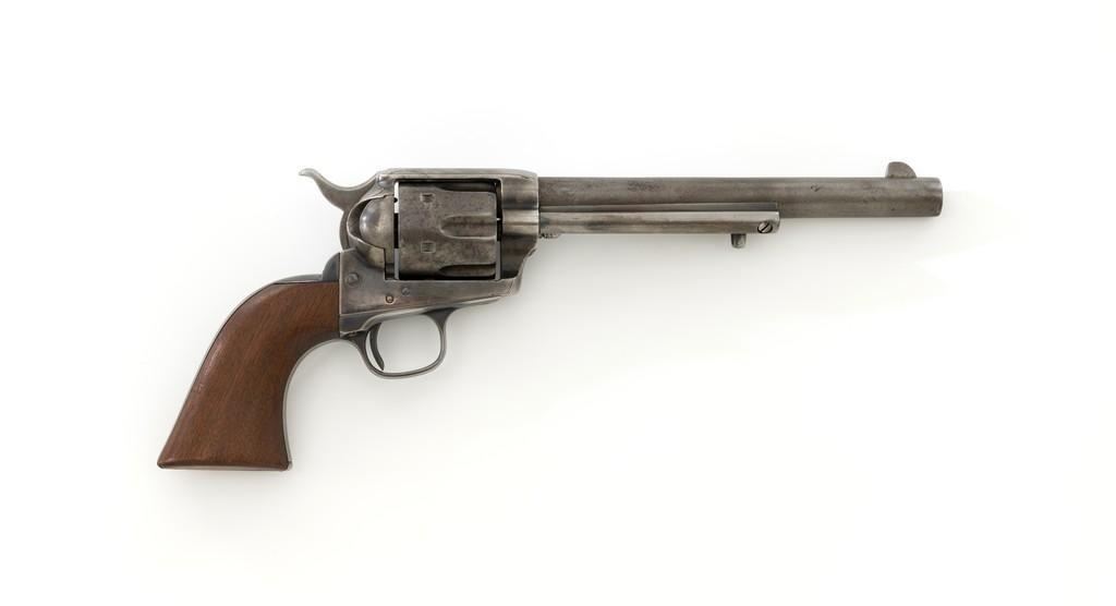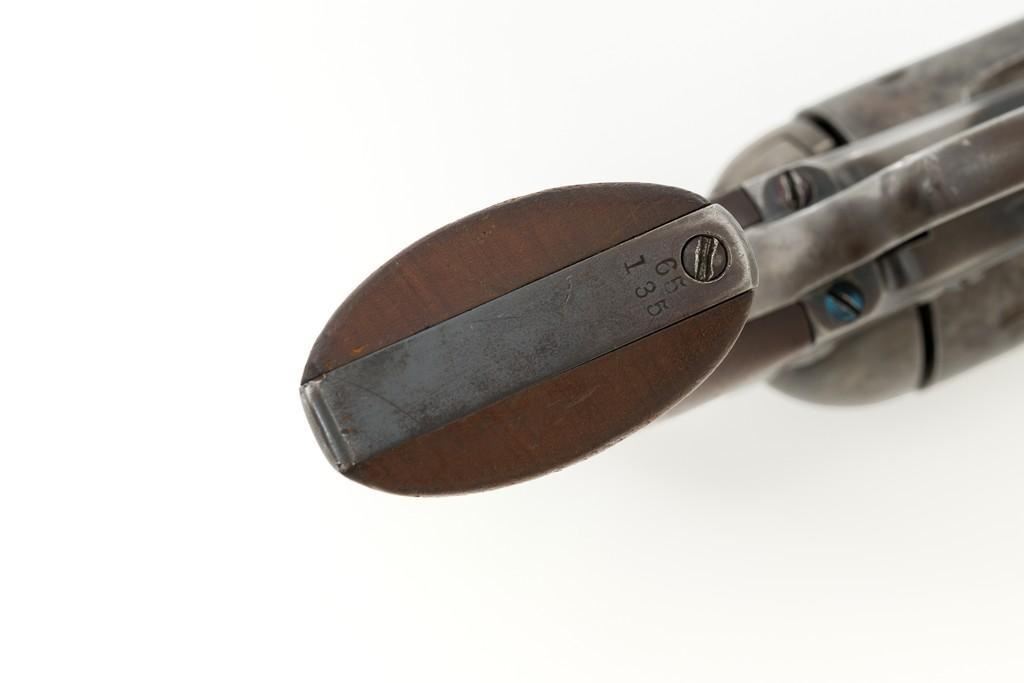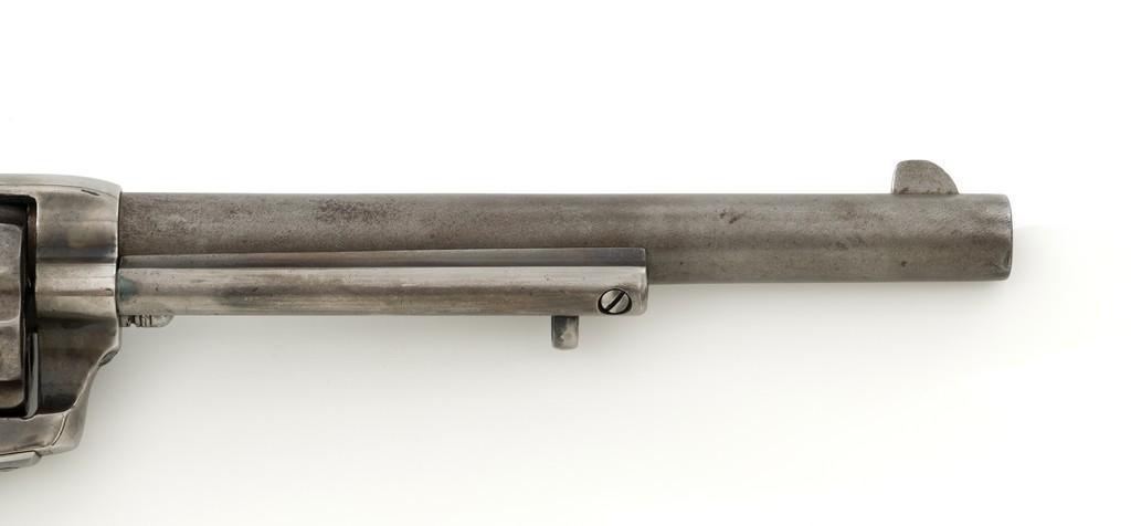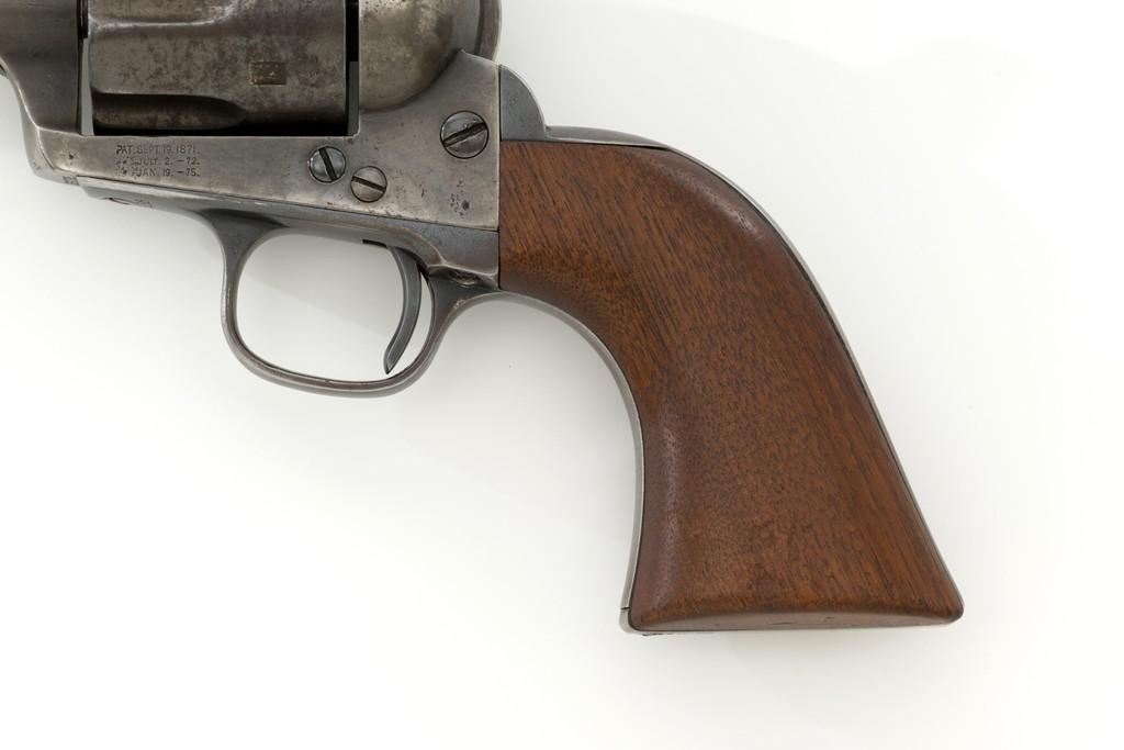 Antique Colt Single Action Army Revolver, #65135, .45 Colt cal., 7.5'' barrel, originally blue and color case hardened finish, smooth walnut grips, blade front and fixed ''V''-notch rear sight. Top of barrel with one-line address. Lower left side of the frame with three-line patent dates. Serial numbers are matching on the frame, trigger guard, and backstrap. Barrel is numbered ''3159''. There is a ''2'' and ''B'' on back of the cylinder. Loading gate with ''5030'' assembly number. Mfg'd 1881. Revolver is in good condition, displaying approx. 10% muted blue finish in the protected areas, hints of case color to the frame and hammer, the balance areas of dark patina and scattered surface blemishes associated with age and use. Grips with pleasing grain patterns, several small old mars on the lower left grip panel, showing a little shrinkage from age. Factory markings are legible. Action is crisp and functions smoothly, with all four clicks. Bore is fair with scattered light to moderate erosion; rifling is clearly defined. Includes factory letter confirming the caliber and finish; type of stocks ''not listed''. Shipped to Wexell & DeGress, Mexico City, Mexico, on March 4, 1881, as one of 50 same type guns in shipment. When no information on barrel length or type of stocks is available. This is usually an indication of a 7-1/2'' barrel length and walnut stocks as these were considered standard issue for that period. The records also contain another listing for this serial number that indicates it was a .44-40 caliber revolver with a blue finish. The barrel length and stocks were not listed. This revolver was included in a shipment of 50 guns to Hartley & Graham in New York on August 24, 1881. Est.: $3,000-$4,000. (Antique)