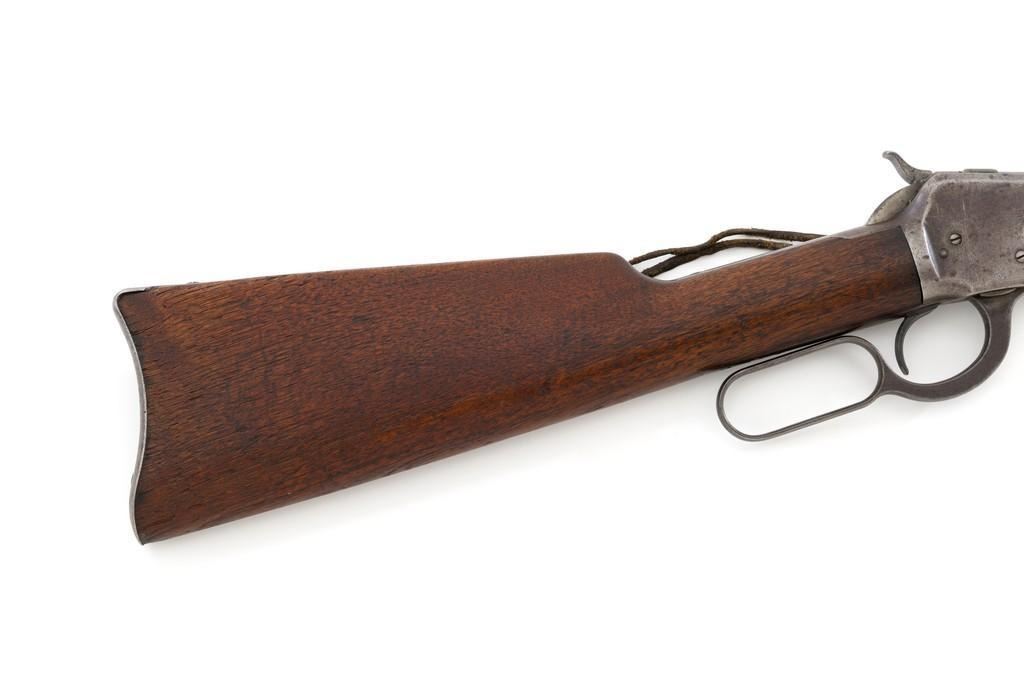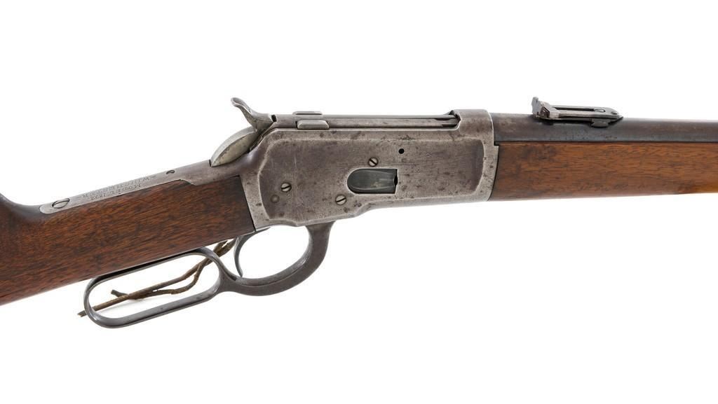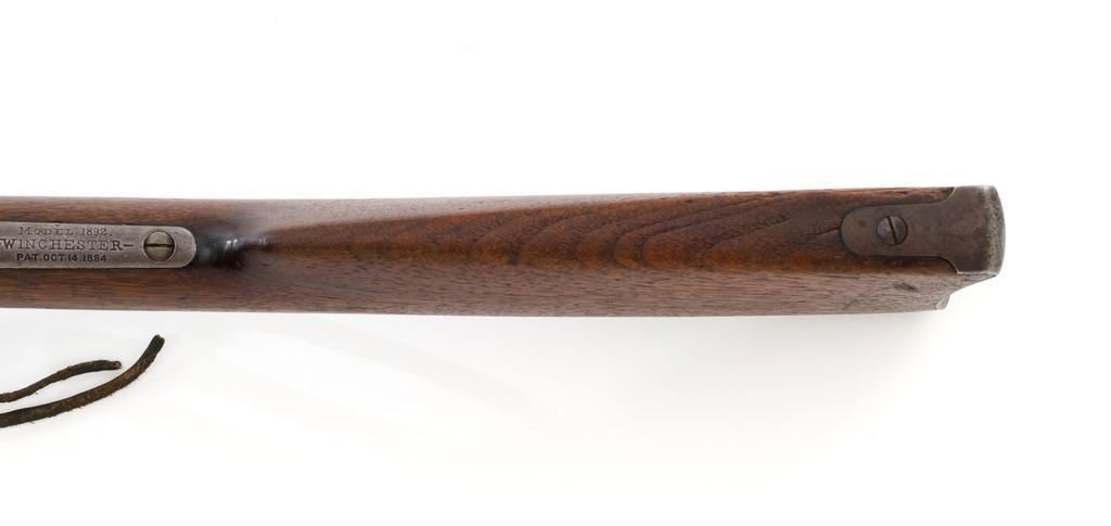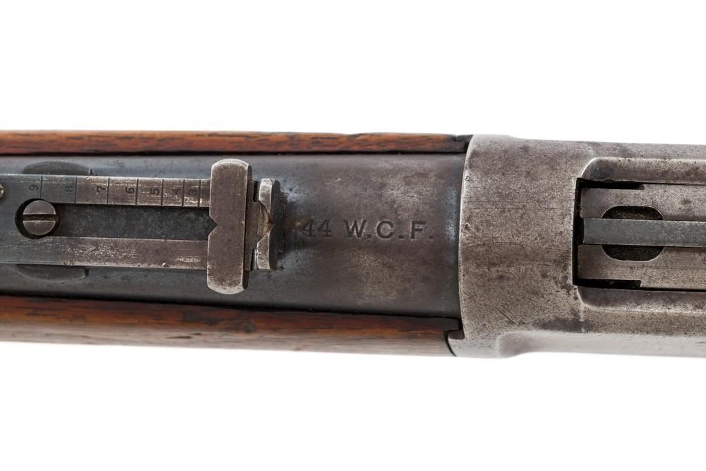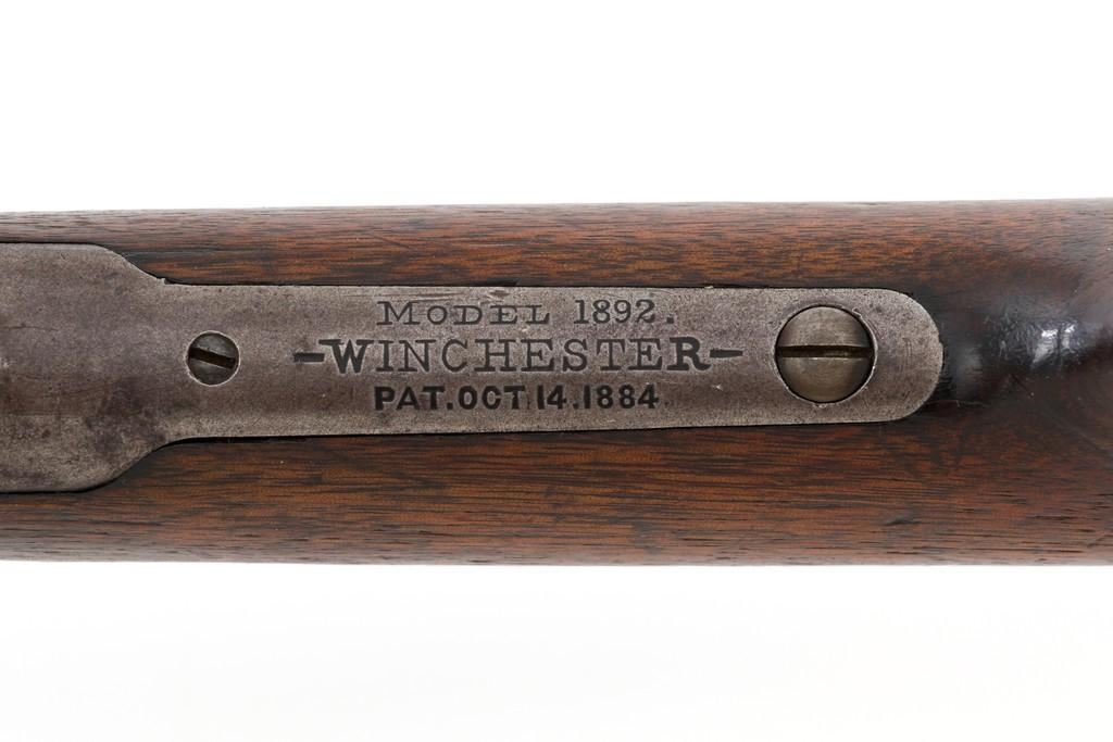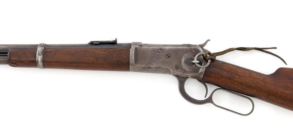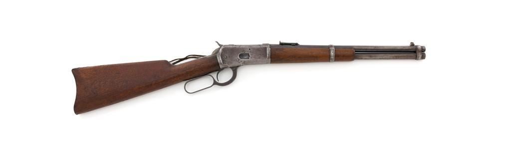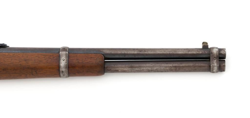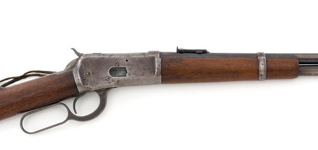 Scarce and Desirable Winchester Model 1892 Lever Action Trapper Saddle Ring Carbine, #197124, .44-40 W.C.F. cal., 15'' round barrel, blued finish, straight grip walnut stock and forend, pinned blade front sight, and folding carbine ladder rear sight. Mfg'd 1902. Overall condition good, displaying 20%-25% thinning and toning factory blue, mainly in the protected areas along the barrel and magazine tube; on the hammer and lever. Balance of the metal is gray mixed with cloudy brown patina, showing typical mark associated with age and use; right side of the receiver with intermittent spots of mild pitting. Wood is good, showing age and wear that is consistent with the rest of the rifle, including mostly small to medium sized mars associated with age and use. Additionally, there are a few deeper impressions to front left side of the forend. Factory markings are clear. Action is crisp and functions smoothly. Bore rates fair with defined rifling and scattered spots of light erosion on the front 1/3rd of the bore; balance is mostly bright. Listed by serial number on the accompanying BATF paperwork, indicating this firearm is no longer an NFA item despite its 15'' barrel; instead, classified as a Curio & Relic. Est.: $4,000-$6,000. (C&R/PPT)