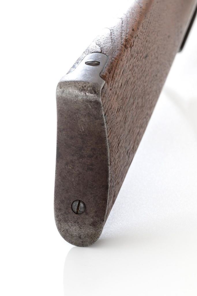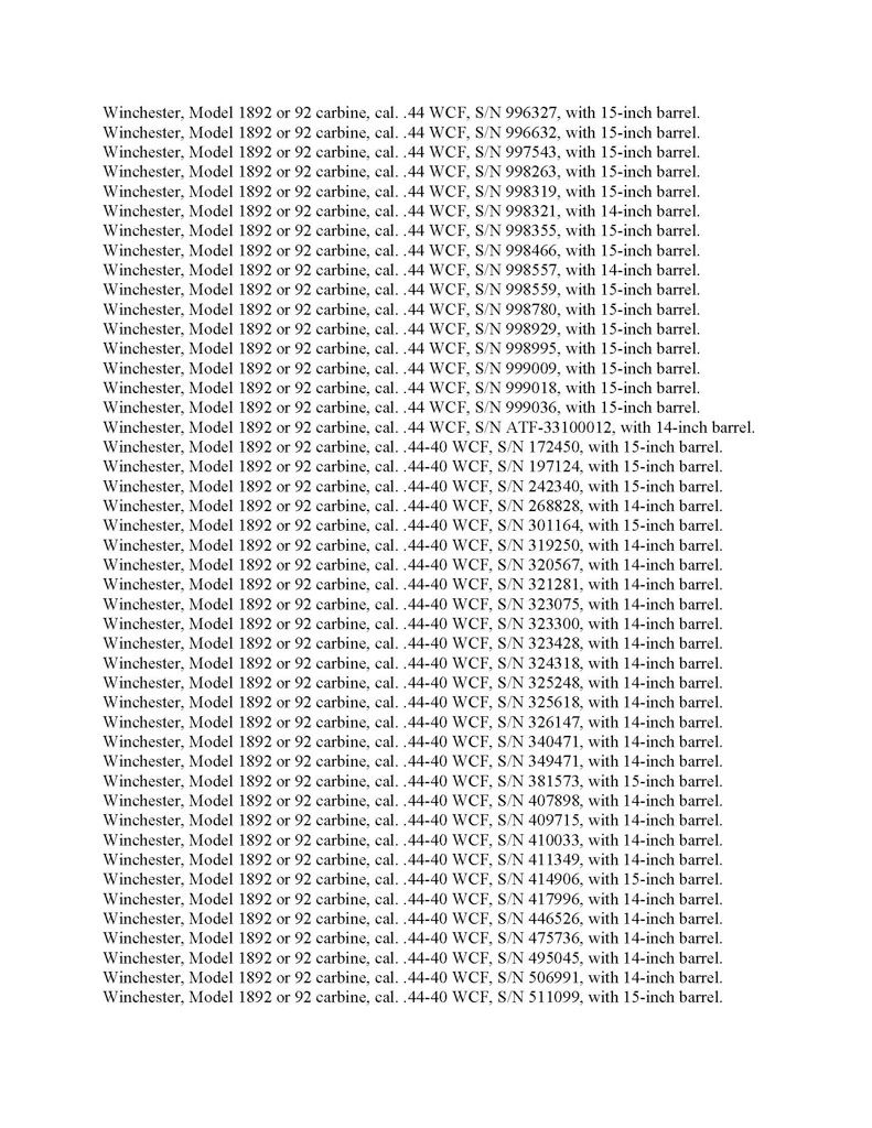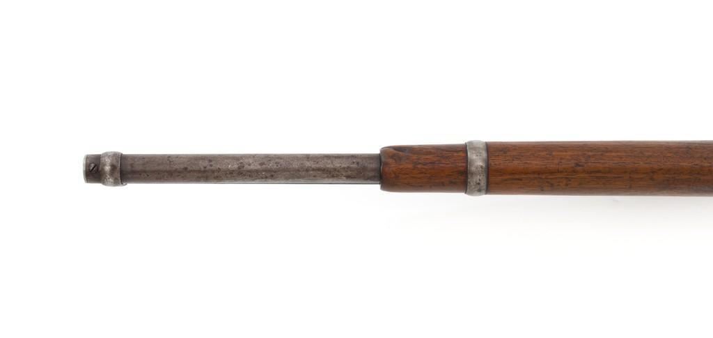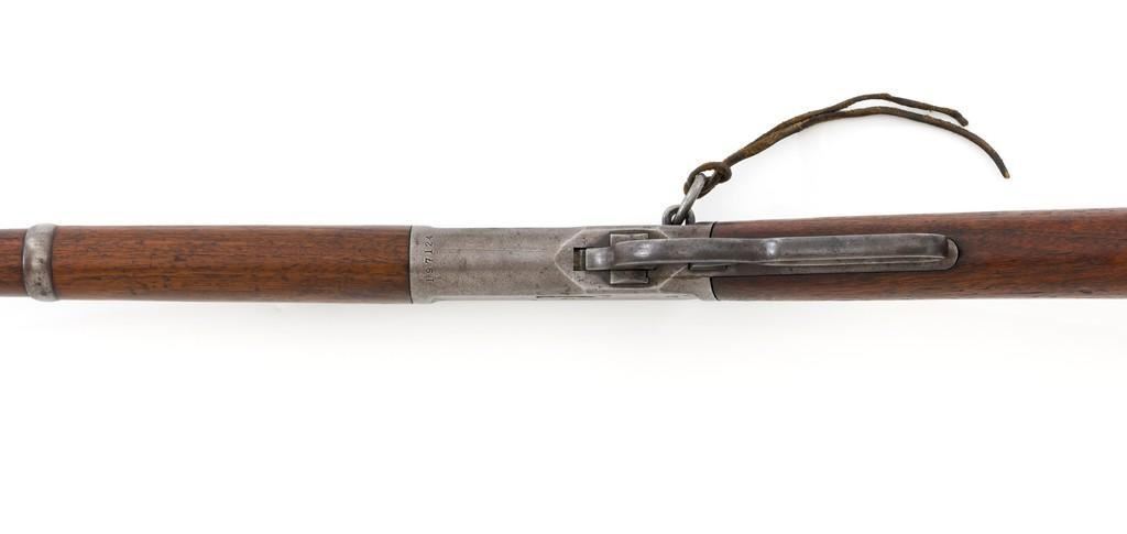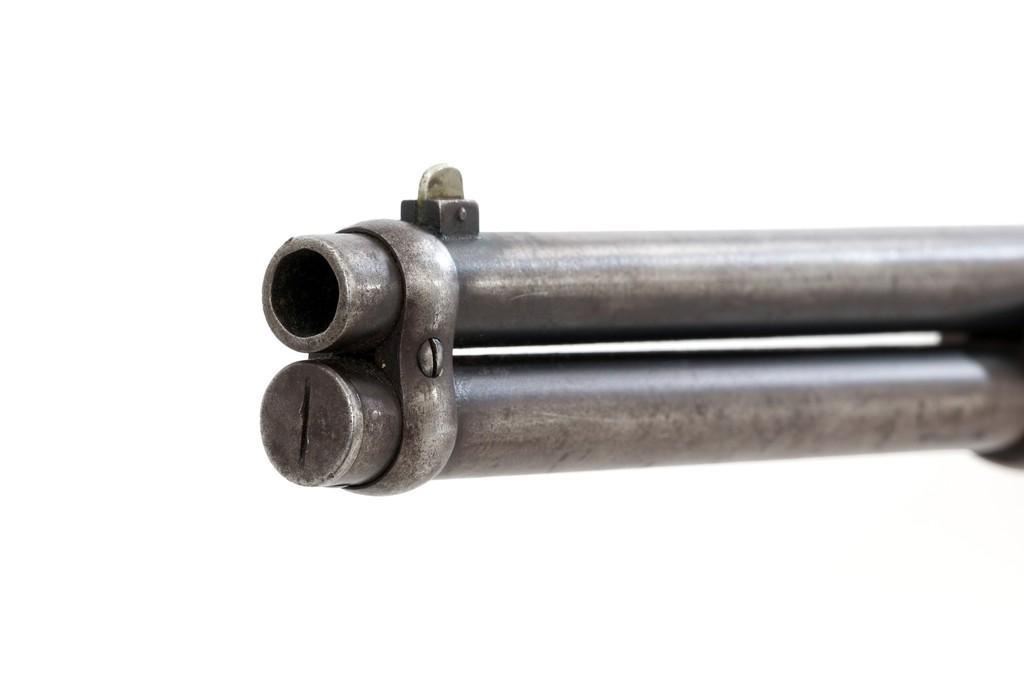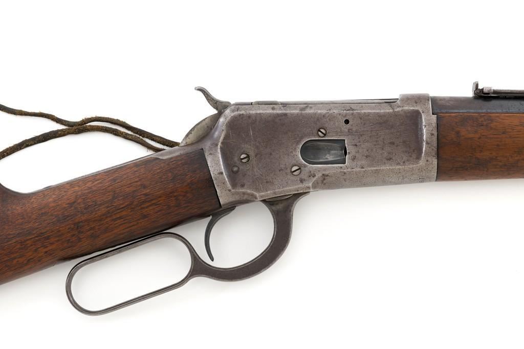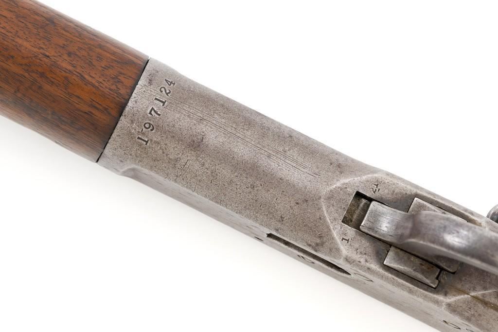 Scarce and Desirable Winchester Model 1892 Lever Action Trapper Saddle Ring Carbine, #197124, .44-40 W.C.F. cal., 15'' round barrel, blued finish, straight grip walnut stock and forend, pinned blade front sight, and folding carbine ladder rear sight. Mfg'd 1902. Overall condition good, displaying 20%-25% thinning and toning factory blue, mainly in the protected areas along the barrel and magazine tube; on the hammer and lever. Balance of the metal is gray mixed with cloudy brown patina, showing typical mark associated with age and use; right side of the receiver with intermittent spots of mild pitting. Wood is good, showing age and wear that is consistent with the rest of the rifle, including mostly small to medium sized mars associated with age and use. Additionally, there are a few deeper impressions to front left side of the forend. Factory markings are clear. Action is crisp and functions smoothly. Bore rates fair with defined rifling and scattered spots of light erosion on the front 1/3rd of the bore; balance is mostly bright. Listed by serial number on the accompanying BATF paperwork, indicating this firearm is no longer an NFA item despite its 15'' barrel; instead, classified as a Curio & Relic. Est.: $4,000-$6,000. (C&R/PPT)