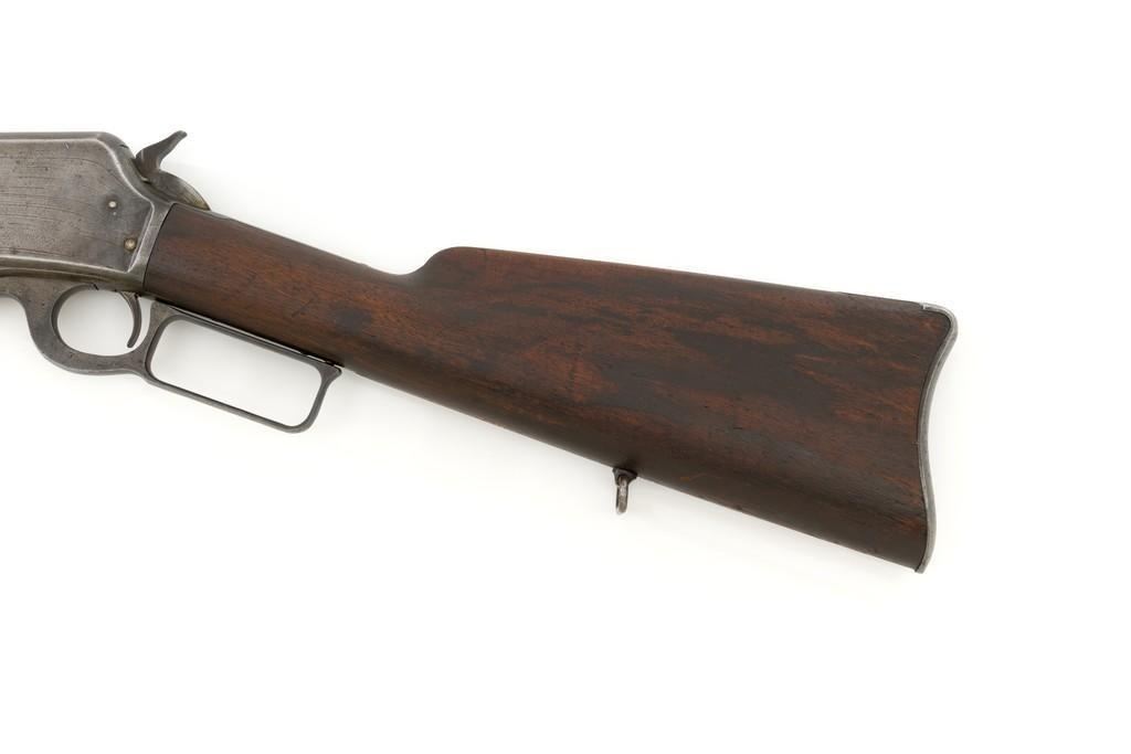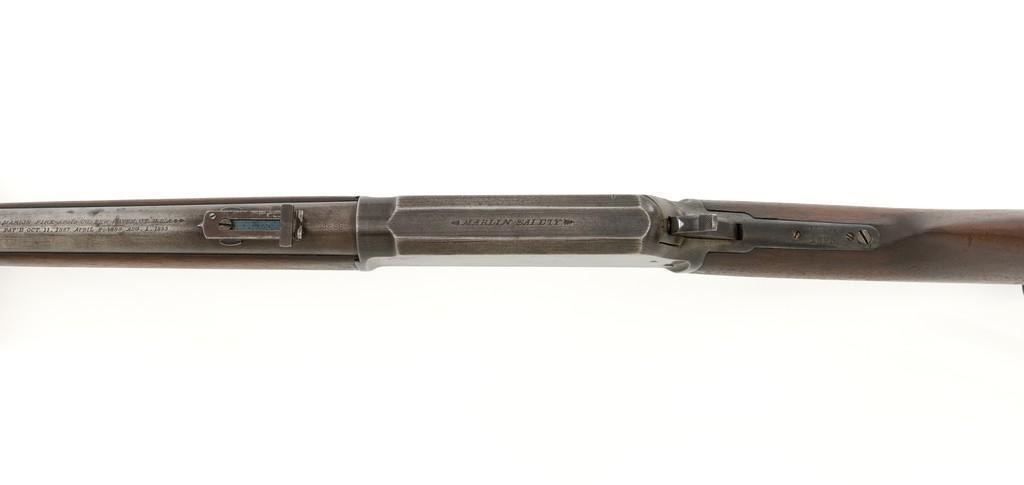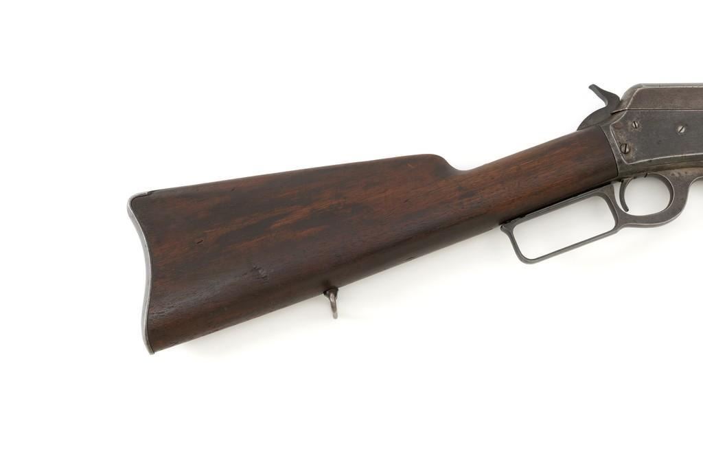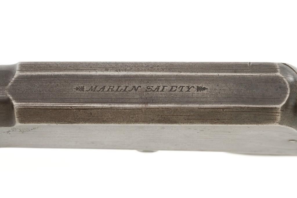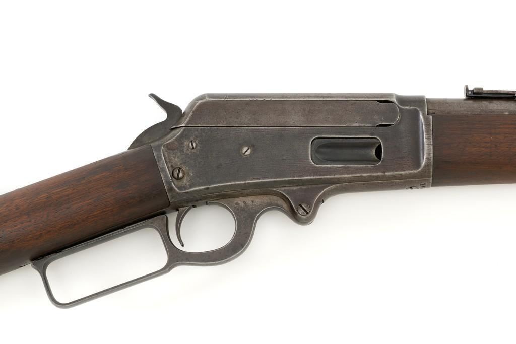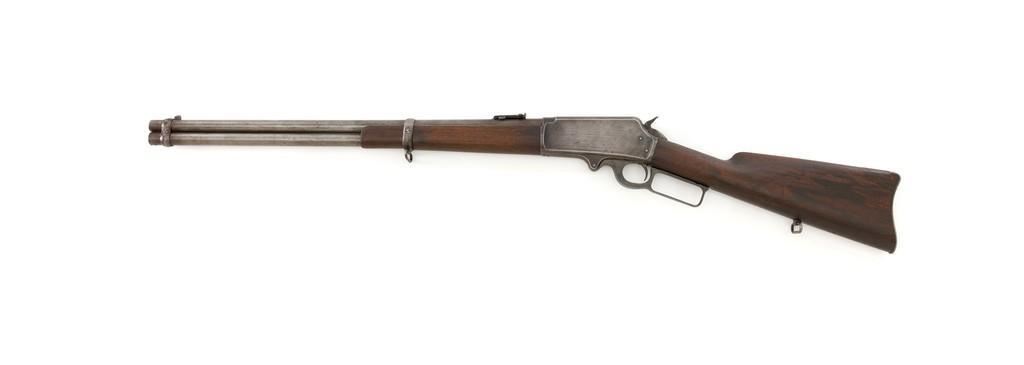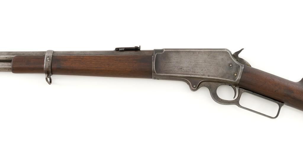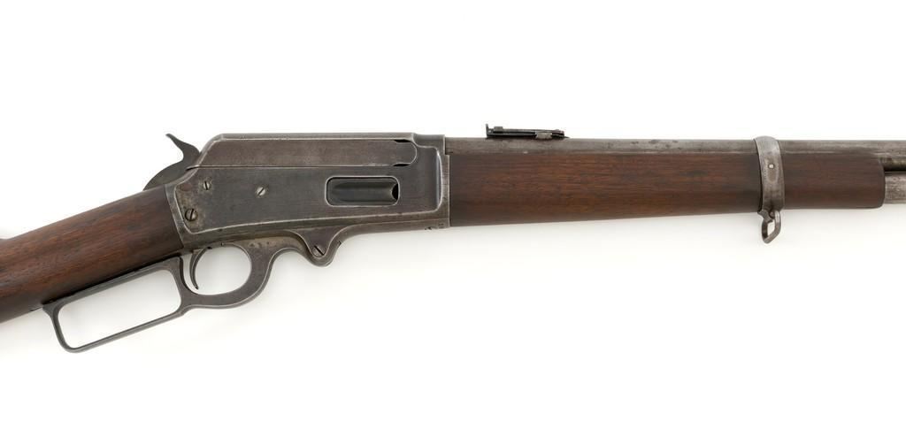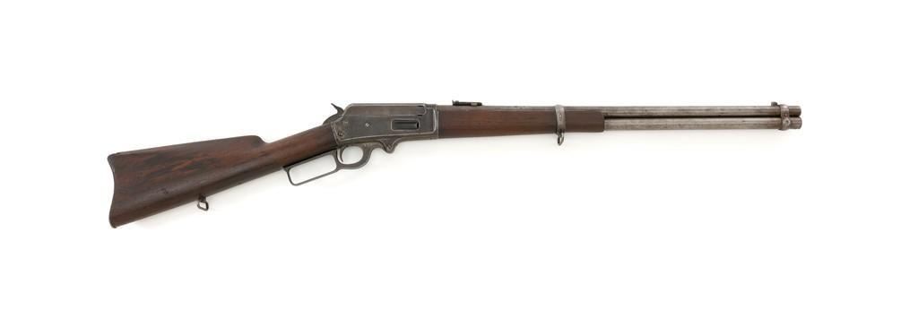Rare Marlin Model 1895 Lever Action Carbine, #148388, .38-56 cal., 22'' round barrel, blue finish; smooth walnut forend and straight grip stock with sling swivels, ending with a crescent steel buttplate. Carbine blade front and ladder rear sight. No saddle ring or indications that the carbine ever had one, which per Marlin Firearms by Brophy is standard for a carbine ordered with sling swivels. Factory markings are clear with ''MARLIN SAFETY'' on top of the receiver. The number ''19'' is stamped into the bottom edge of the buttstock, between the lever and swivel. Mfg'd 1897. Carbine is in good overall condition, retaining traces of original finish, with the metal surfaces drifting to gray patina. Barrel and magazine show areas of light to moderate erosion with scuffs and scratches. Protected area of the rear ladder sight shows considerable bright nitre blue finish. Receiver displays traces of thinning finish, with edgewear, and evidence of cleaning, leaving scrapes and striations. A prior owner's name is etched into the left side, ''Lyall Wilson''. Hammer and lever assembly show silvered color case hardened finish. Stock is in very good condition, showing even wear, with indentations and a deeper impression on the right side of the butt. Buttplate is proud at the toe due to wood shrinkage and there are streaks of darker finish on both sides of the buttstock. Wood to metal fit is very good. Bottom of the forend with a 1'' crack at the tip. Action functions well and locks up securely. Bore is very good with light erosion and well-defined rifling. The Marlin Model 1895 was produced in modest numbers, with only approx. 18,000 produced from 1895-1915. It is estimated that only approx. 200 carbines were manufactured. Est.: $3,000-$4,000. (Antique)