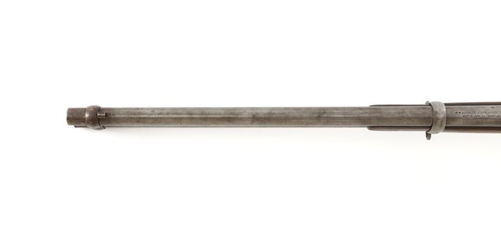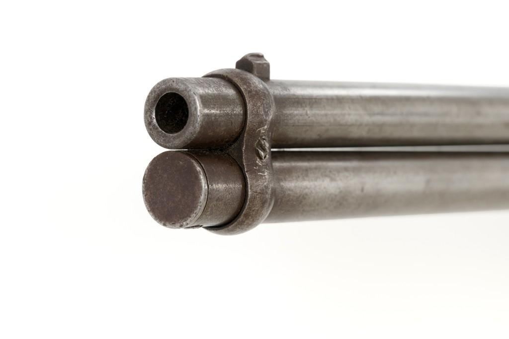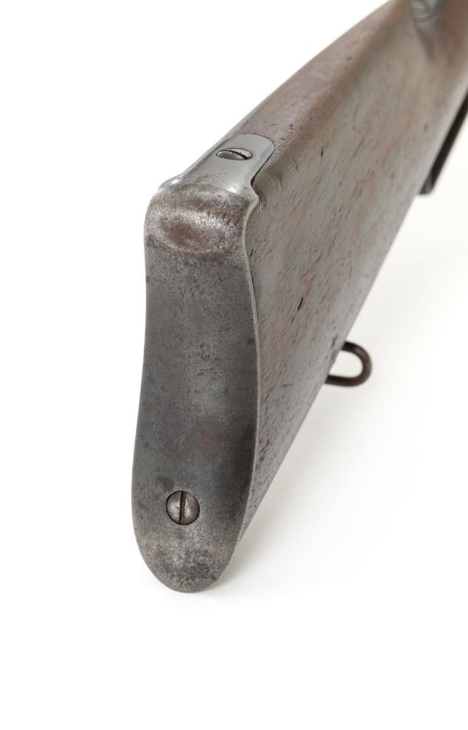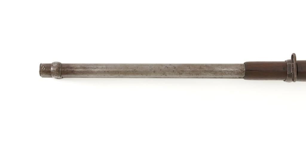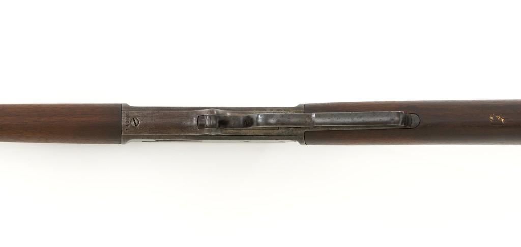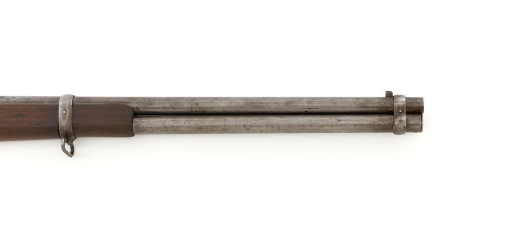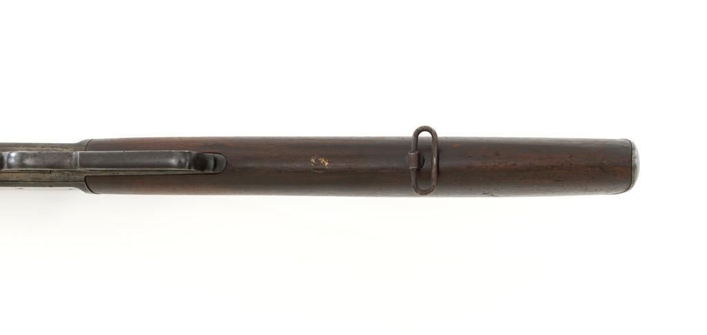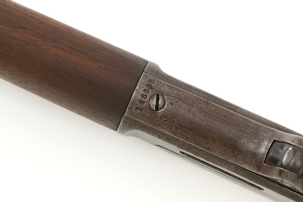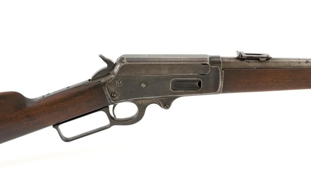 Rare Marlin Model 1895 Lever Action Carbine, #148388, .38-56 cal., 22'' round barrel, blue finish; smooth walnut forend and straight grip stock with sling swivels, ending with a crescent steel buttplate. Carbine blade front and ladder rear sight. No saddle ring or indications that the carbine ever had one, which per Marlin Firearms by Brophy is standard for a carbine ordered with sling swivels. Factory markings are clear with ''MARLIN SAFETY'' on top of the receiver. The number ''19'' is stamped into the bottom edge of the buttstock, between the lever and swivel. Mfg'd 1897. Carbine is in good overall condition, retaining traces of original finish, with the metal surfaces drifting to gray patina. Barrel and magazine show areas of light to moderate erosion with scuffs and scratches. Protected area of the rear ladder sight shows considerable bright nitre blue finish. Receiver displays traces of thinning finish, with edgewear, and evidence of cleaning, leaving scrapes and striations. A prior owner's name is etched into the left side, ''Lyall Wilson''. Hammer and lever assembly show silvered color case hardened finish. Stock is in very good condition, showing even wear, with indentations and a deeper impression on the right side of the butt. Buttplate is proud at the toe due to wood shrinkage and there are streaks of darker finish on both sides of the buttstock. Wood to metal fit is very good. Bottom of the forend with a 1'' crack at the tip. Action functions well and locks up securely. Bore is very good with light erosion and well-defined rifling. The Marlin Model 1895 was produced in modest numbers, with only approx. 18,000 produced from 1895-1915. It is estimated that only approx. 200 carbines were manufactured. Est.: $3,000-$4,000. (Antique)
