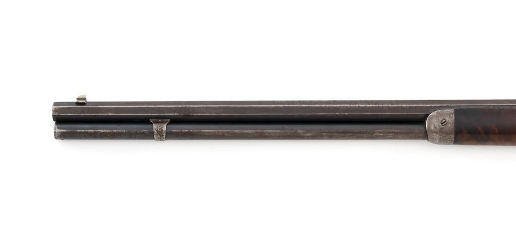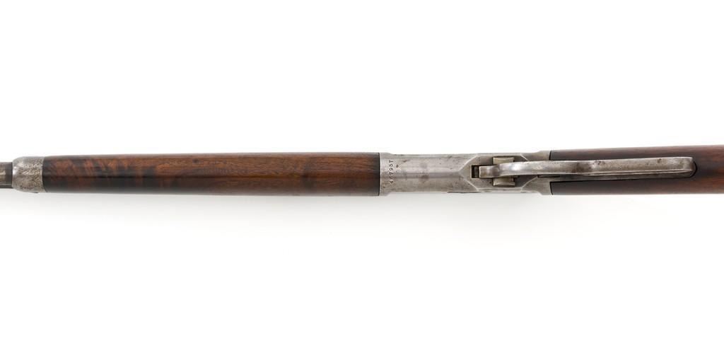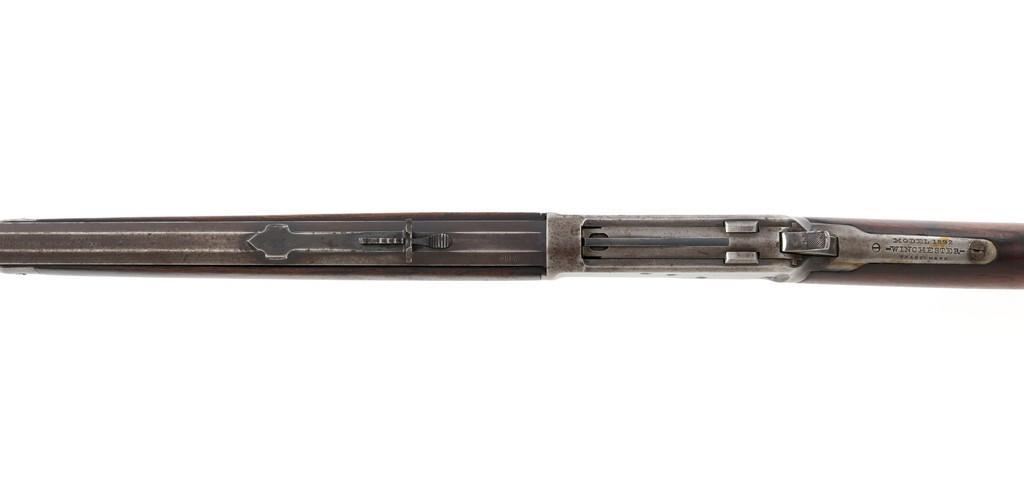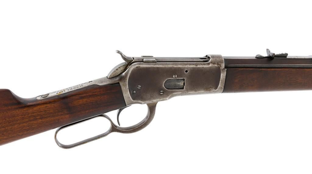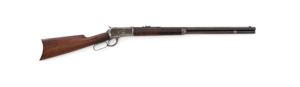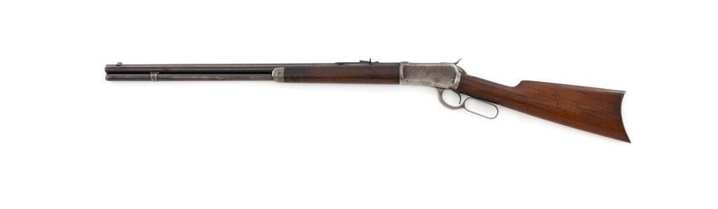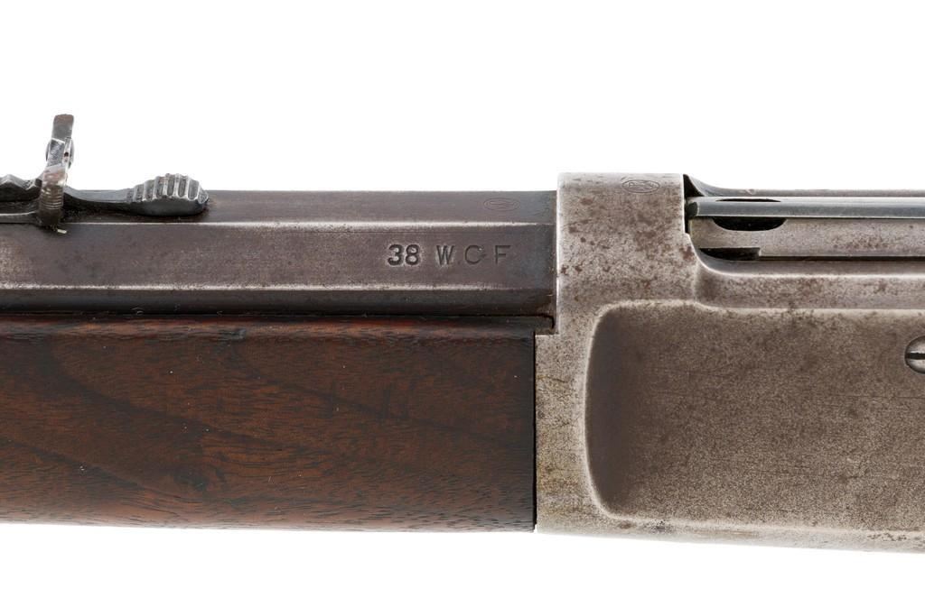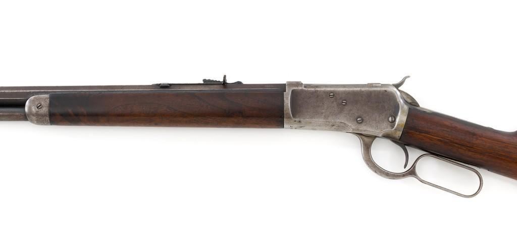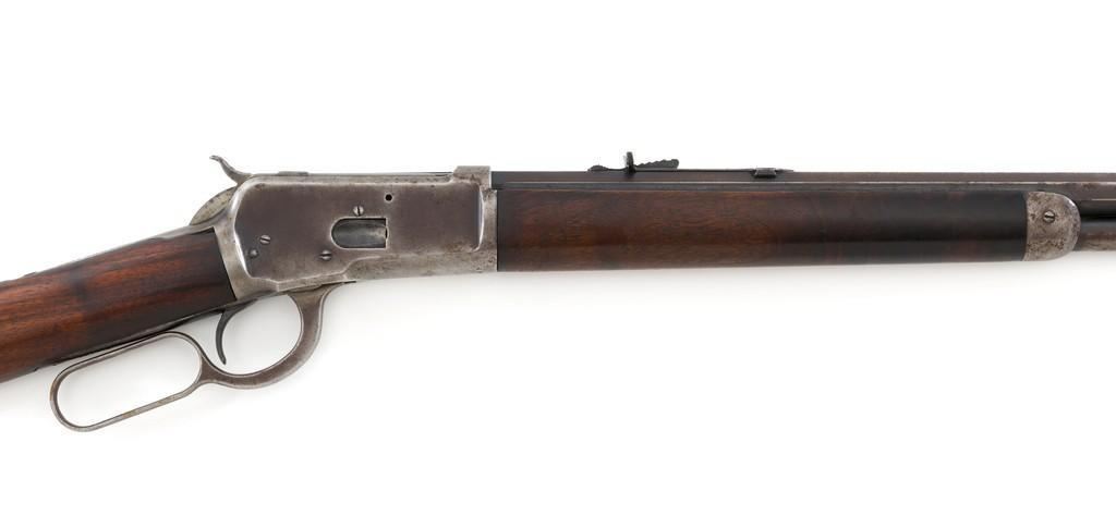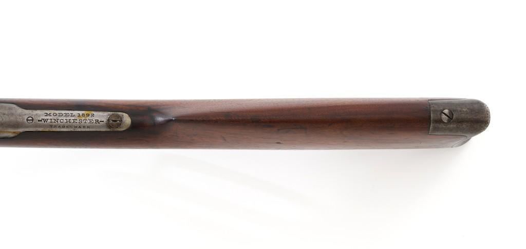 Winchester Model 1892 Lever Action Rifle, #467957, .38-40 W.C.F. cal., 24'' octagon barrel, blued finish, straight grip walnut stock and forend, crescent steel buttplate, dovetailed brass blade front sight, and flat top elevator rear sight. Mfg'd 1908. Overall condition is very good, retaining approx. 40%-45% thinning and toning blue, balance is a mixture of gray/brown; with scattered light to moderate pitting confined mostly to the barrel, magazine tube, and in front of the rear sight. Buttstock with scattered moderate dents, scratches, and was likely reoiled; wrist with 2.5'' crack to the left side that does not appear to affect the stocks integrity. Forend is fine showing some flame graining to the front area, with scattered light handling marks. Factory markings are clear. Action is crisp and functions smoothly. Bore with a visible ring approx. 8'' down from the muzzle; otherwise, good with visible rifling and intermittent spots of mild erosion. Est.: $1,500-$1,800. (C&R/PPT)