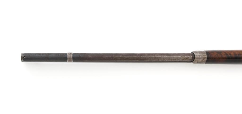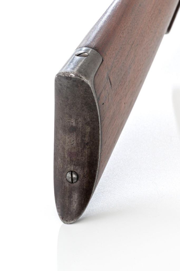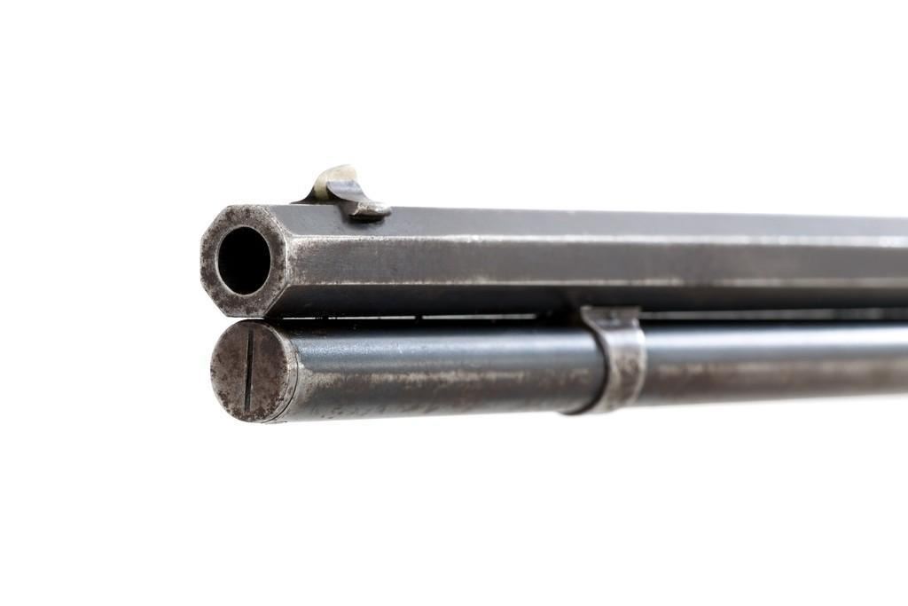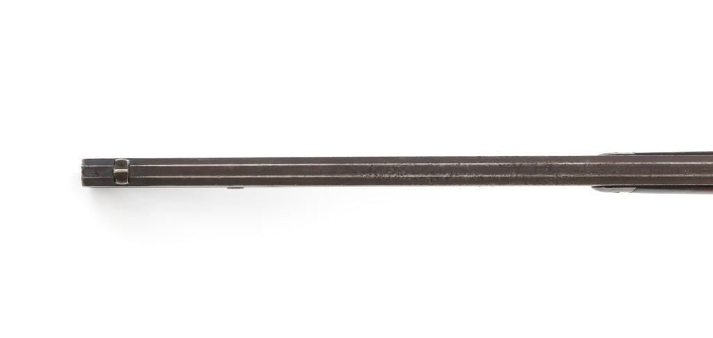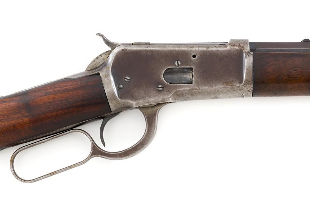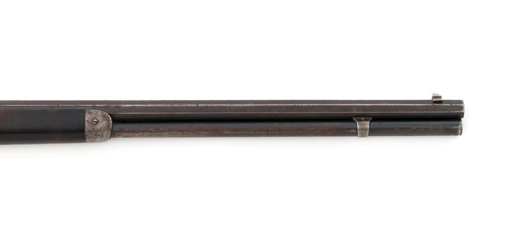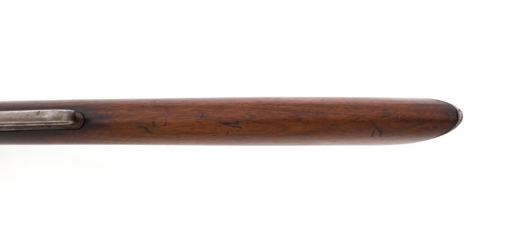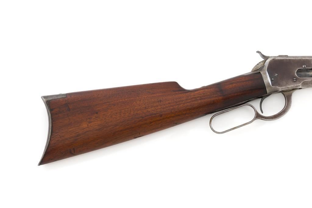 Winchester Model 1892 Lever Action Rifle, #467957, .38-40 W.C.F. cal., 24'' octagon barrel, blued finish, straight grip walnut stock and forend, crescent steel buttplate, dovetailed brass blade front sight, and flat top elevator rear sight. Mfg'd 1908. Overall condition is very good, retaining approx. 40%-45% thinning and toning blue, balance is a mixture of gray/brown; with scattered light to moderate pitting confined mostly to the barrel, magazine tube, and in front of the rear sight. Buttstock with scattered moderate dents, scratches, and was likely reoiled; wrist with 2.5'' crack to the left side that does not appear to affect the stocks integrity. Forend is fine showing some flame graining to the front area, with scattered light handling marks. Factory markings are clear. Action is crisp and functions smoothly. Bore with a visible ring approx. 8'' down from the muzzle; otherwise, good with visible rifling and intermittent spots of mild erosion. Est.: $1,500-$1,800. (C&R/PPT)