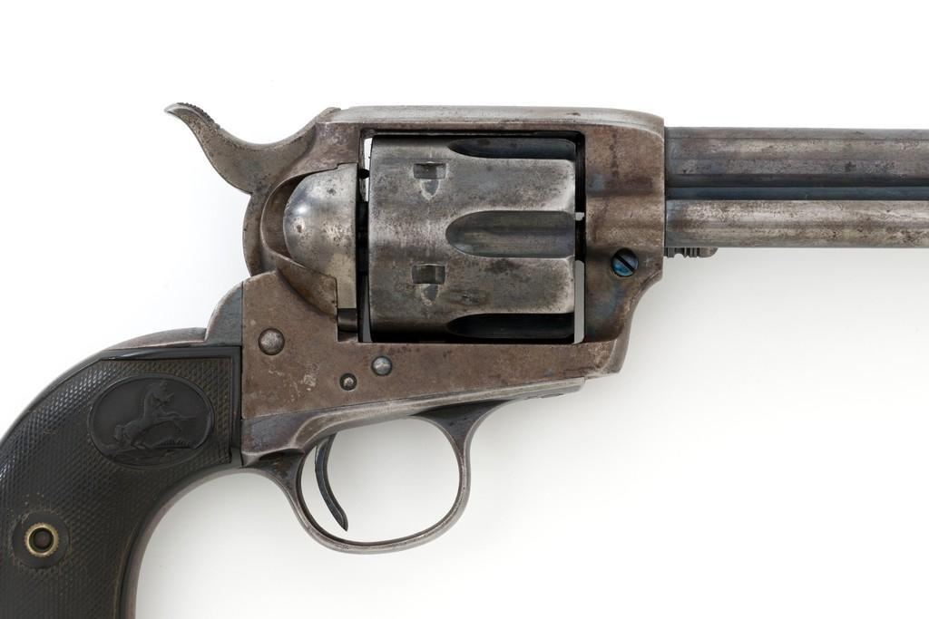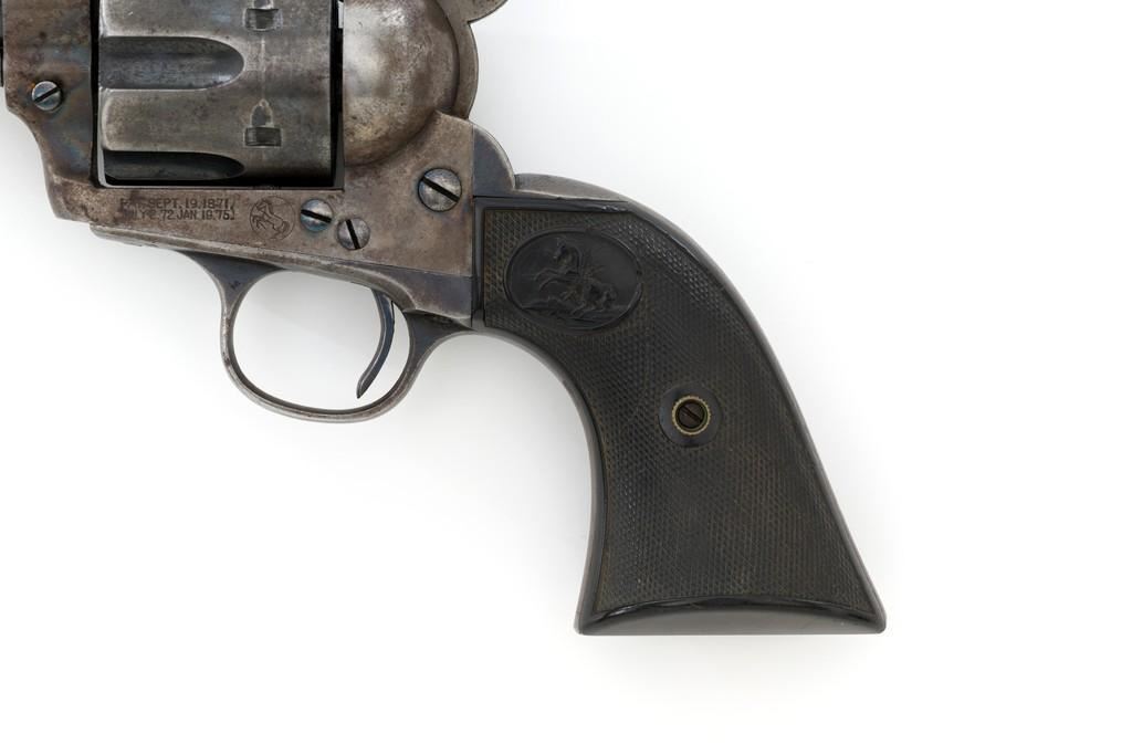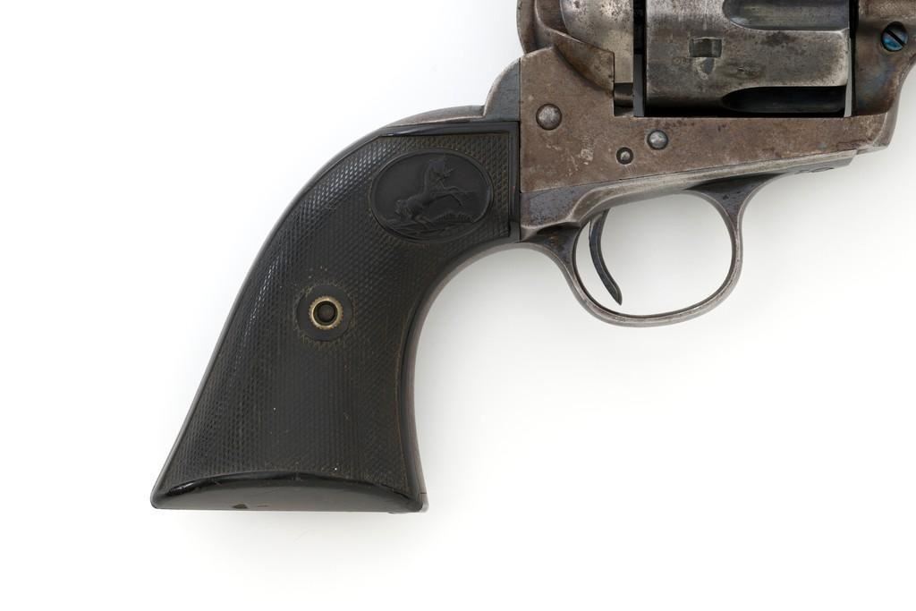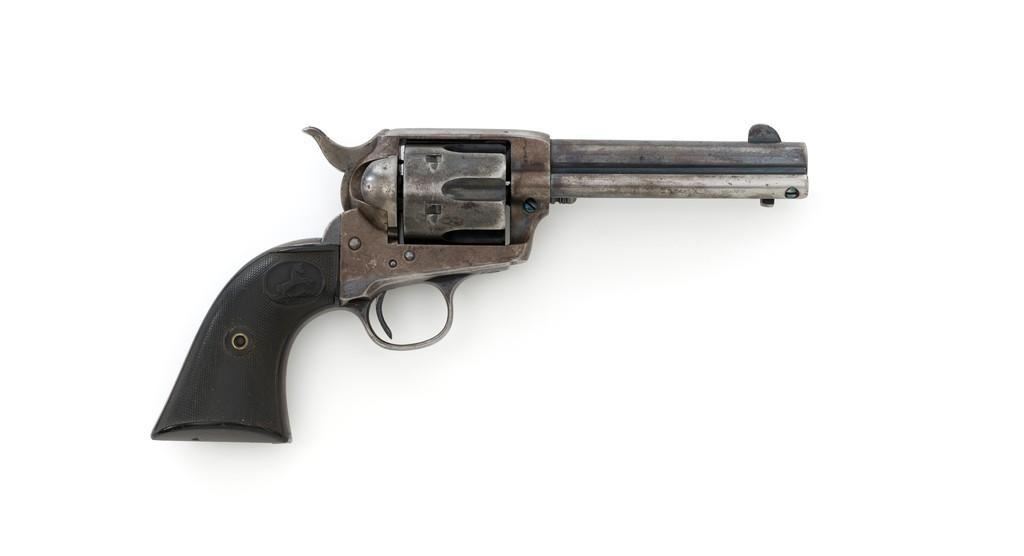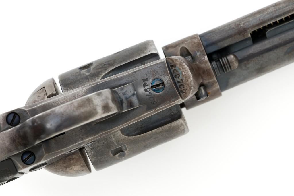 Colt 1st Generation Single Action Army Revolver, #249709, .45 Colt cal., 4.75'' barrel, blued and case hardened finish, checkered black hard rubber grips with Rampant Colt logo at the top of each panel. Standard sights include a blade front and fixed ''V''-notch rear. Top of the barrel with two-line address; ''45 COLT.'' on the left side. Lower left side of the frame with two-line patent dates and ''(Rampant Colt)''. Inside of the loading gate is marked with assembly number ''9118''. Visible matching numbers on the frame, trigger guard, and backstrap. Mfg'd 1903. Revolver is in good overall condition, displaying approx. 30%-35% blue finish, with traces of color case hardening in some of the protected areas; otherwise, having a mottled light gray/brown appearance. A significant amount of nitre blue remains on the trigger. Factory markings are crisp. Grips are very good, showing moderate age and handling wear. Action is crisp with all four clicks. Bore is primarily bright with near excellent rifling. Est.: $2,000-$2,500. (C&R/PPT)