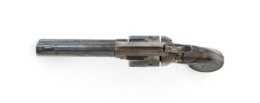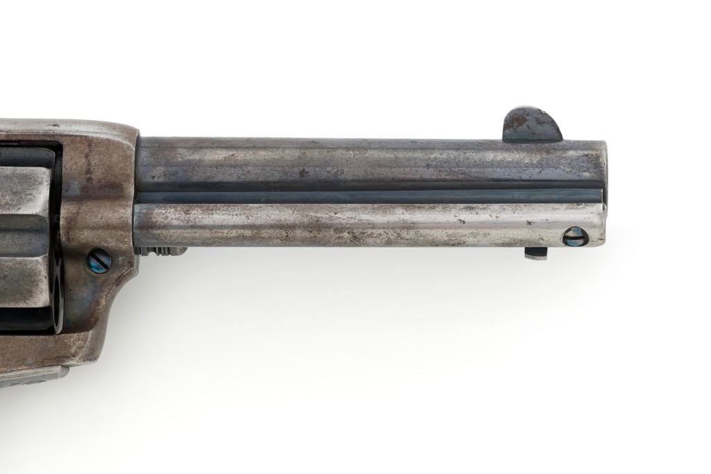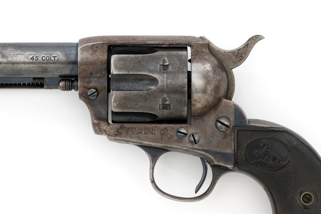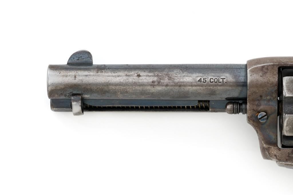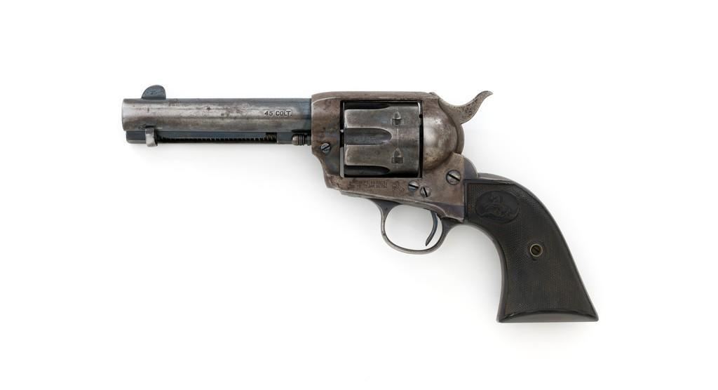 Colt 1st Generation Single Action Army Revolver, #249709, .45 Colt cal., 4.75'' barrel, blued and case hardened finish, checkered black hard rubber grips with Rampant Colt logo at the top of each panel. Standard sights include a blade front and fixed ''V''-notch rear. Top of the barrel with two-line address; ''45 COLT.'' on the left side. Lower left side of the frame with two-line patent dates and ''(Rampant Colt)''. Inside of the loading gate is marked with assembly number ''9118''. Visible matching numbers on the frame, trigger guard, and backstrap. Mfg'd 1903. Revolver is in good overall condition, displaying approx. 30%-35% blue finish, with traces of color case hardening in some of the protected areas; otherwise, having a mottled light gray/brown appearance. A significant amount of nitre blue remains on the trigger. Factory markings are crisp. Grips are very good, showing moderate age and handling wear. Action is crisp with all four clicks. Bore is primarily bright with near excellent rifling. Est.: $2,000-$2,500. (C&R/PPT)