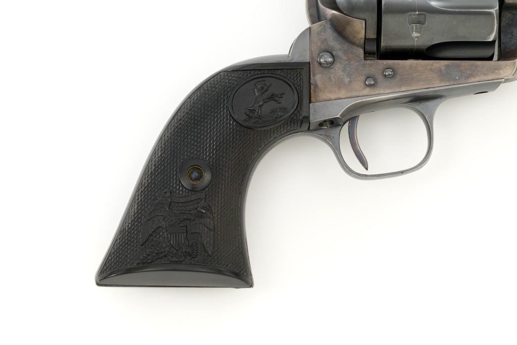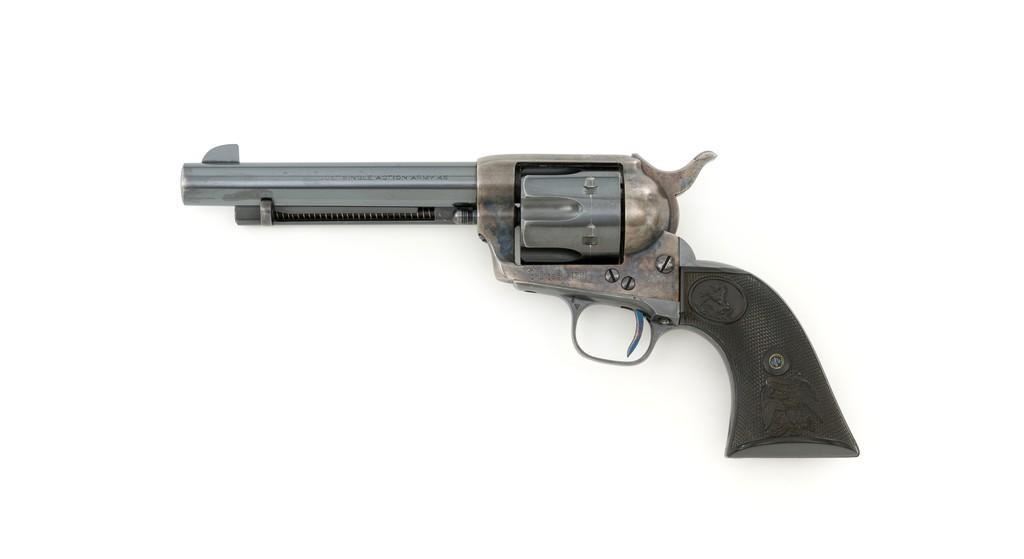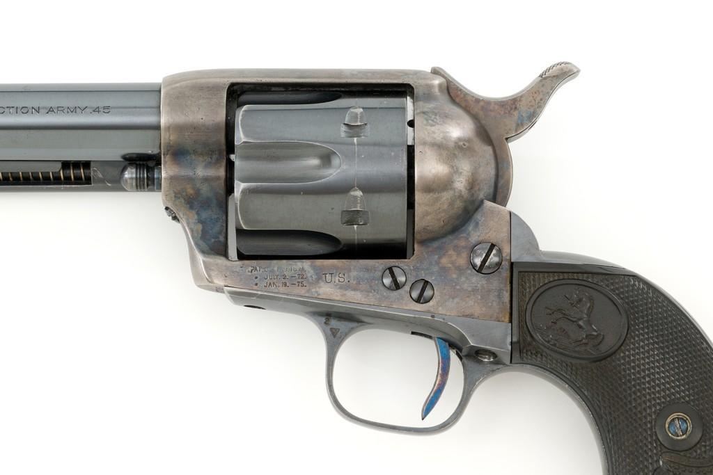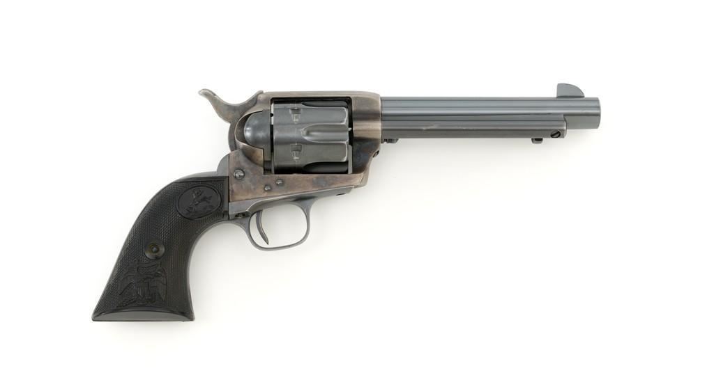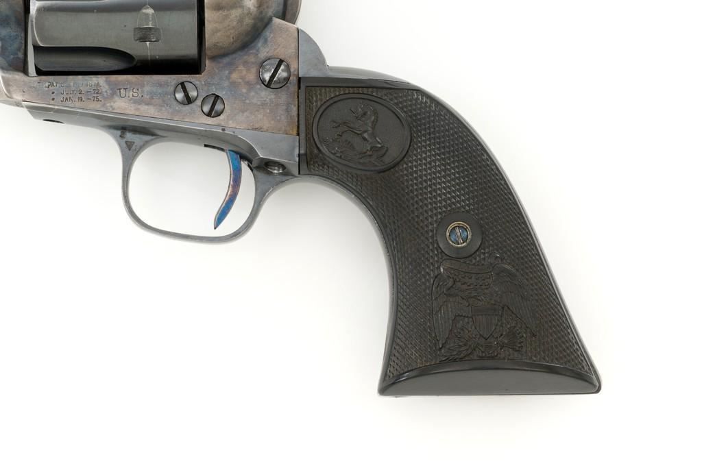 Composite Colt Single Action Army Artillery Type Revolver with D.F.C. Inspected Frame, #62245, .45 Colt cal., 5.5'' barrel, blue and case hardened finish, two-piece black hard rubber grips with Eagle and Rampant Colt logo. Standard sights include blade front and ''V''-notch rear. Lower left side of the frame is stamped ''U.S.'' with three-line patent dates, and ''D.F.C.'' inspector's mark over the frame's serial number. There is a small ''P'' on the cylinder round. No other inspector's marks visible. Top of the barrel with one-line address, and the left side is marked '''COLT SINGLE ACTION ARMY .45''. Cylinder is numbered ''7348''. ''454'' is scratched into the back of each grip and have Colt maker's marks near the lower back edge. Loading gate with assembly number ''1304''. Frame Mfg'd circa 1881, with updated barrel assembly and trigger guard/backstrap. Overall condition fine, displaying approx. 92% blue with wear at the muzzle, edges of the cylinder, and bottom edge of the backstrap. Approx. 50% muted and toning case colors remain on the frame, with areas of very mild pitting. Markings on the barrel are crisp. ''D.F.C.'' on the frame is light but legible; remaining marks on the frame are clear. Grips are excellent. Action is crisp with all four clicks. Bore rates near excellent with well-defined rifling. Est.: $2,000-$2,500. (Antique)