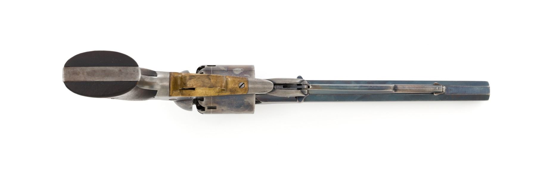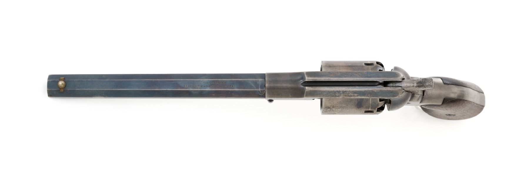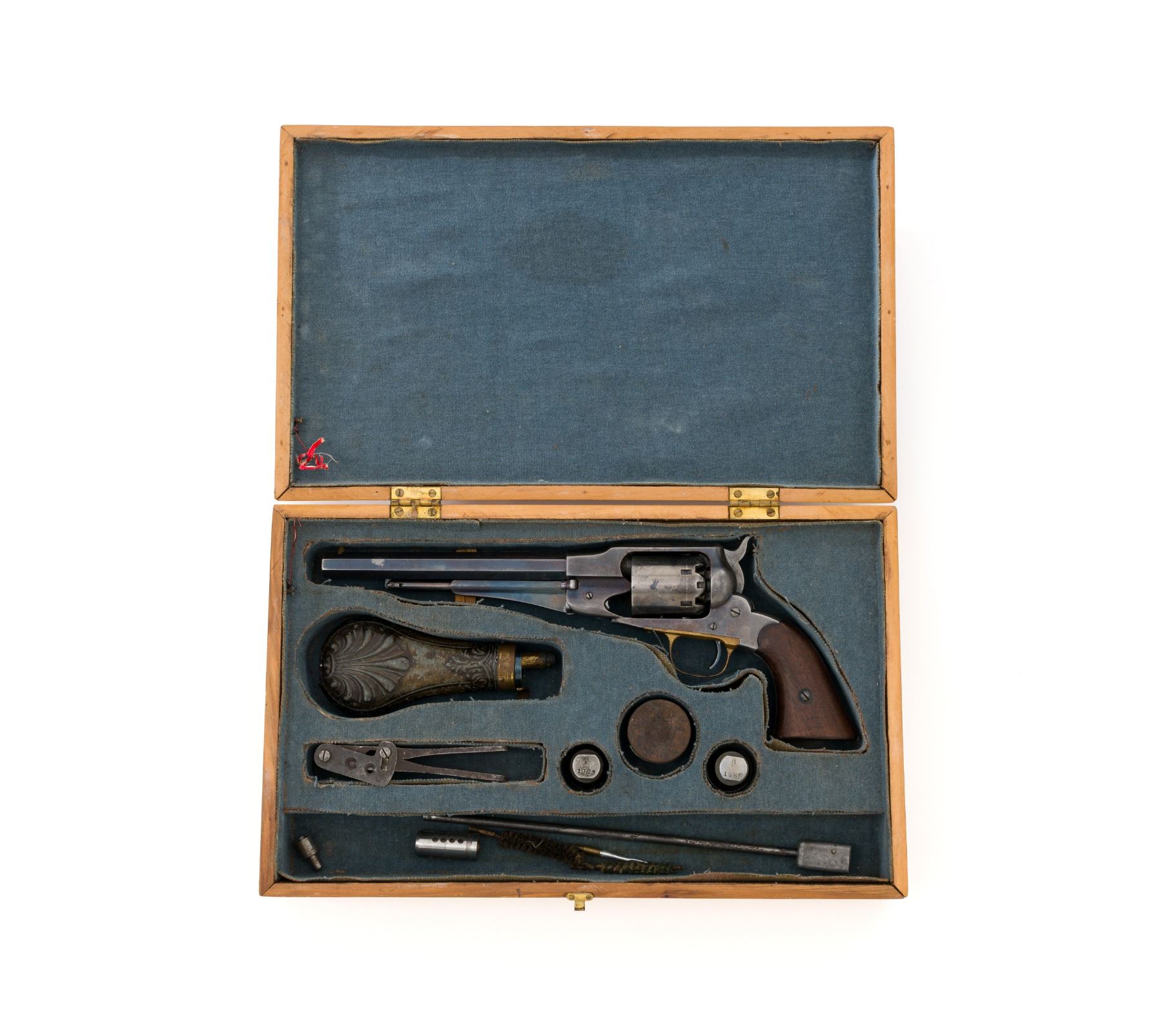 Remington Transitional New Model Army Single Action Percussion Revolver, #12612, .44 cal., 8'' octagon barrel, blued finish with brass trigger guard, two-piece smooth walnut grips, cone front sight, and small ''V''-notched rear sight. Barrel is marked in two-lines ''PATENTED SEPT. 14, 1858/E. REMINGTON & SONS. ILION NEW YORK, U.S.A.'' No ''New Model'' markings and this revolver still features some of the earlier features found on the Model 1861 revolver. There are ''S'' inspection marks on both sides of the frame, right side of the barrel, trigger guard, and cylinder round. Additionally, left side of the barrel, frame, and loading lever with ''A'' inspection mark. Left grip panel with inspector's cartouche. Matching numbers on left side of the grip frame and underside of the barrel. Back of the cylinder is marked ''1955'', ''S'', and ''B''. There are illegible markings on the back of each grip, written in pencil. It appears to someone's name. Condition is very good overall, retaining approx. 65%-70% thinning and toning blue; some of the metal has a smooth, lightly cleaned appearance. Factory markings and inspection marks on the metal are mostly legible, with a few spots of the barrel address being worn and illegible. Grips show moderate age and handling wear; cartouche is clearly present but worn and partially legible. Action is crisp and cycles smoothly. Bore is fine, mostly bright, with clearly defined rifling. Includes a nice customized later production hardwood compartmentalized case, holding the revolver, shell-designed brass powder flask, unmarked iron two-cavity bullet mold (.44 caliber), two iron oilers, an ELEY cap tin plus a bag full of lead bullets, misc. small parts, and cleaning tools. All are in good to very good condition. Exterior of the case with scratches to the lid. Est.: $1,500-$2,000. (Antique)(Michael Strietbeck Collection)