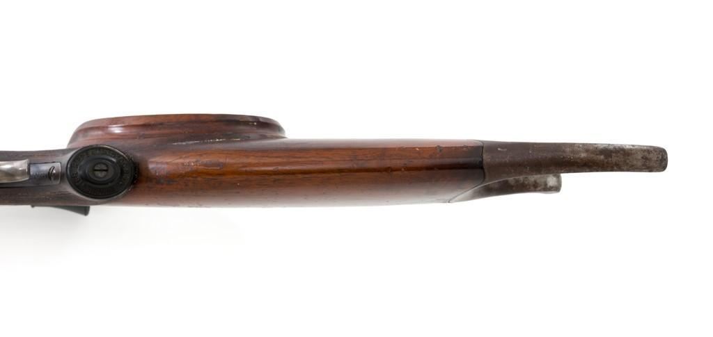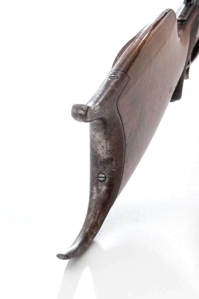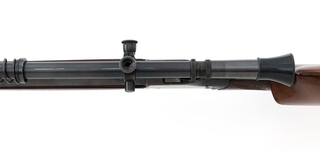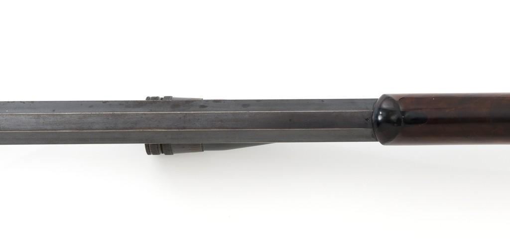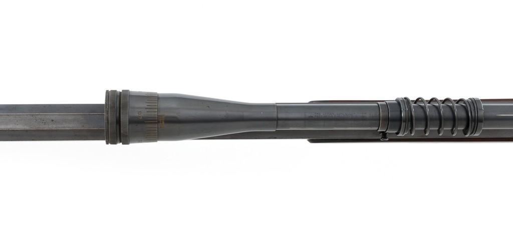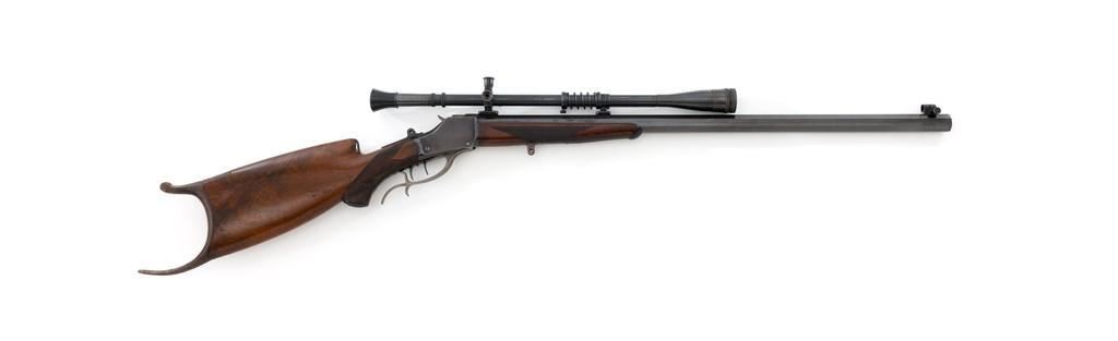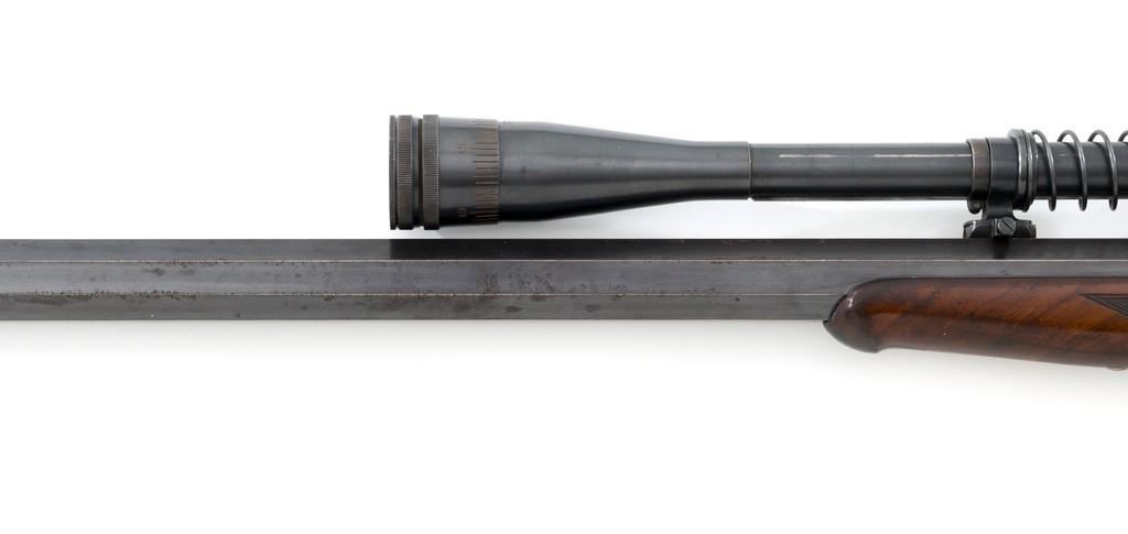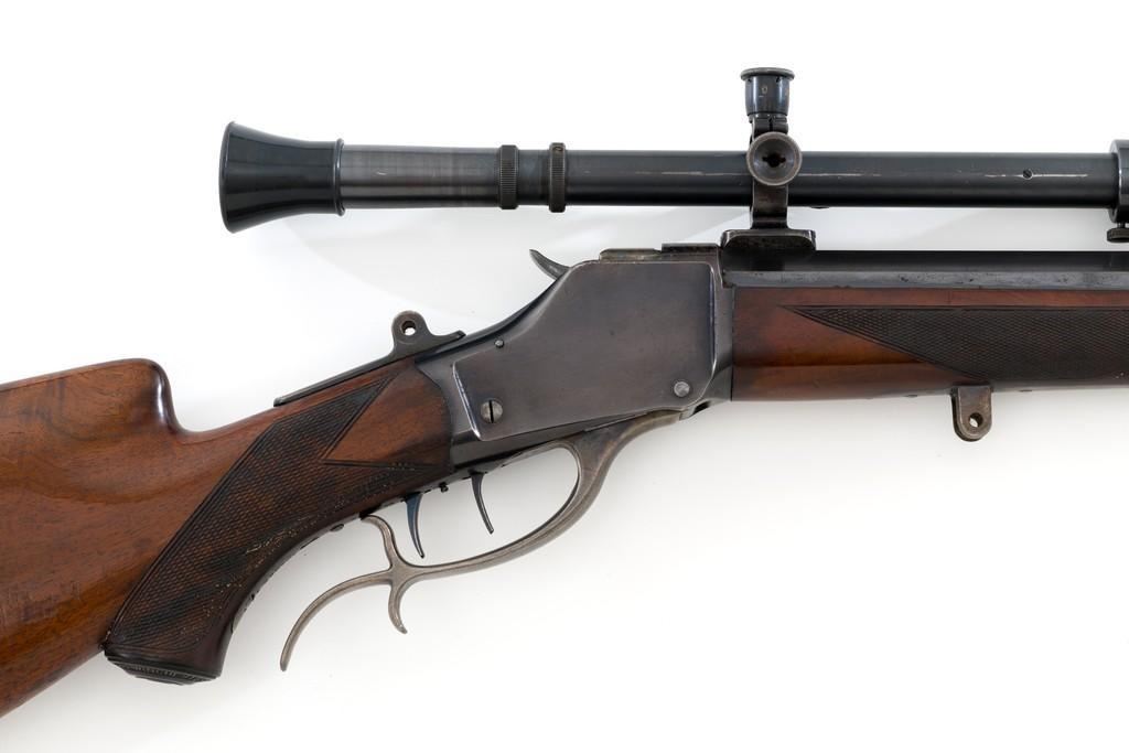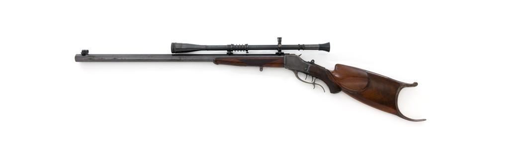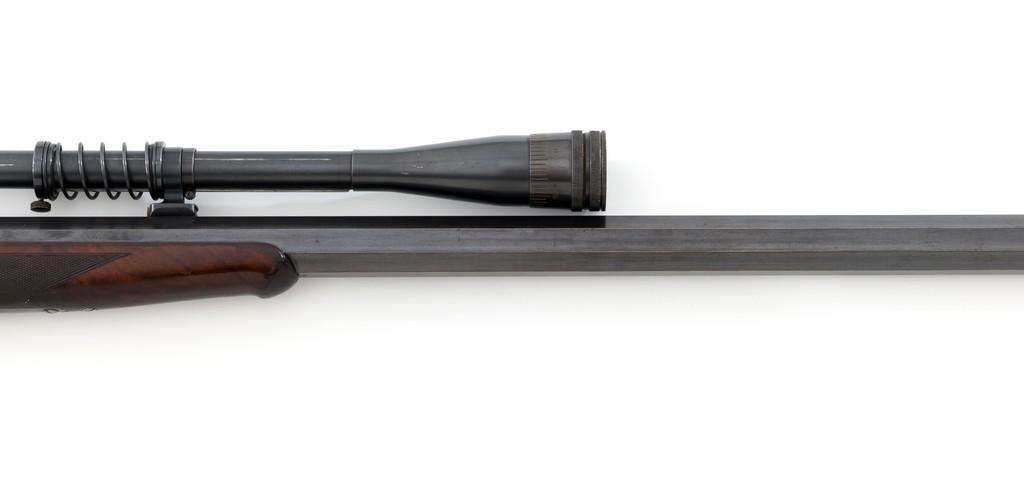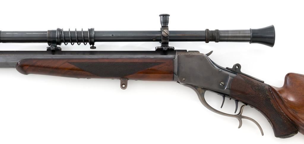 Deluxe Special Order Winchester Model 1885 High Wall Falling Block Single Shot Target Rifle, #104852, .32-40 Win. cal., 30'' heavy octagon barrel, blue finish; finely checkered deluxe walnut stock with a Schnabel forend, exaggerated trigger guard, and Swiss style Schuetzen buttplate, providing a 12.75'' LOP to the front trigger. Rifle also features an unmarked globe front sight, rear sight has been removed, double set-triggers, and aperture sight base on the tang. Factory markings are clear with Winchester ''WP'' proof on the receiver. Rifle is topped with two sight bases, rings (rear is adjustable), and a Lyman Targetspot 8x fixed power rifle scope with an adjustable objective, blue finish, threaded lens covers, rubber eye cup, and fine crosshair reticle. Scope is in fine condition, showing moderate age and wear, optics are clear. Mfg'd 1907. Rifle is in fine overall condition, retaining approx. 92%-94% blue, with wear and fine pinprick pitting at the muzzle, few intermittent spots of erosion and patina across the barrel; edges are sharp. Receiver shows moderate edgewear, light erosion and surface rust on the top in front of the breechblock and top left edge. Lever shows muted color case hardened finish with twin finger rests. Stock is in fine condition with scattered impressions and indentations consistent with range use, displaying attractive figure and an exaggerated beaded cheekpiece. Buttplate has drifted to brown patina with age. Action functions well and locks up securely. Bore is fine with well-defined rifling. Est.: $2,000-$3,000. (C&R/PPT)