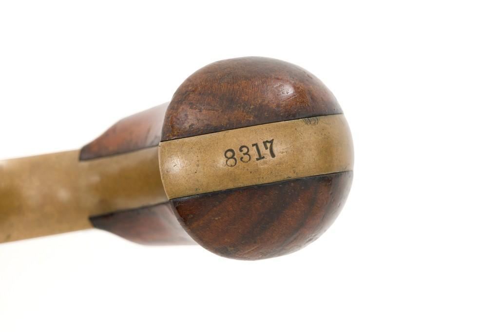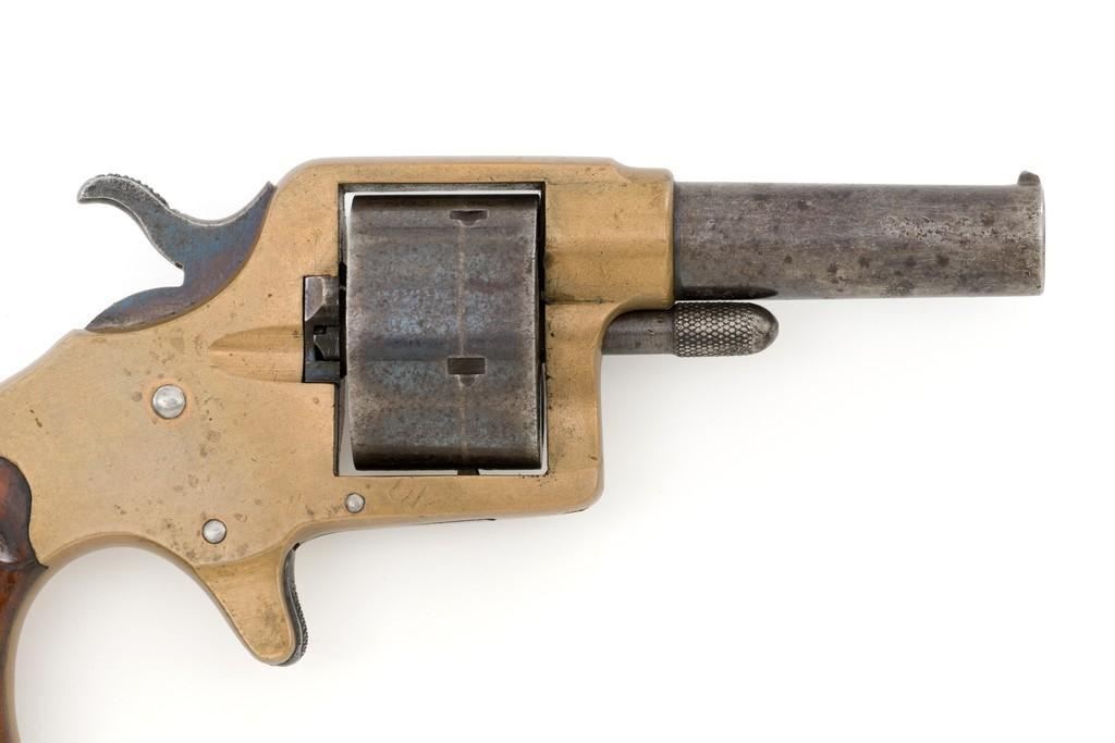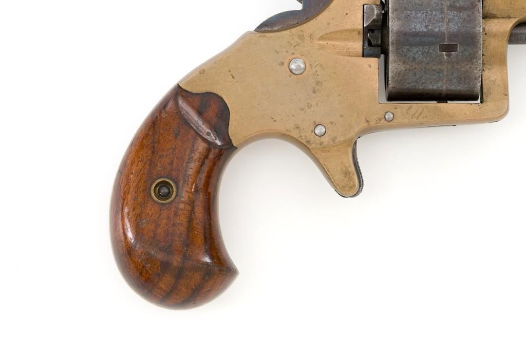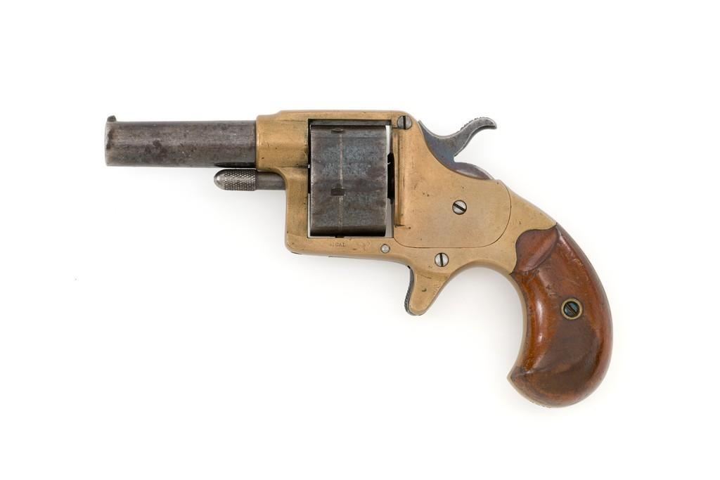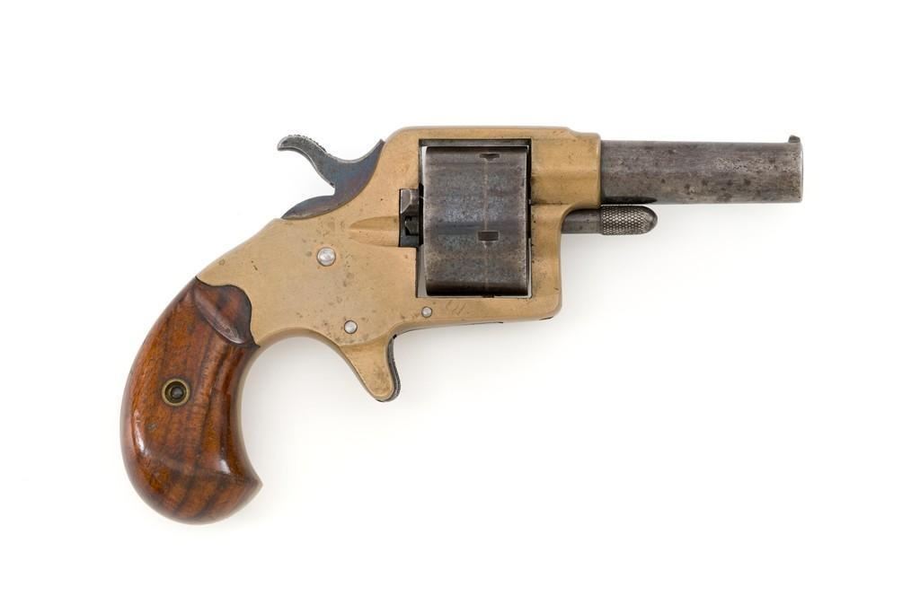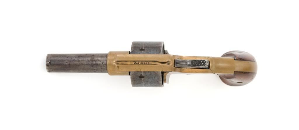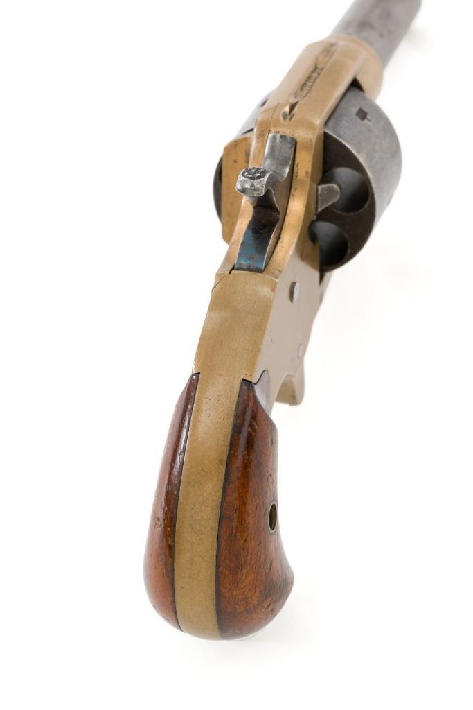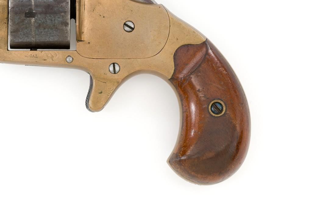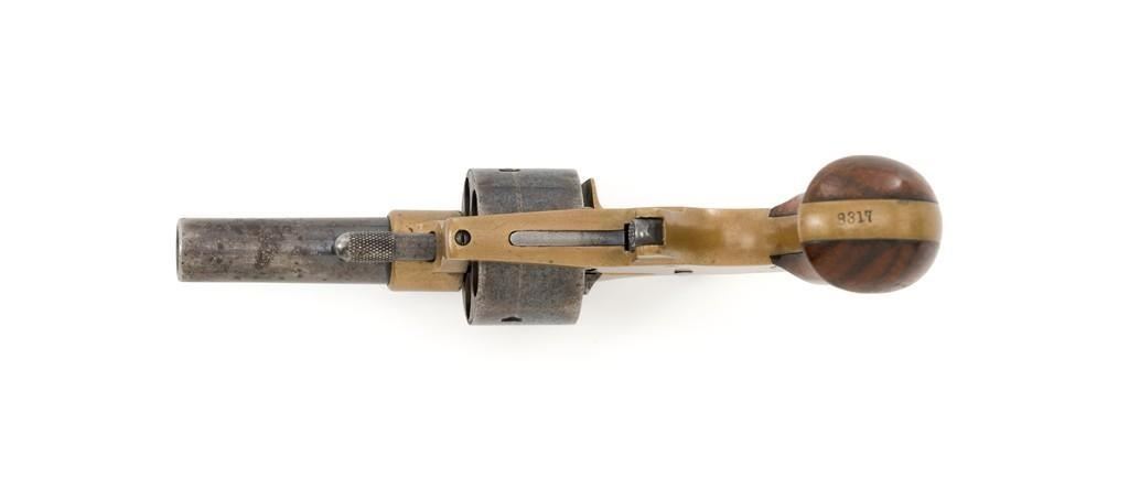 Colt House Model Cloverleaf Five-Shot Revolver, #8317, .41 RF cal., 2.6'' round barrel, blued finish, brass frame, smooth walnut grips, 5-shot round cylinder, blade front and fixed ''V''-notch rear sight. Mfg'd 1875. Revolver is in overall very good condition, displaying a combination of toning blue finish and patina to the iron surfaces. Brass frame with pleasing even patina. Grips are near fine, showing moderate age and handling wear; majority of their rich oil finish remains. Factory markings are clear. Action is strong. Bore rate good with defined rifling and scattered light erosion. Est.: $700-$900. (Antique)