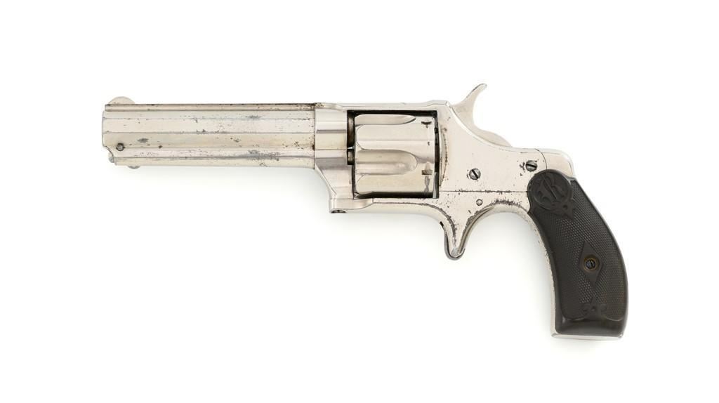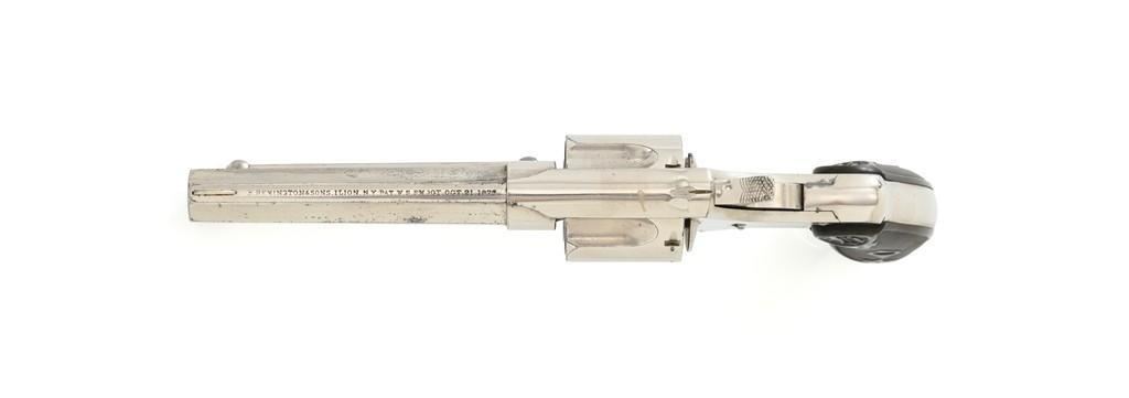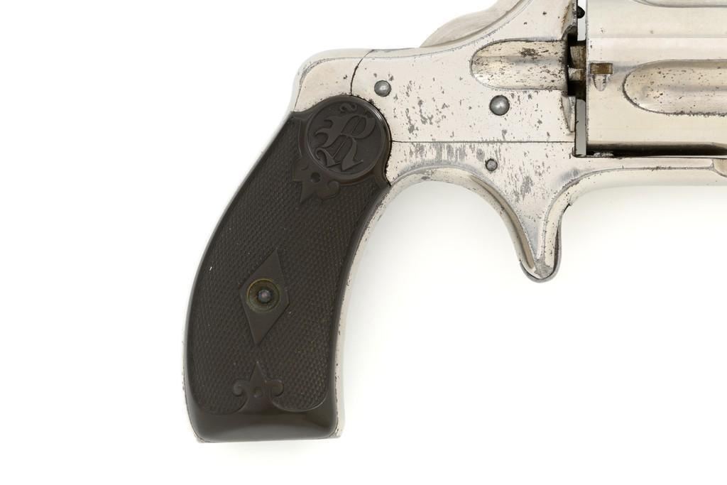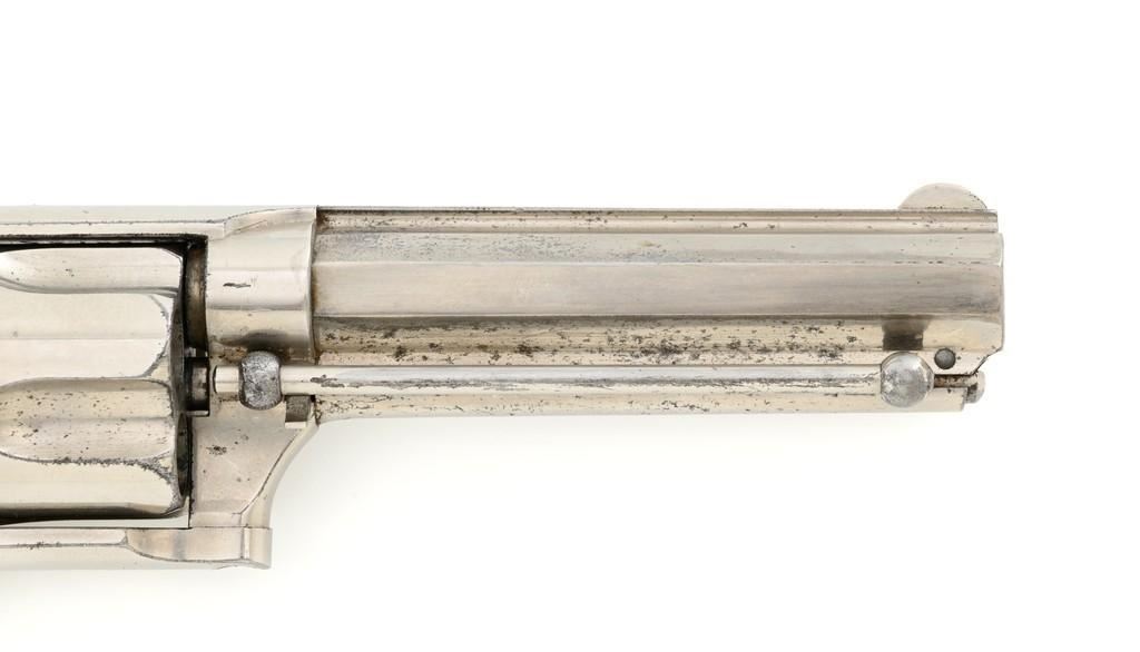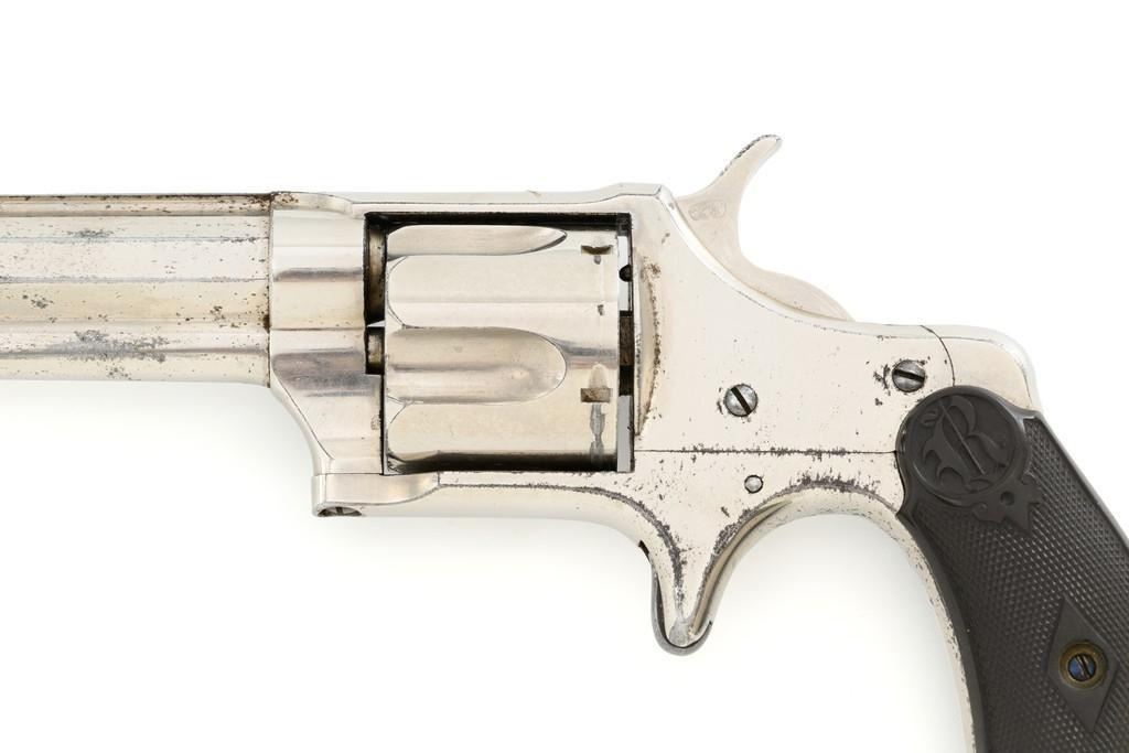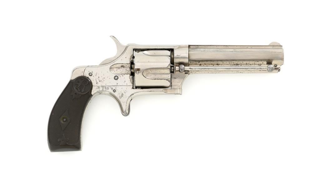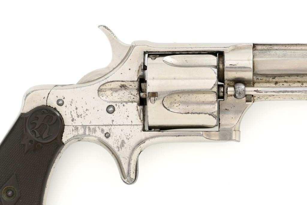 Remington-Smoot New Model No. 3 ''Saw Handle'' Revolver, #NVSN, .38 Short CF cal., 3.75'' octagon barrel, nickel finish, two-piece black checkered hard rubber grips with ''R'' monogram, fixed half-moon blade front sight, and small notched rear sight. Top of the barrel is marked in one-line ''E. REMINGTON & SONS. ILION, N.Y. PAT. W.S. SMOOT OCT. 21, 1873.'' Approx. 6,000 were manufactured with the saw-handle grip. Revolver is in fine condition, retaining approx. 95% of its original nickel finish. Factory markings are clear. Grips are excellent. Action is crisp and cycles smoothly. Bore is very good with scattered light erosion, rifling is clear. Est.: $600-$800. (Antique)(Michael Strietbeck Collection)